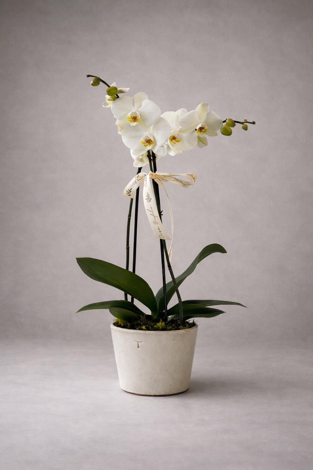 Una orquídea blanca de dos varas sobre maceta de Trinitate.