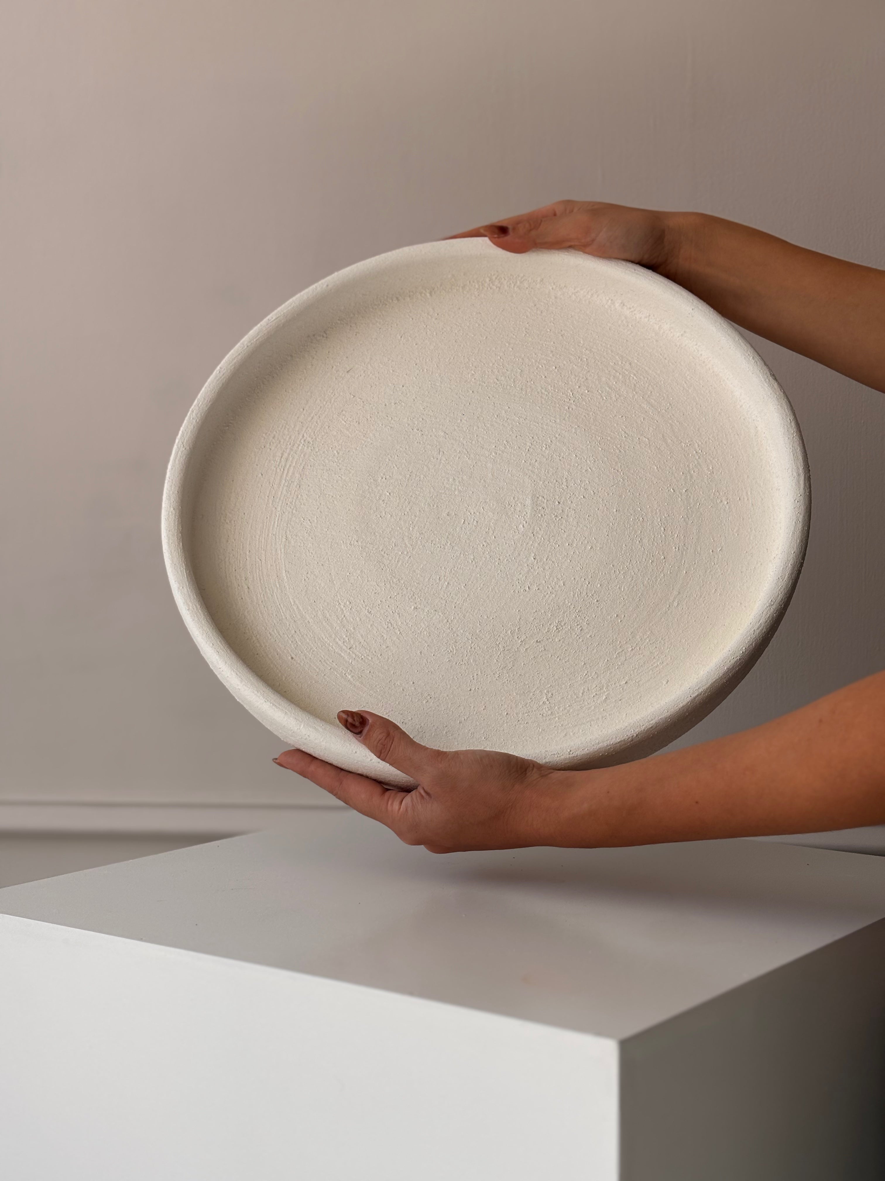 Bandeja decorativa elaborada en barro artesanal de tono beige.