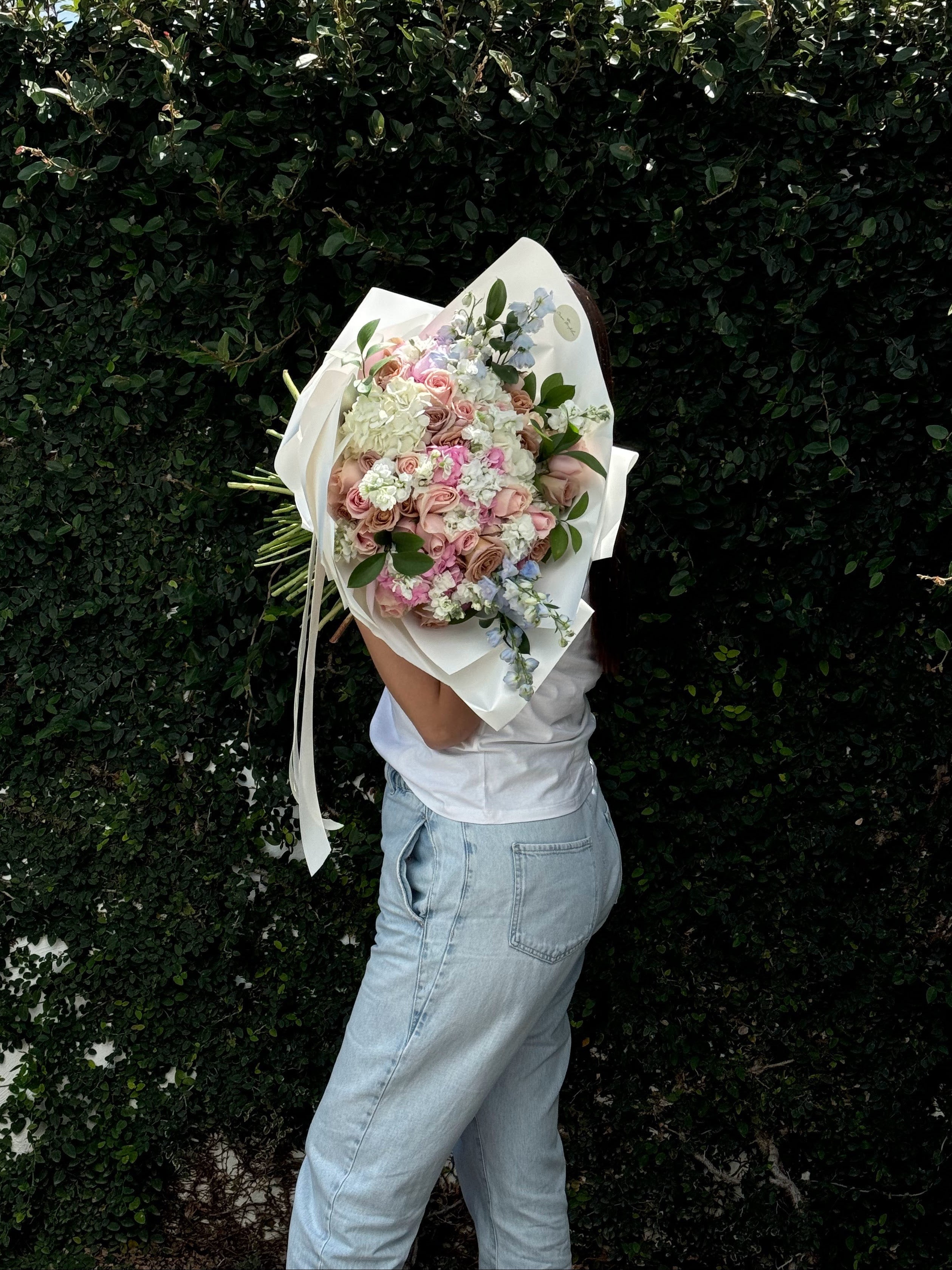 Este arreglo lleno de rosas, hortensias y mathiola es creado para celebrar la vida con un estallido de flores que se sienten festivas, luminosas y envolventes. Una composición que abraza colores delicados, perfecta para festejar a lo grande y hacer de su día un momento aún más especial.