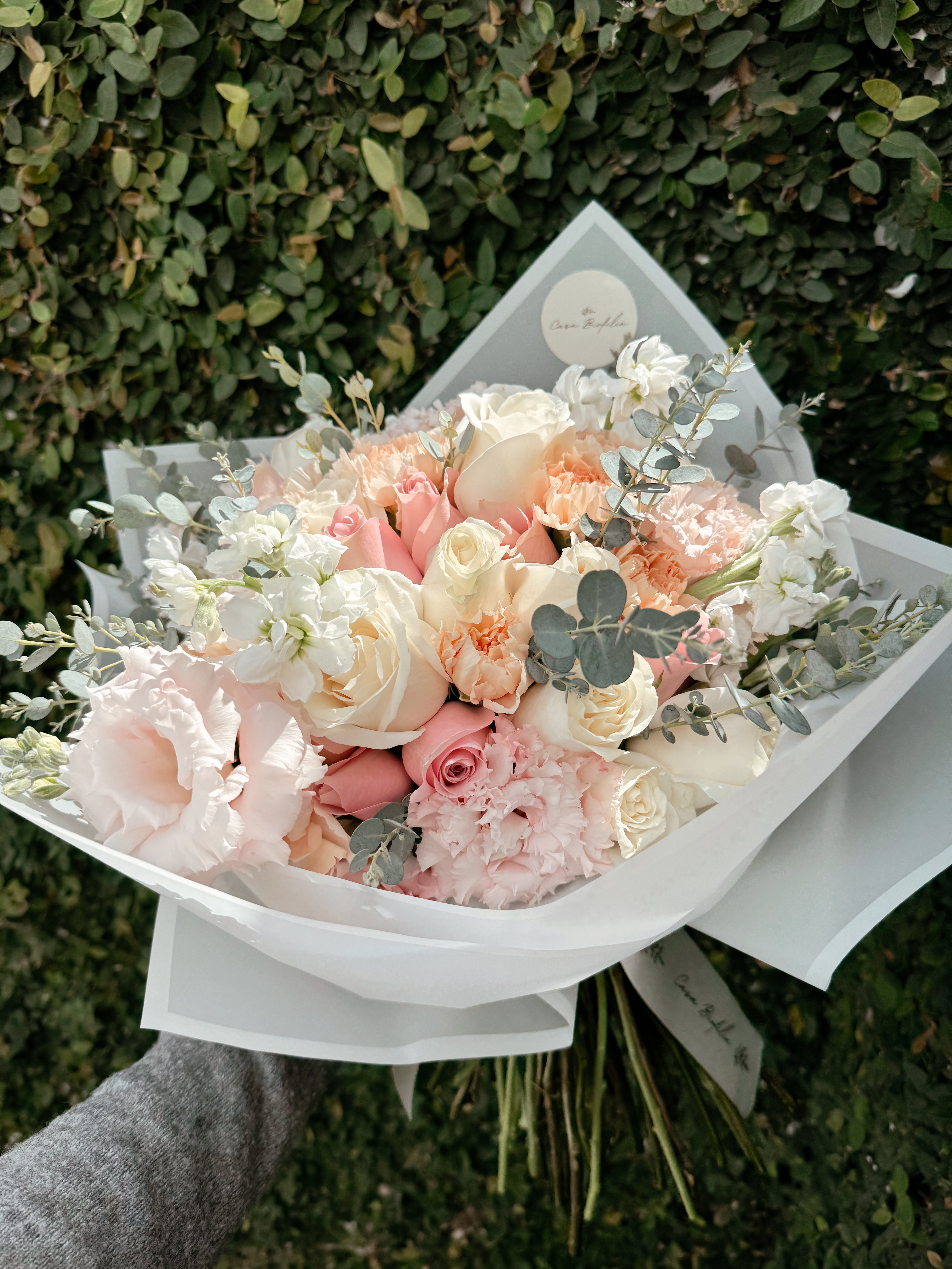 Bridey nació como un detalle pensado para quienes están por vivir un día muy especial, pero su encanto va mucho más allá. Este atado, elaborado con lisianthus, rosas y matthiola, es perfecto para sorprender a cualquier persona y hacerla sentir única en cualquier ocasión.