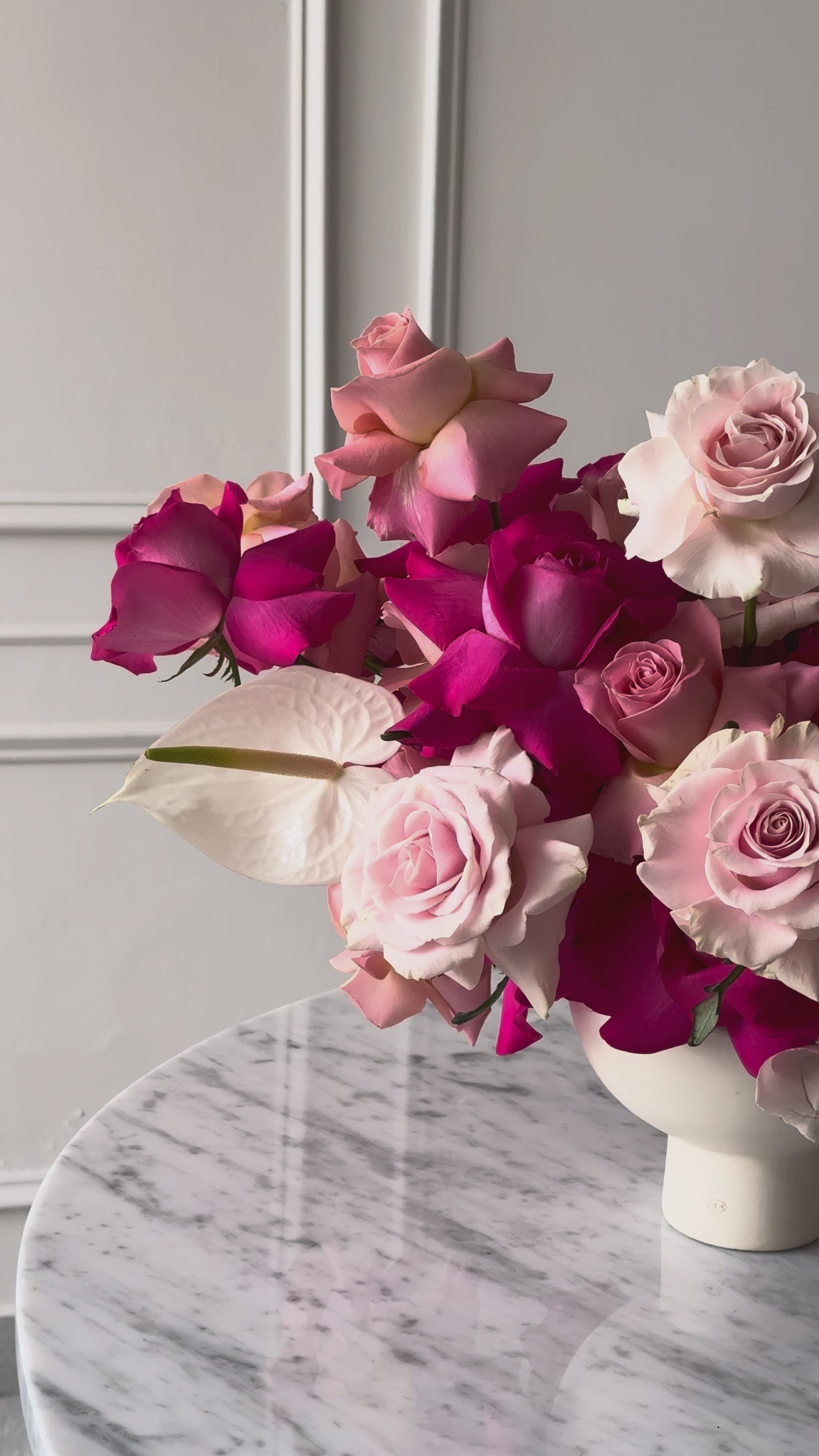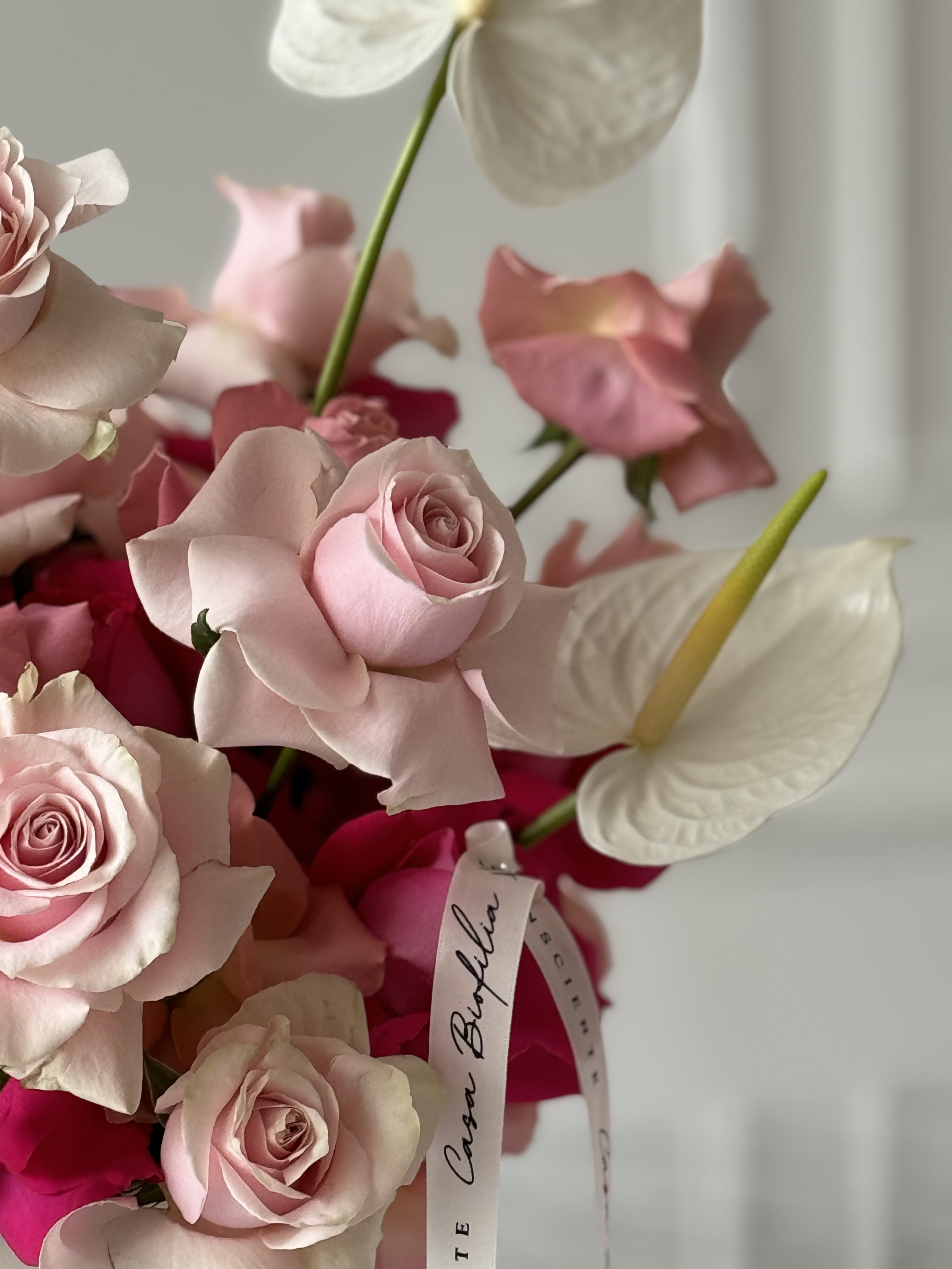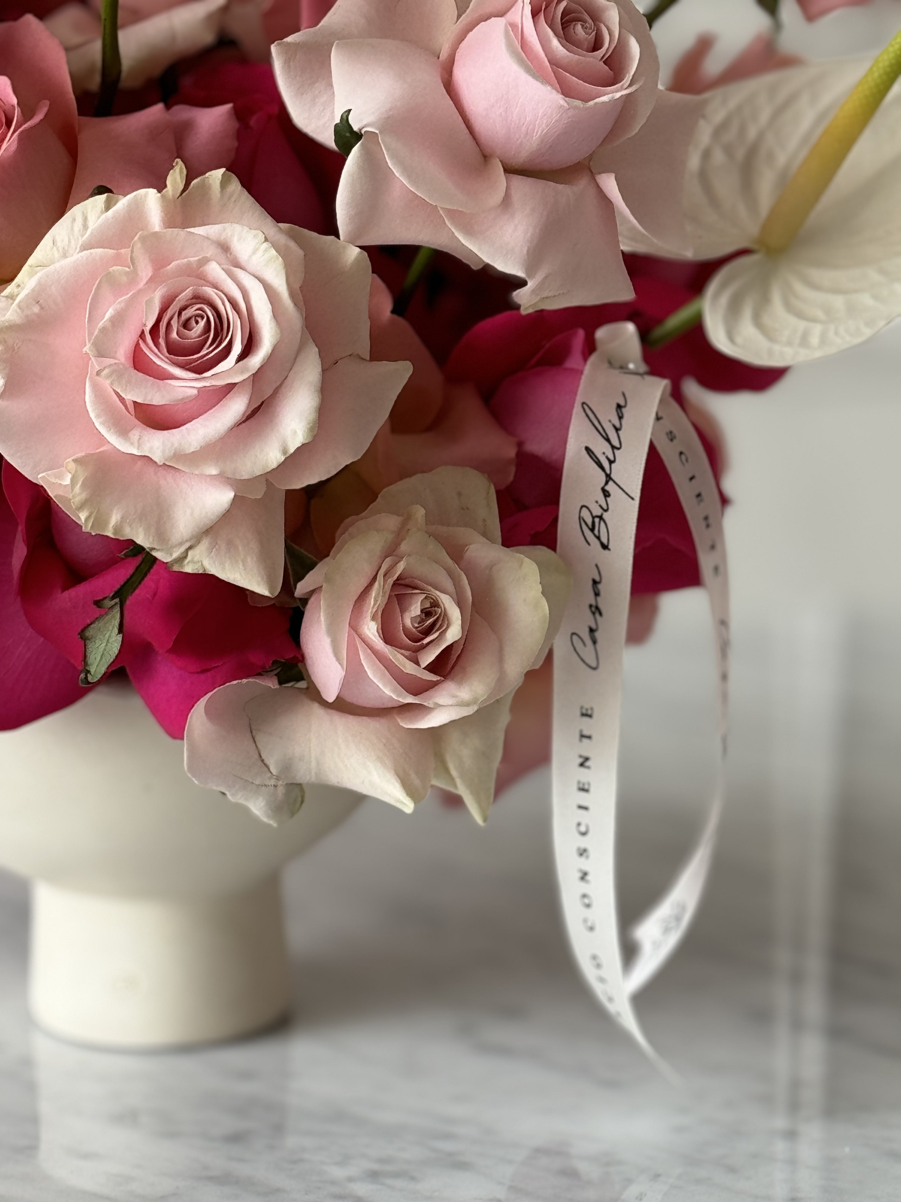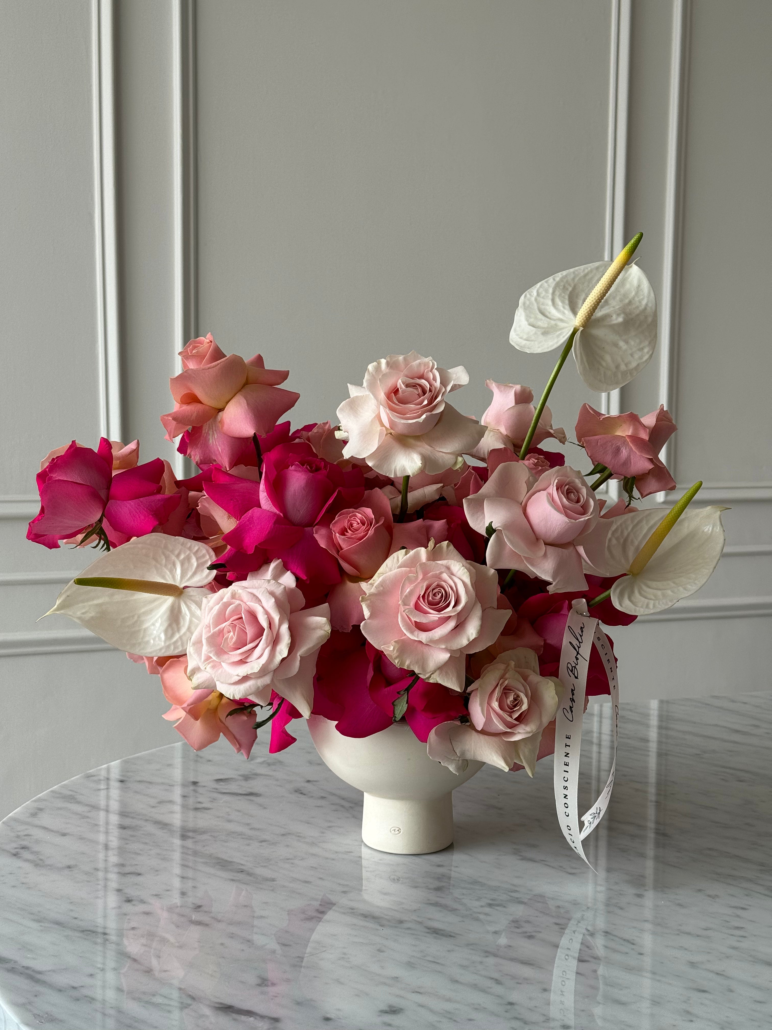 Este elegante en base de cáliz de cerámica, compuesto por rosas trabajadas con nuestra técnica especial acompañado de finos anturios que complementan su presencia. Un arreglo perfecto para realzar cualquier ocasión con un toque clásico y refinado.