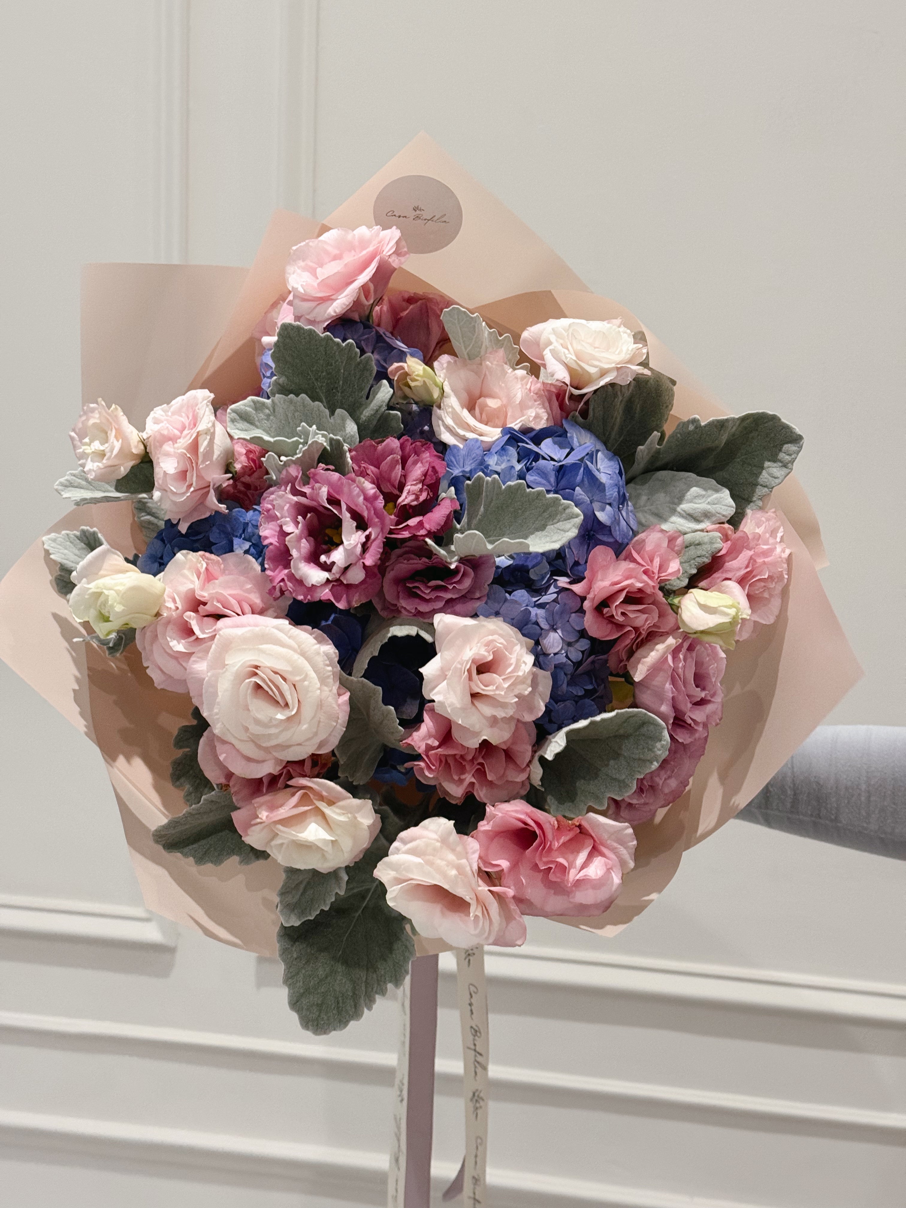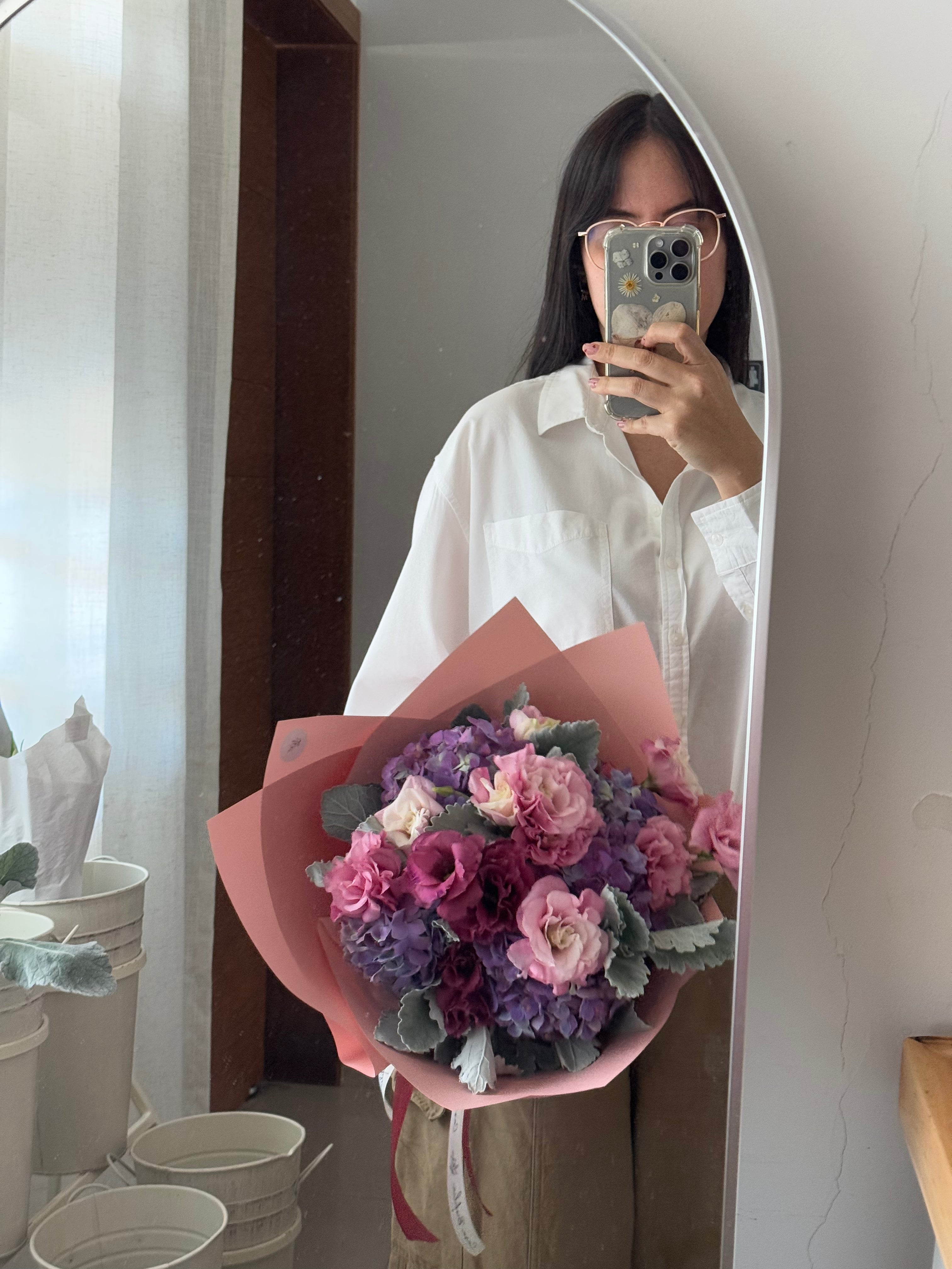 “Calm” es un atado con lisianthus rosados sobre una suave cama de hortensias, creado para traer un respiro y un toque de calma incluso en medio del caos.