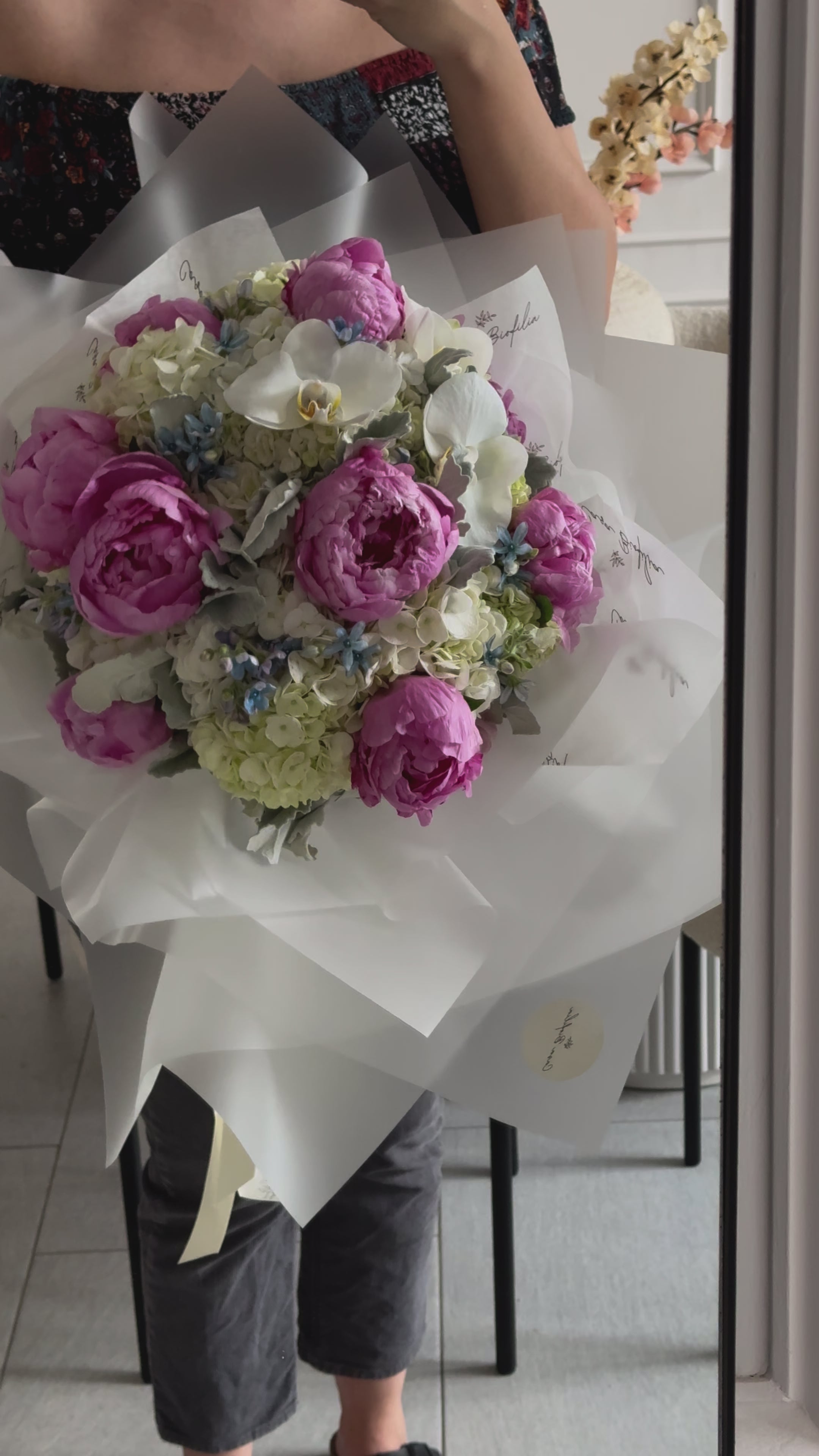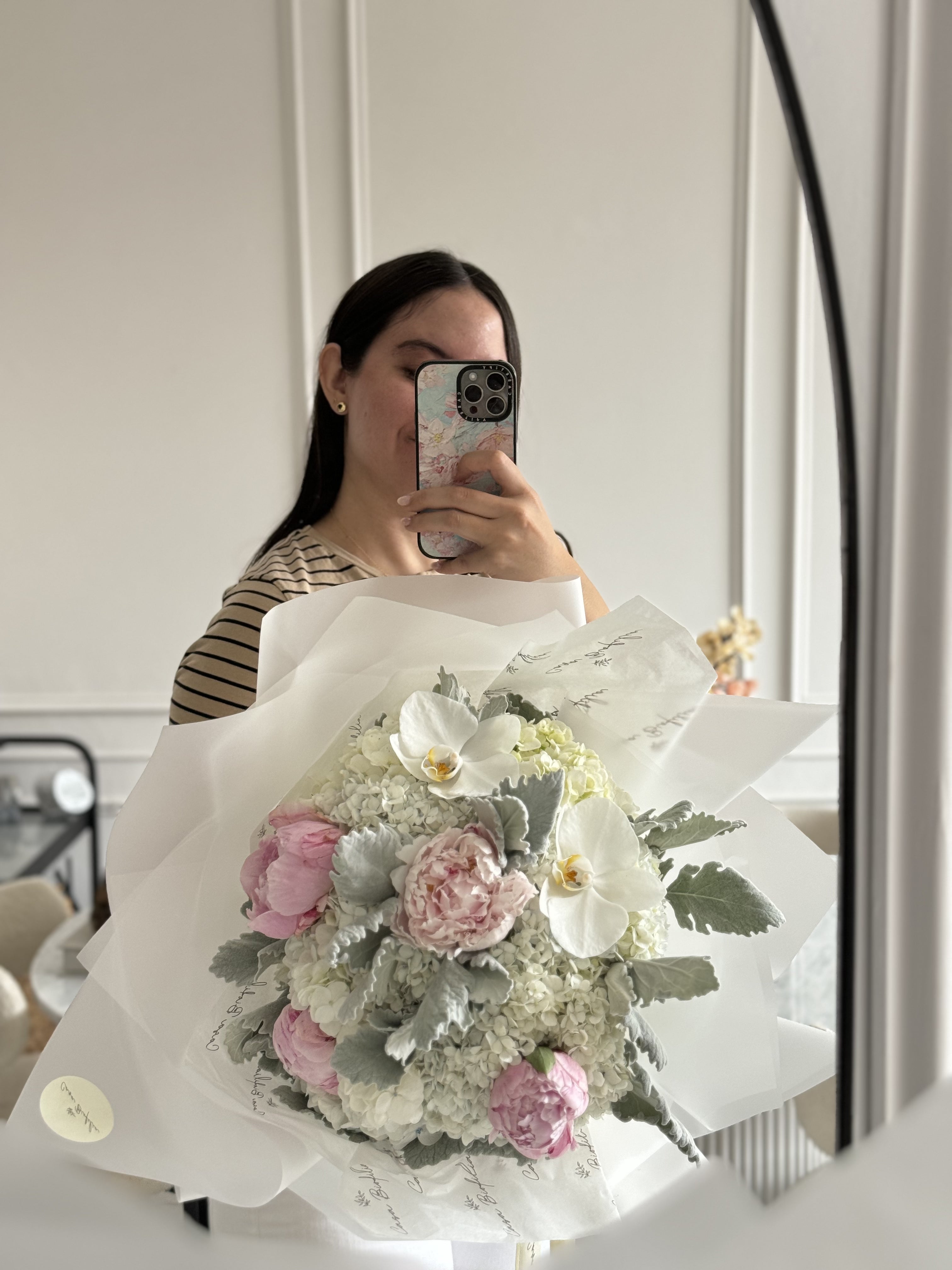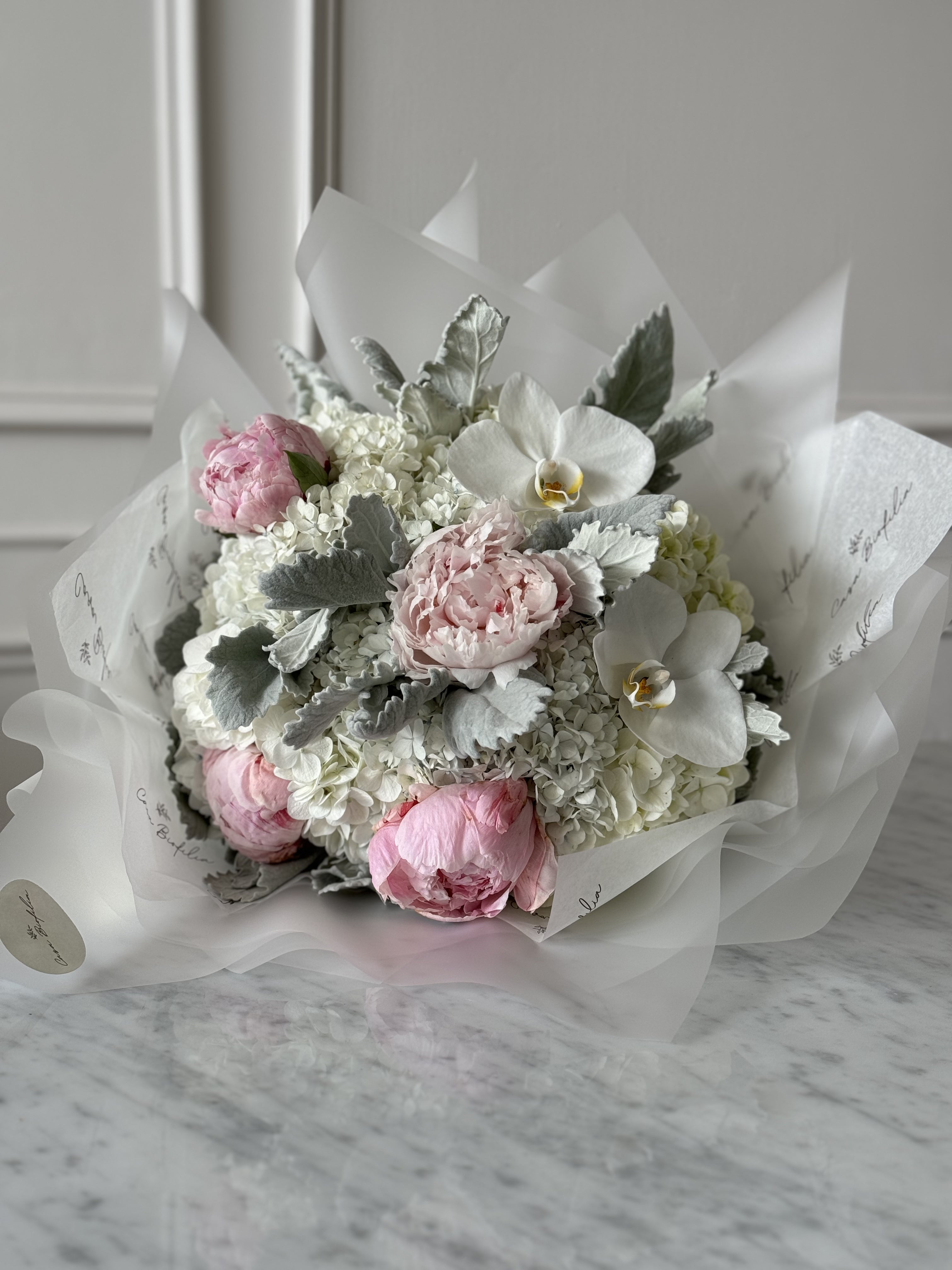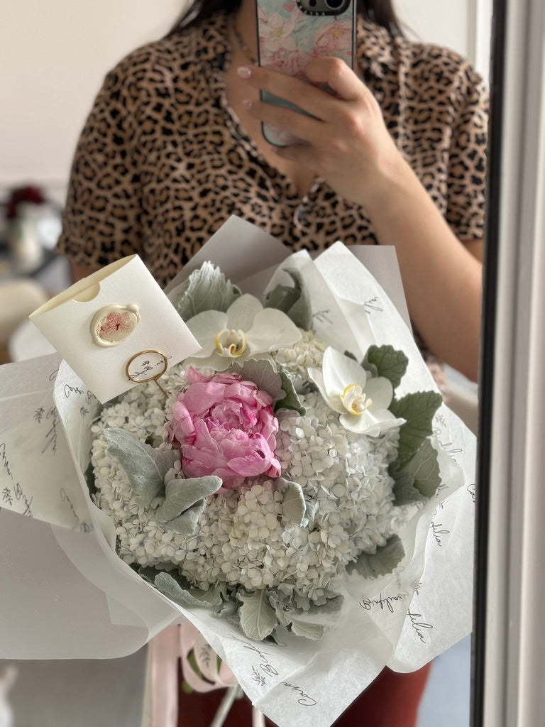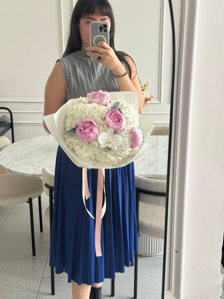 Este atado combina la elegancia de las peonias —en la cantidad que tú elijas— con la frescura de las hortensias y el encanto exótico de las orquídeas, creando un ramo sofisticado y lleno de vida, ideal para ocasiones especiales.