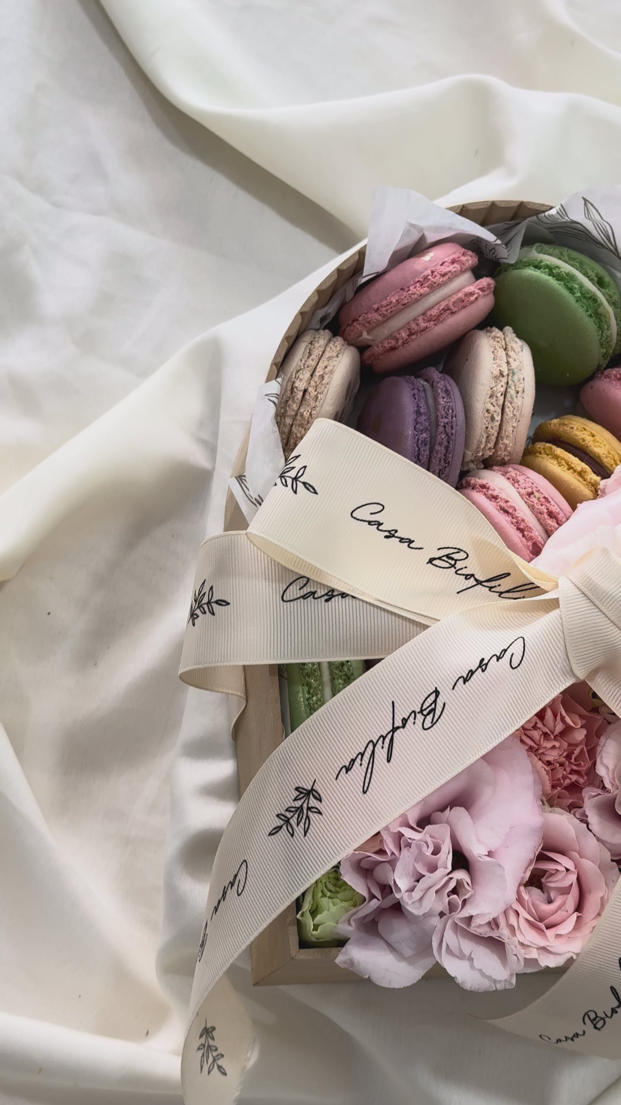 Esta encantadora caja en forma de corazón combina un mix de flores de temporada con macarons, creando el detalle perfecto para dar un dulce recuerdo.