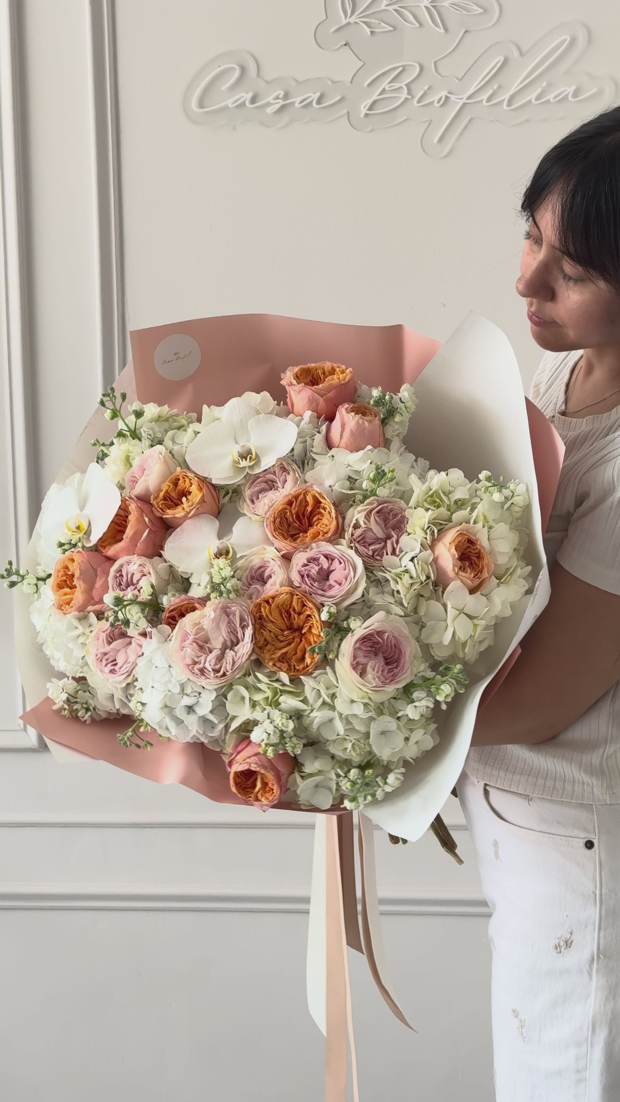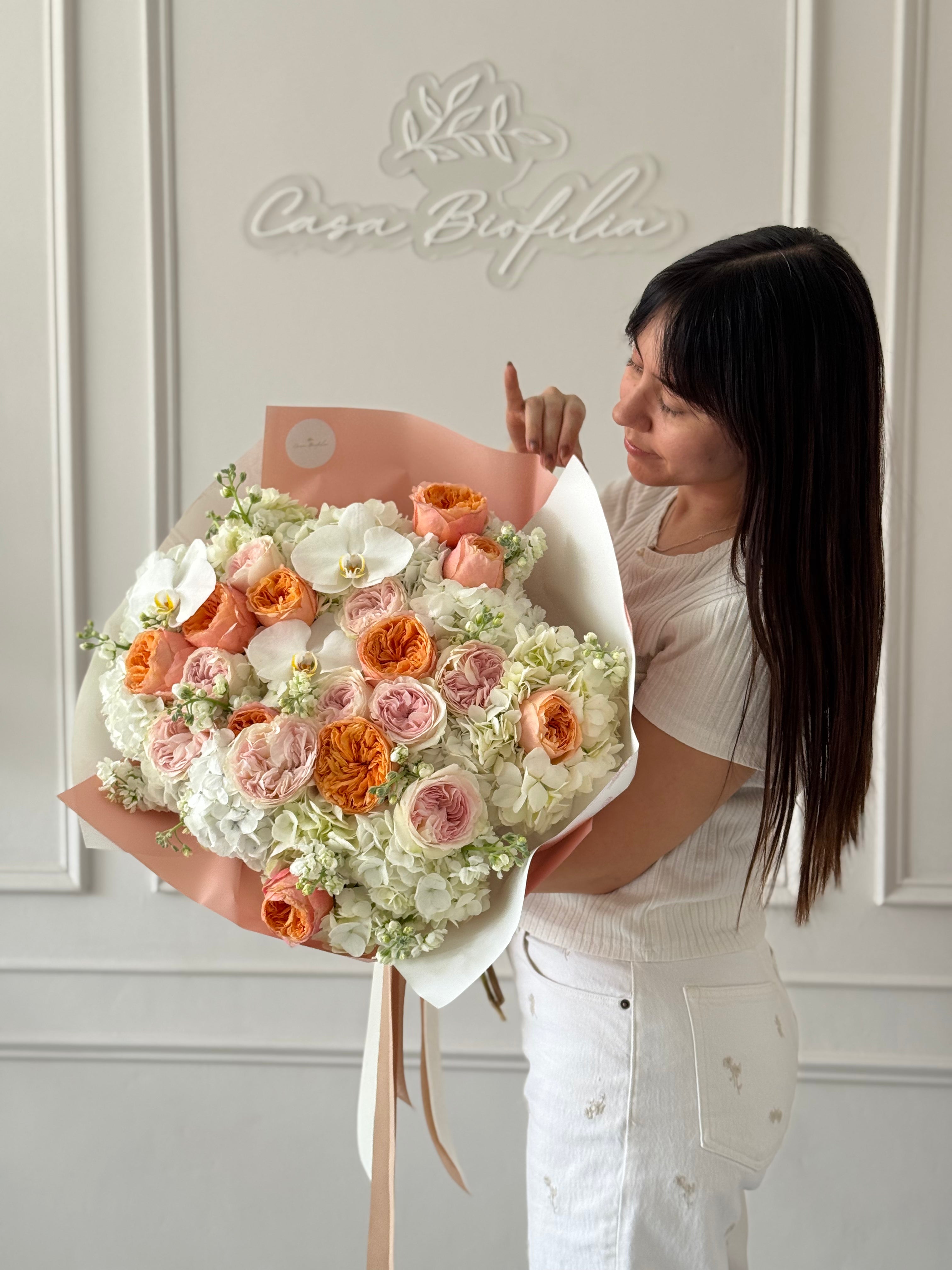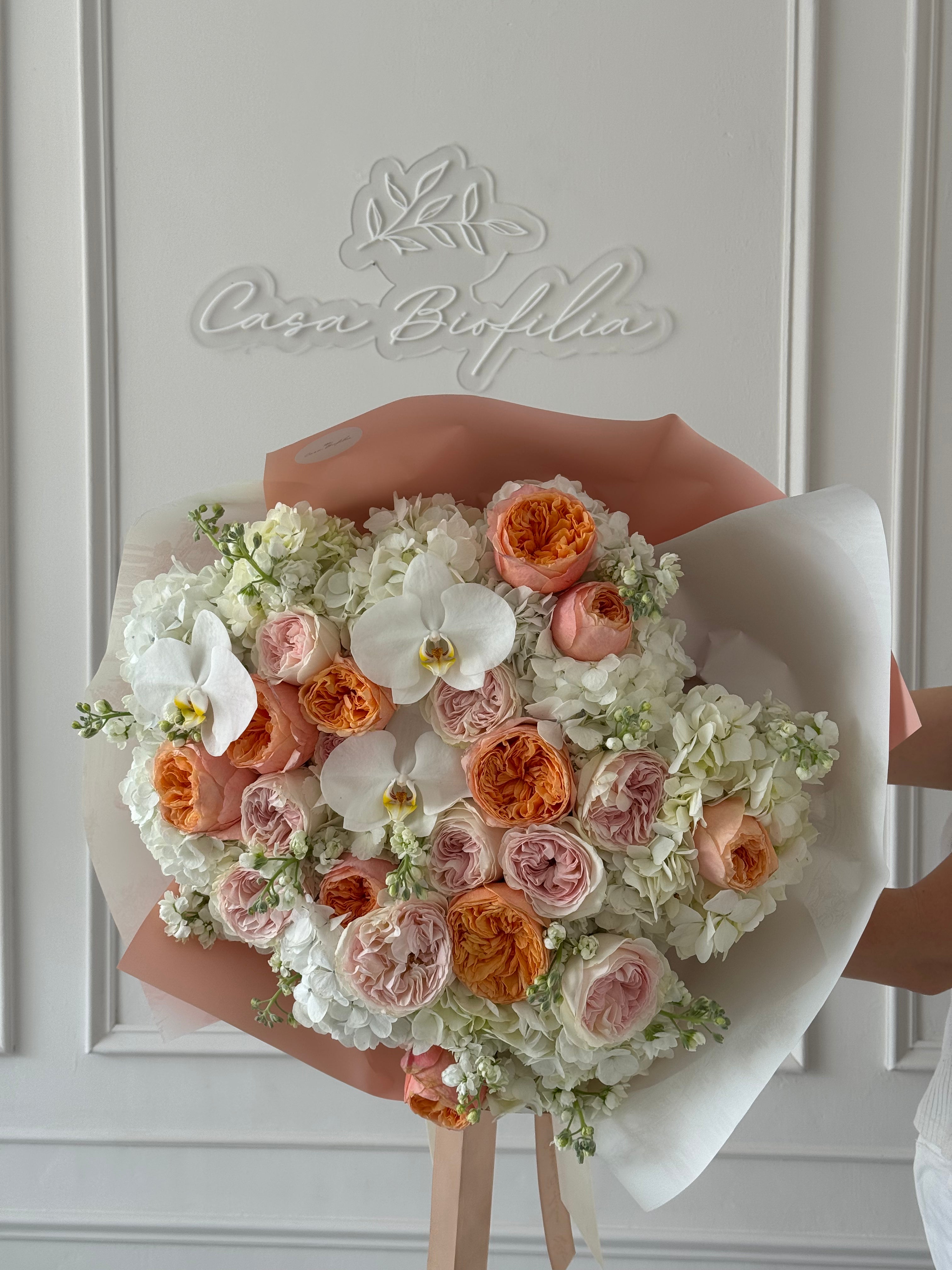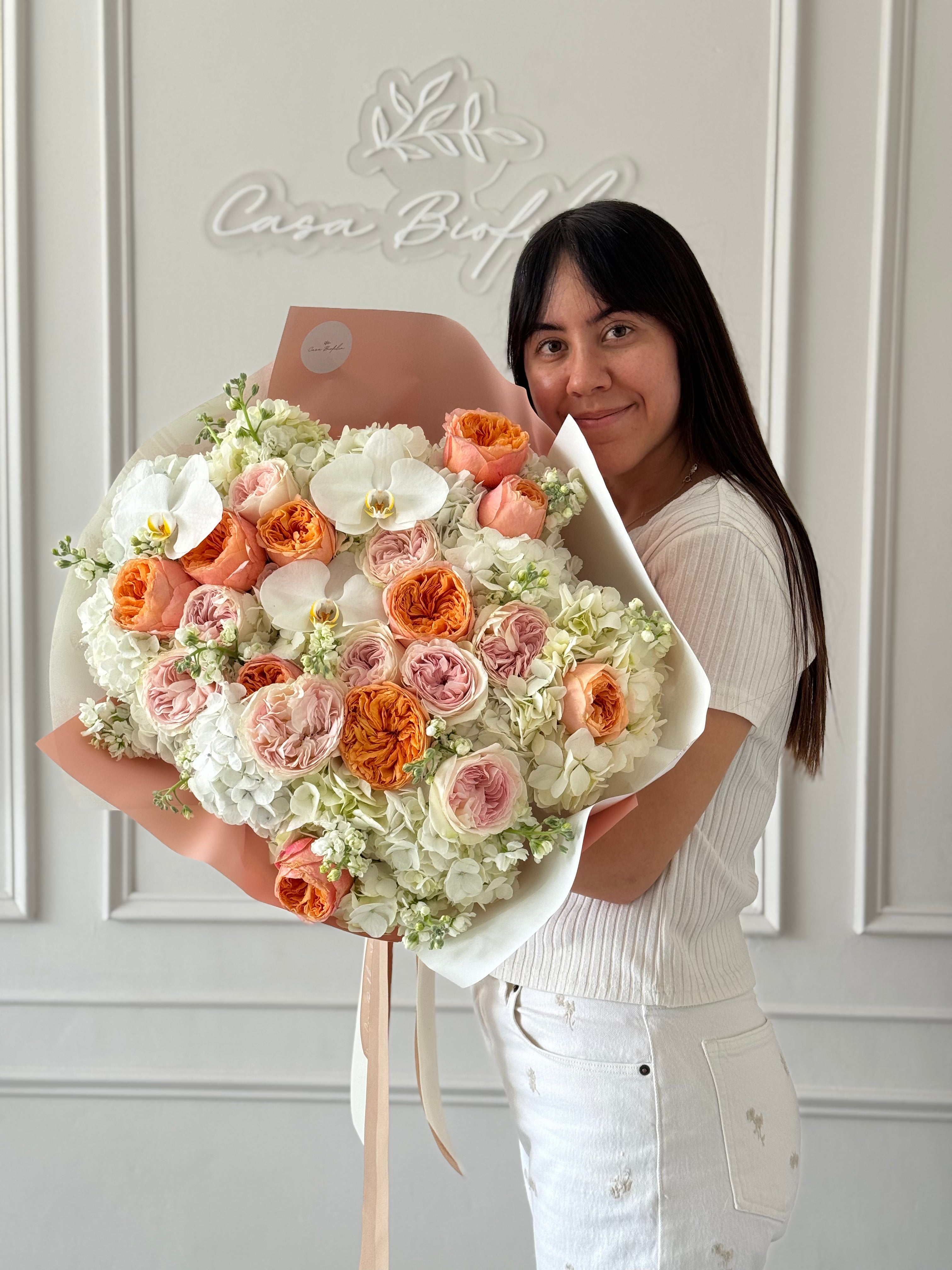 Atado de rosa inglesa, rosas, hortensias y orquídeas, creado para lucir imponente y delicado a la vez. Una composición elegante y llena de presencia, pensada para quien merece sentirse querida.