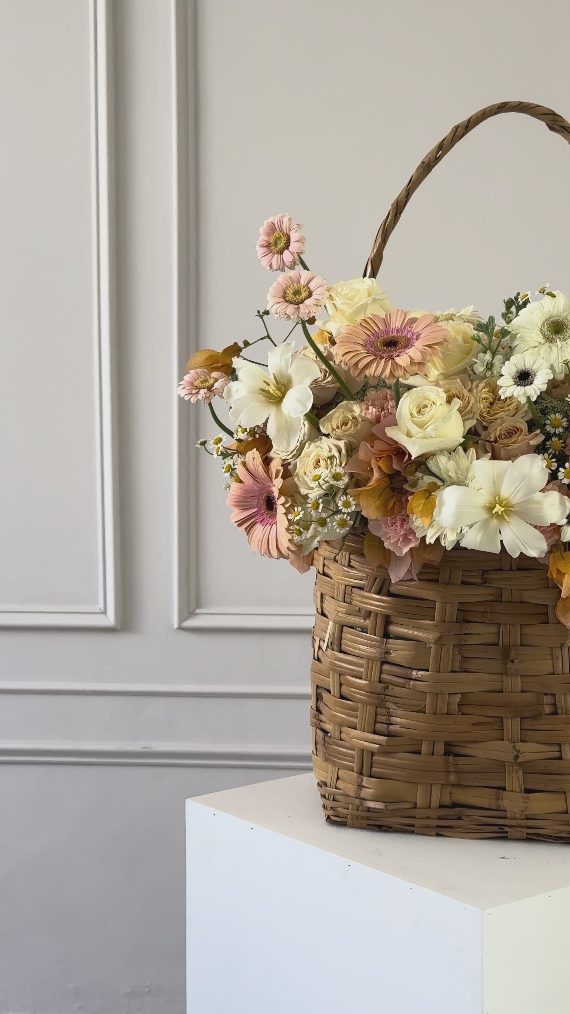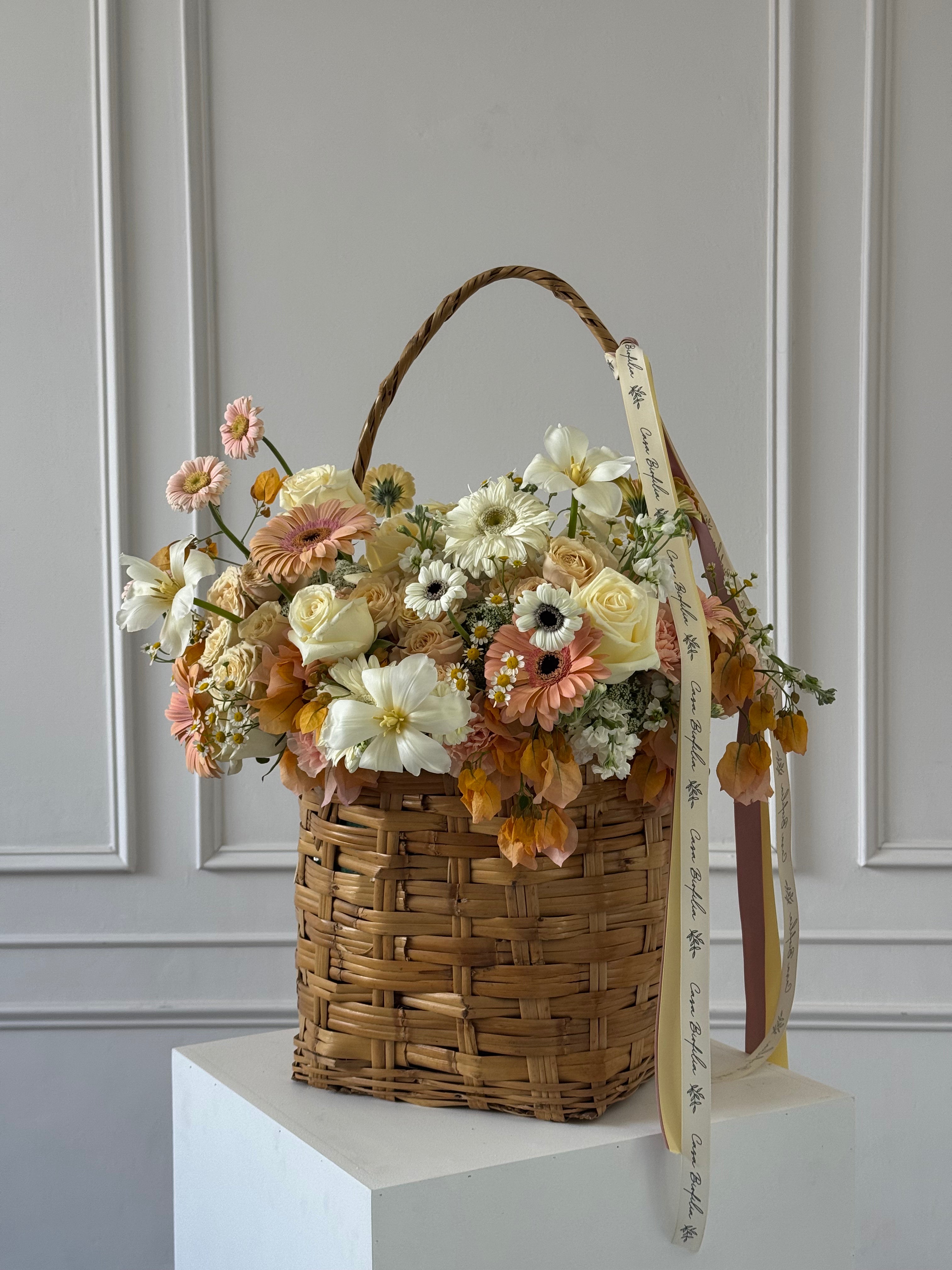 Canasta de gerberas, tulipanes, rosas y más, perfecto para celebrar a alguien que merece un amor igual de grande.