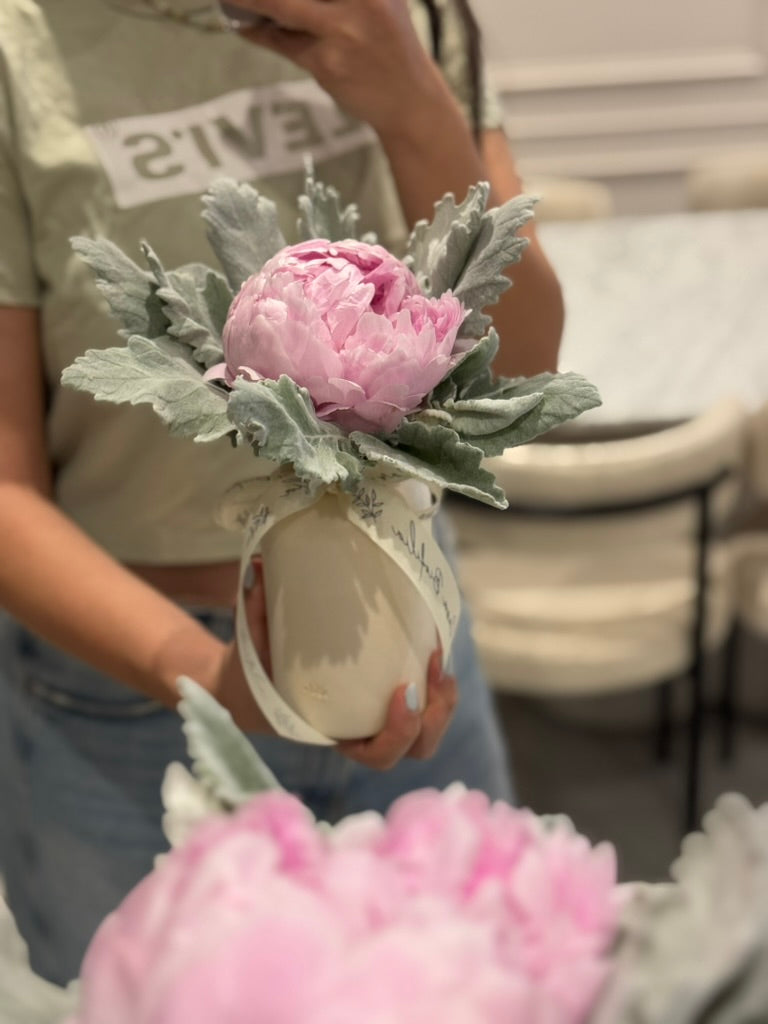 Arreglo en florero de cerámica de 9x14cm con diseño en forma de píldora. Personalízalo con 1 a 5 peonias en tono rosa pastel, creando un detalle moderno y sofisticado a tu medida.