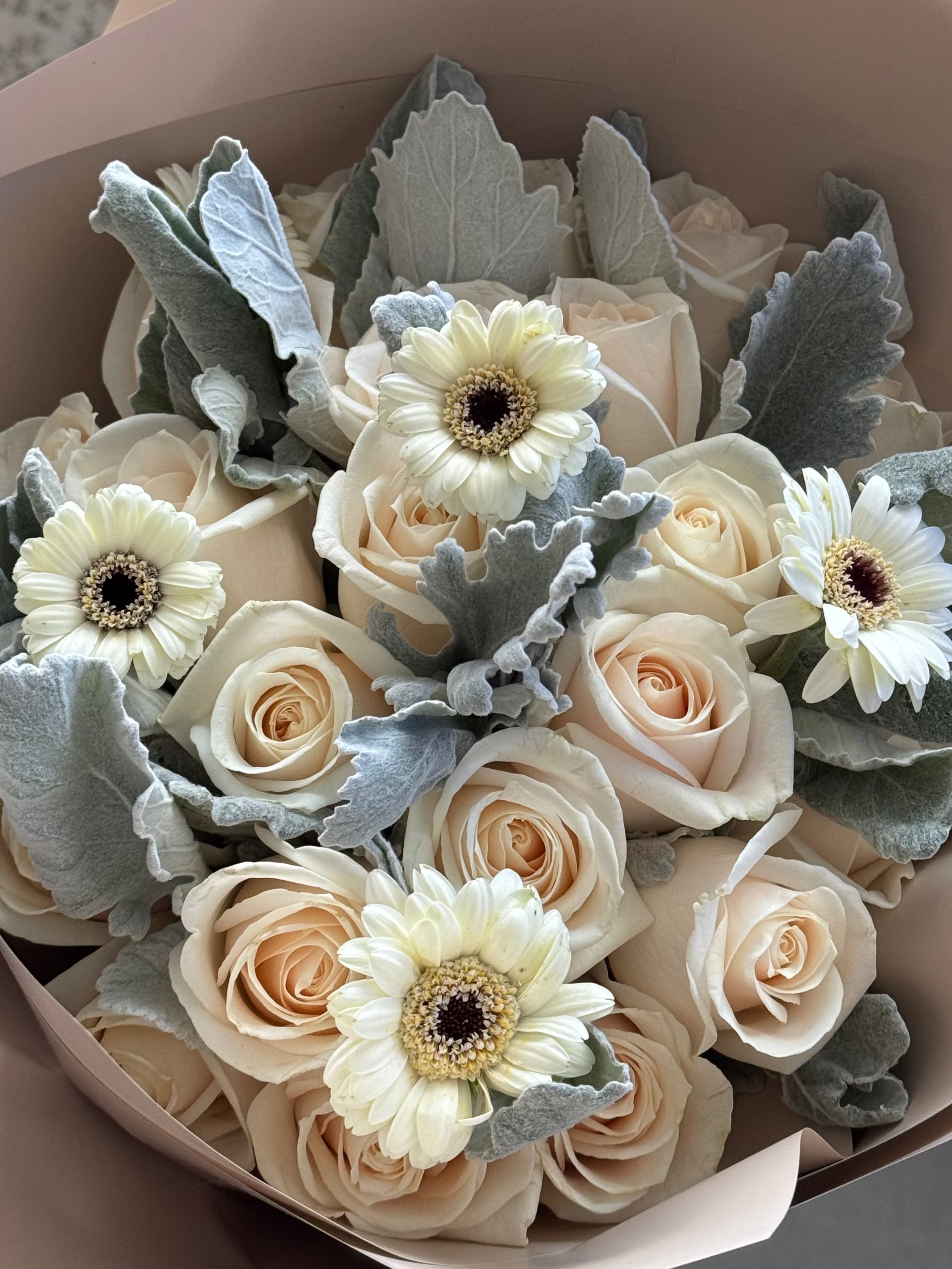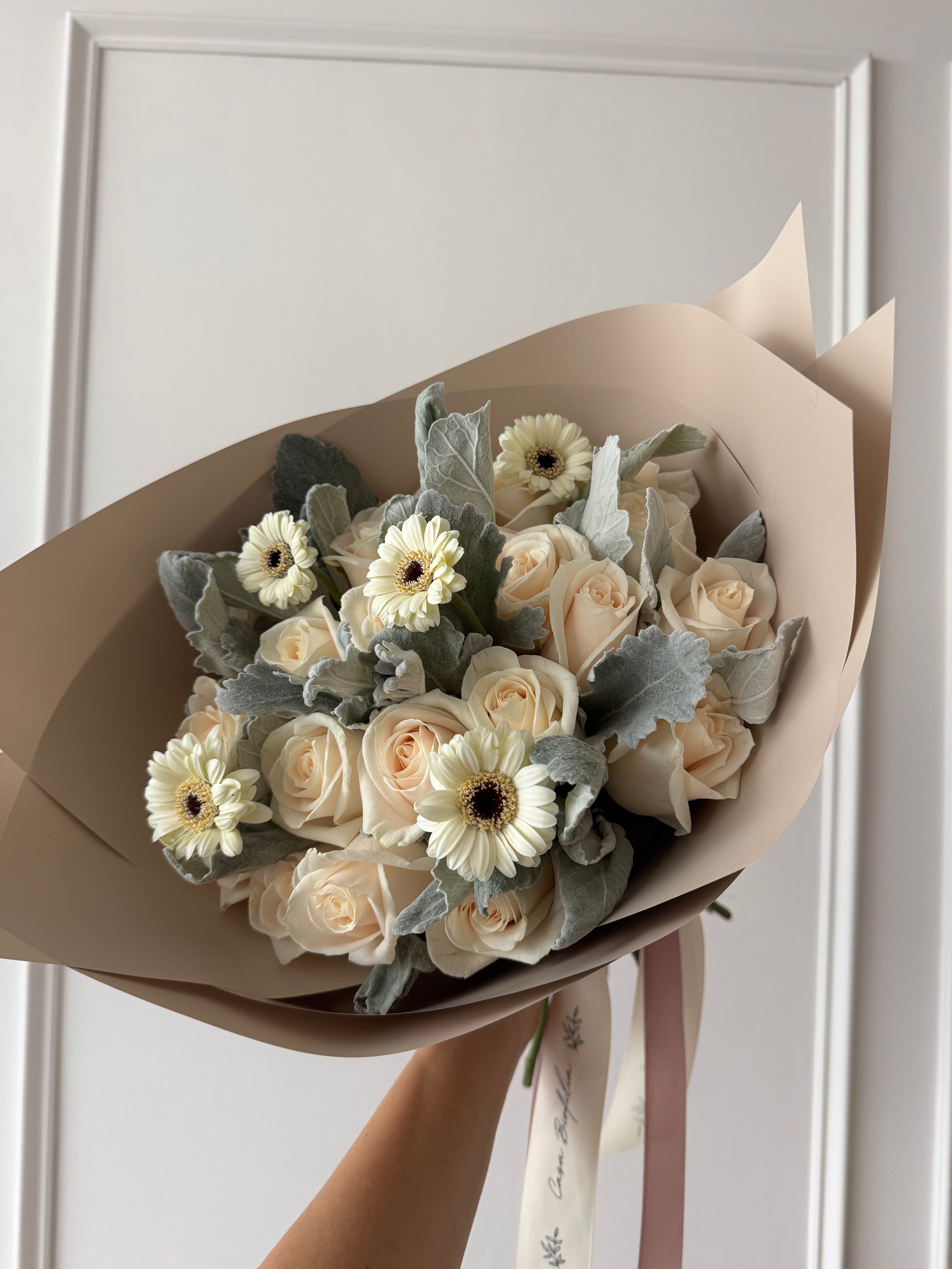 Este atado une rosas y gerberas en una mezcla fresca y alegre. Un detalle vibrante y lleno de vida, ideal para regalar un momento luminoso y espontáneo.
