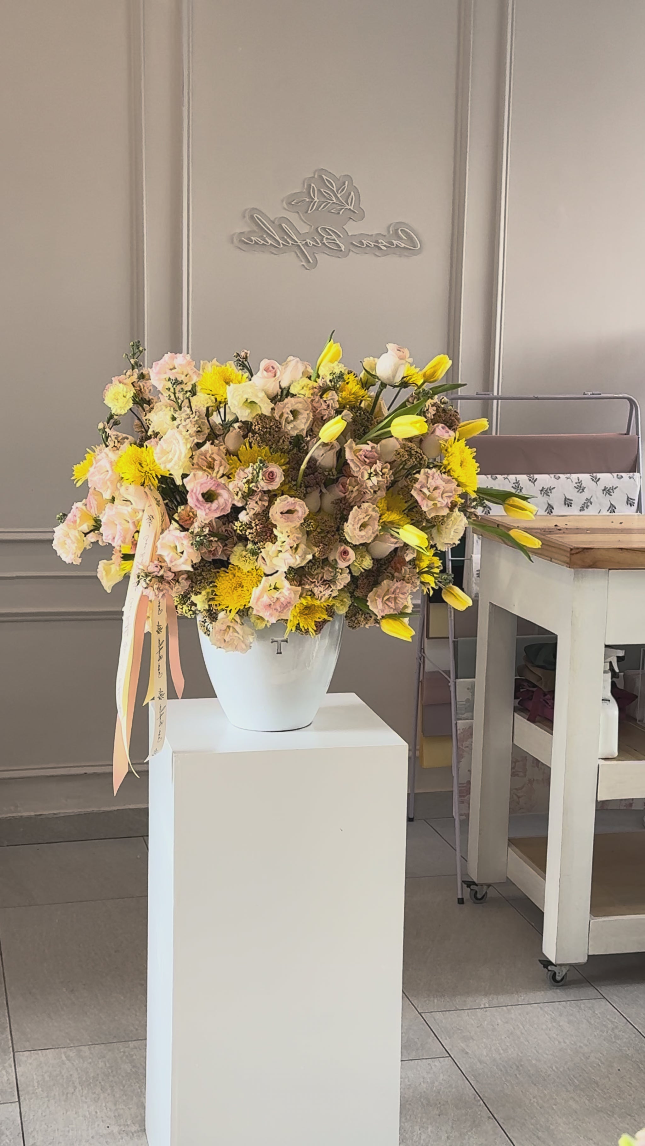 Este arreglo de flores de temporada en tonos amarillos con rosa es perfecto para sorprender.