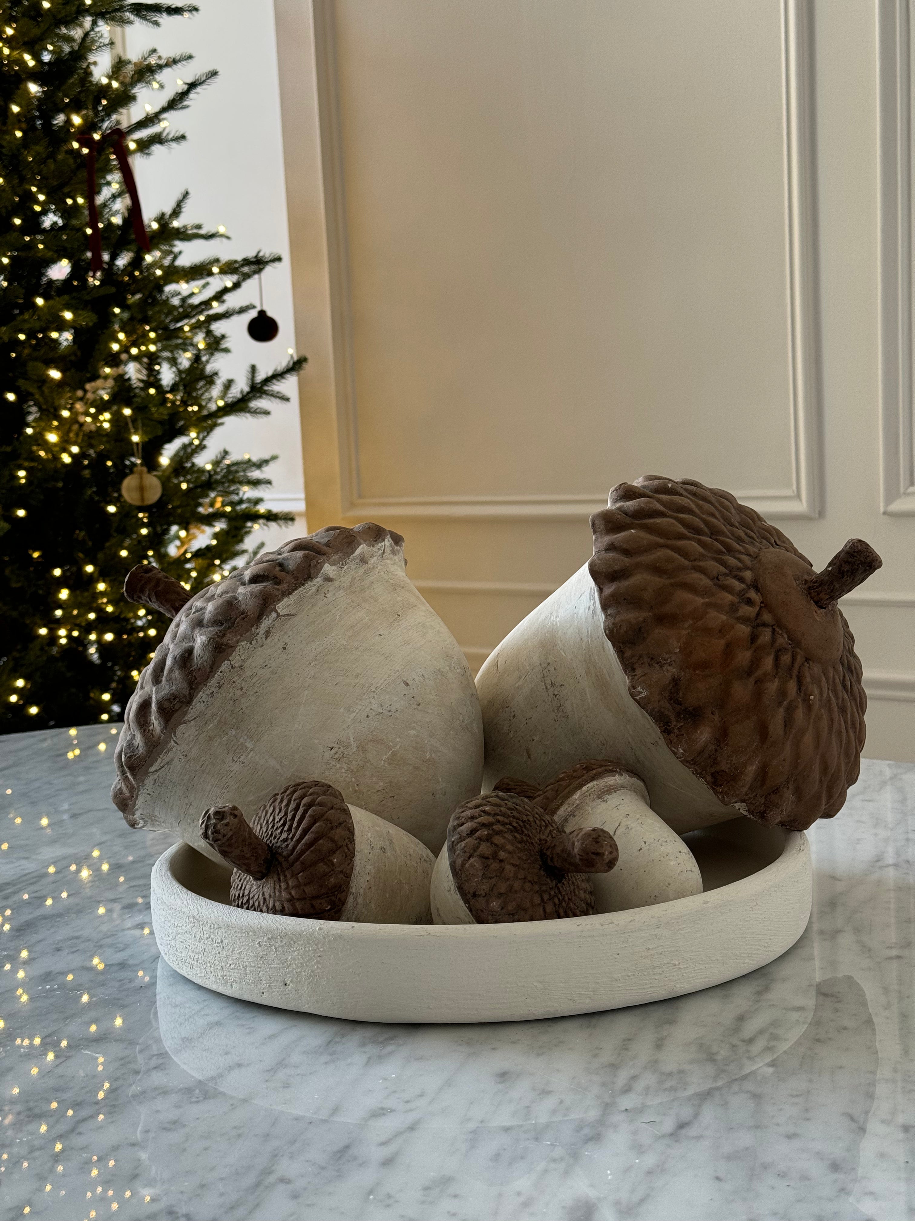 Este look combina una bandeja decorativa de 40cm con un par de bellotas artesanales y tres bellotas mini, creando una composición natural y encantadora. Los tonos neutros y las texturas orgánicas aportan un aire acogedor, perfecto para dar un toque estacional a cualquier rincón de tu hogar.