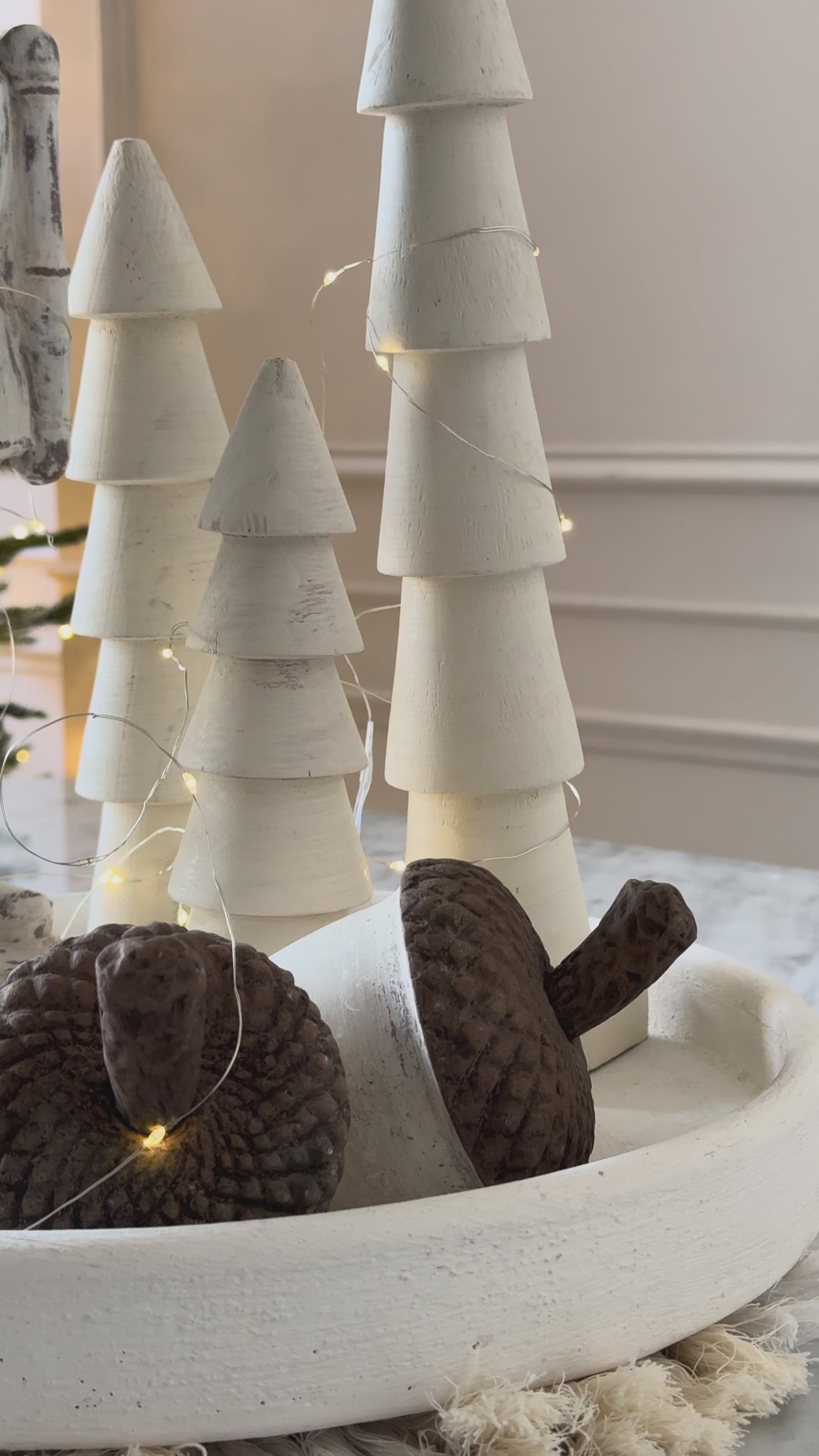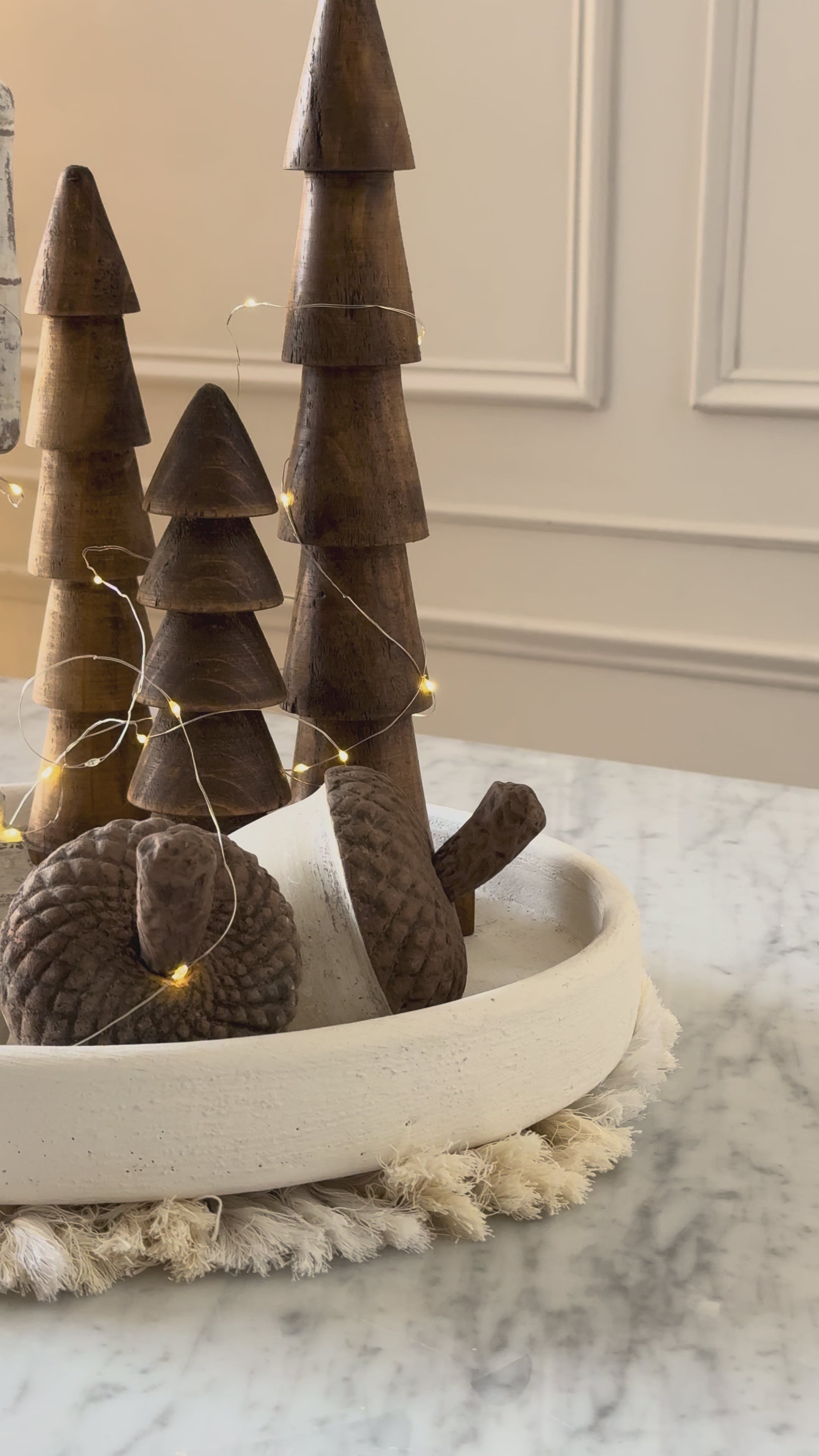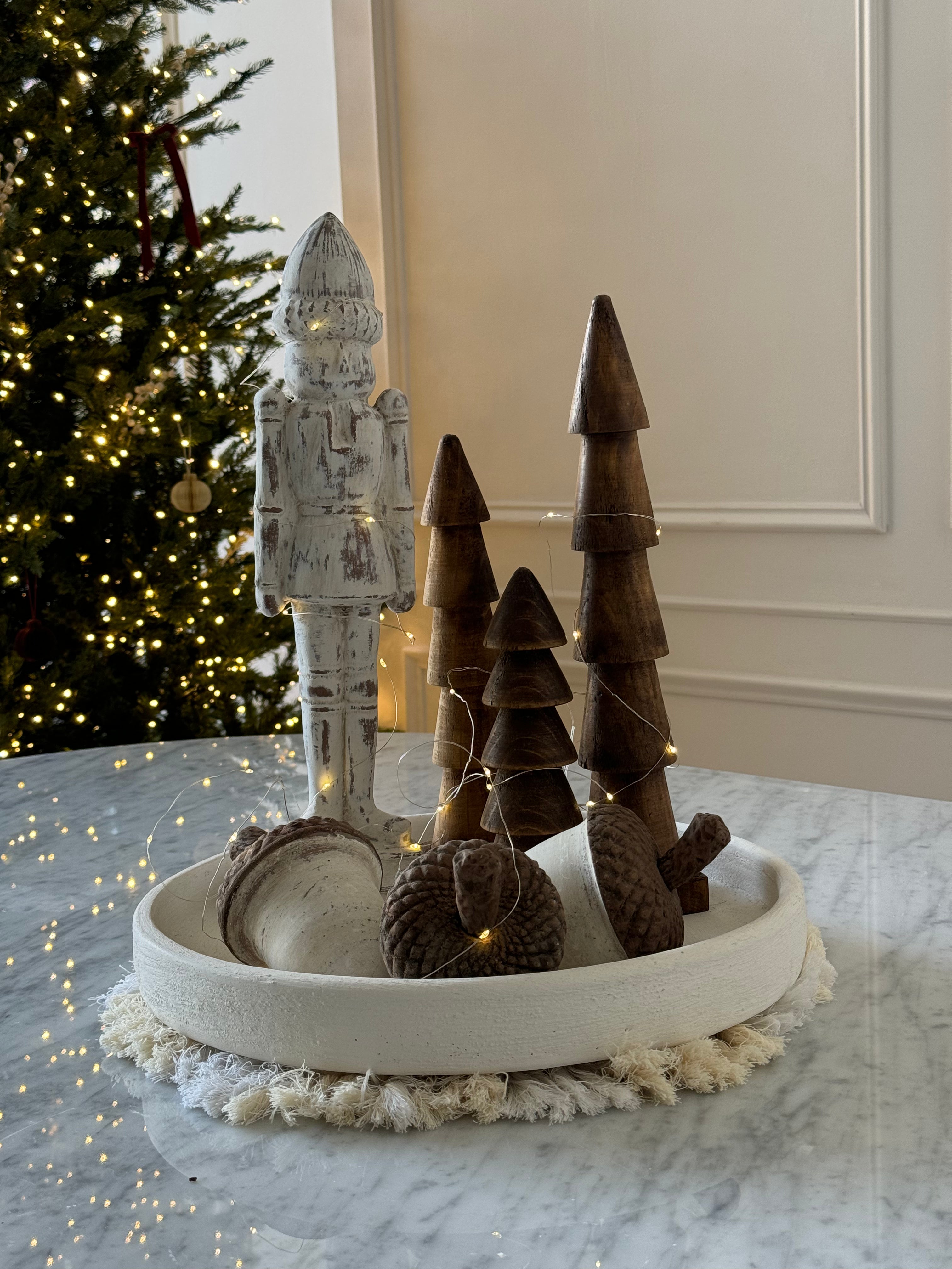 Un conjunto encantador que reúne un cascanueces de barro, bellotas mini y una bandeja de 30 cm que aporta un toque cálido y artesanal. La escena se complementa con un trío de pinos de madera —disponibles en tono beige o natural— creando una composición armoniosa y festiva, perfecta para destacar cualquier rincón de la temporada.