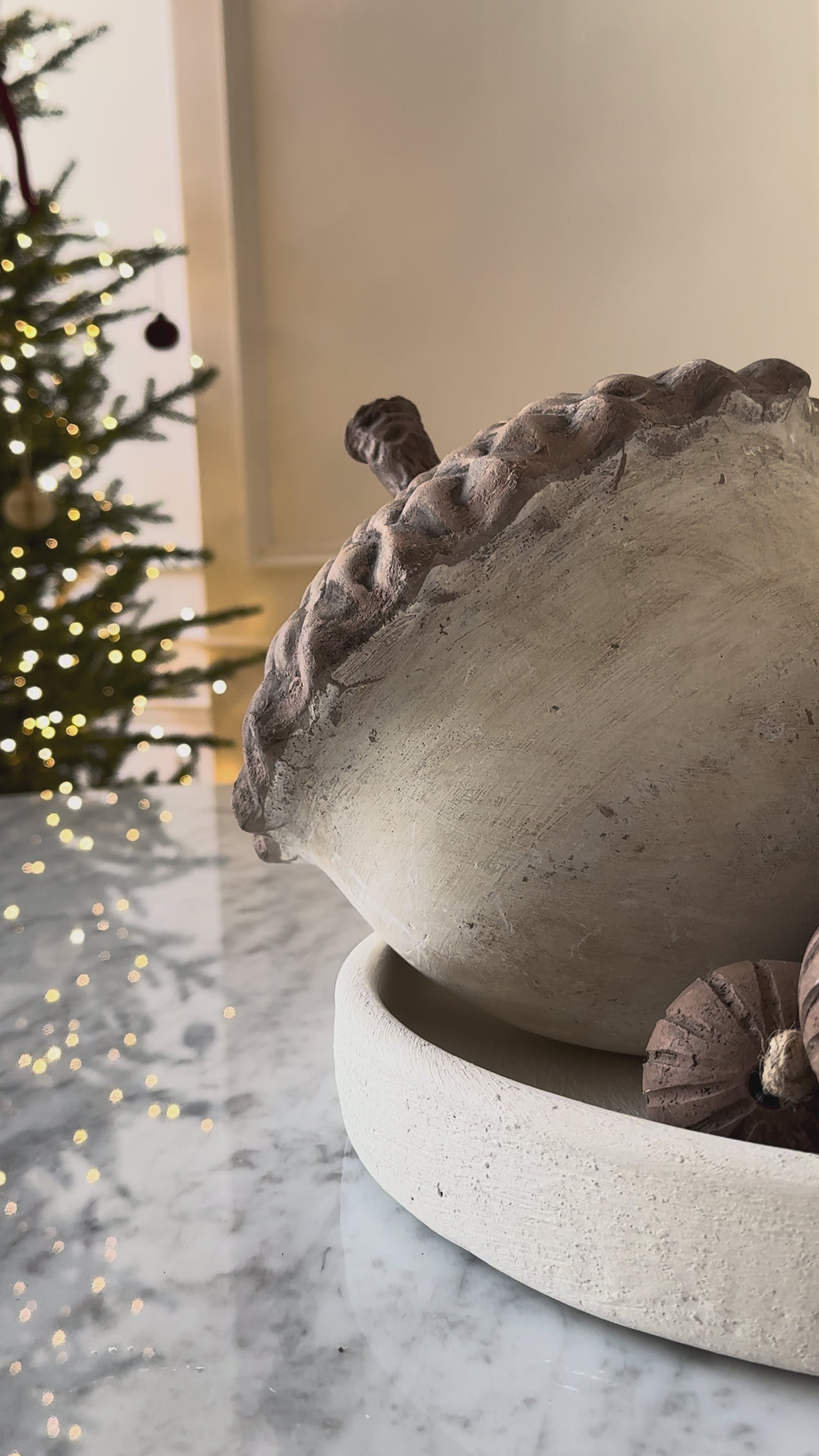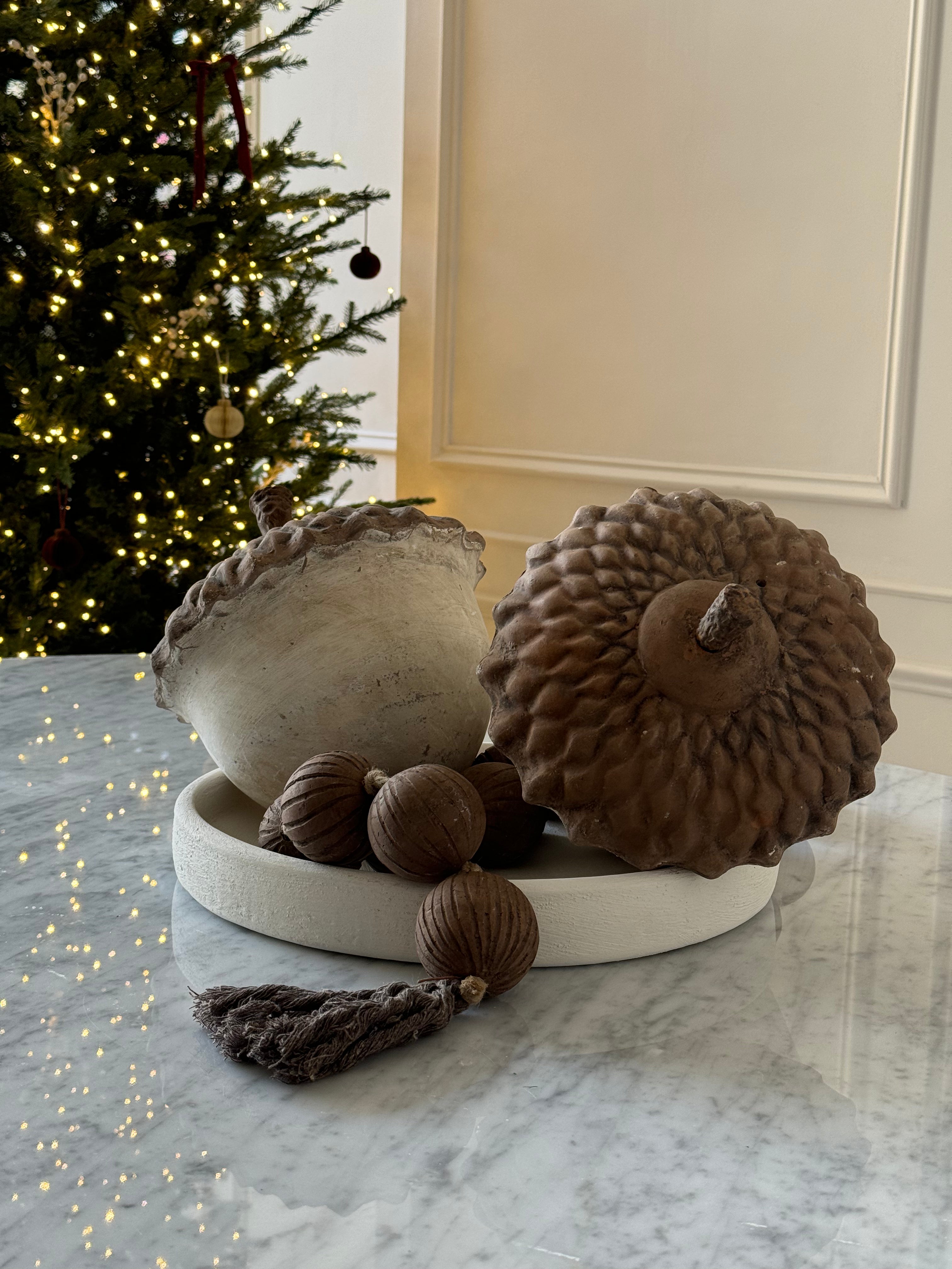 Este look combina piezas de barro elaboradas artesanalmente. Incluye un par de bellotas grandes, un rosario color café natural y una bandeja de 40cm de diámetro.