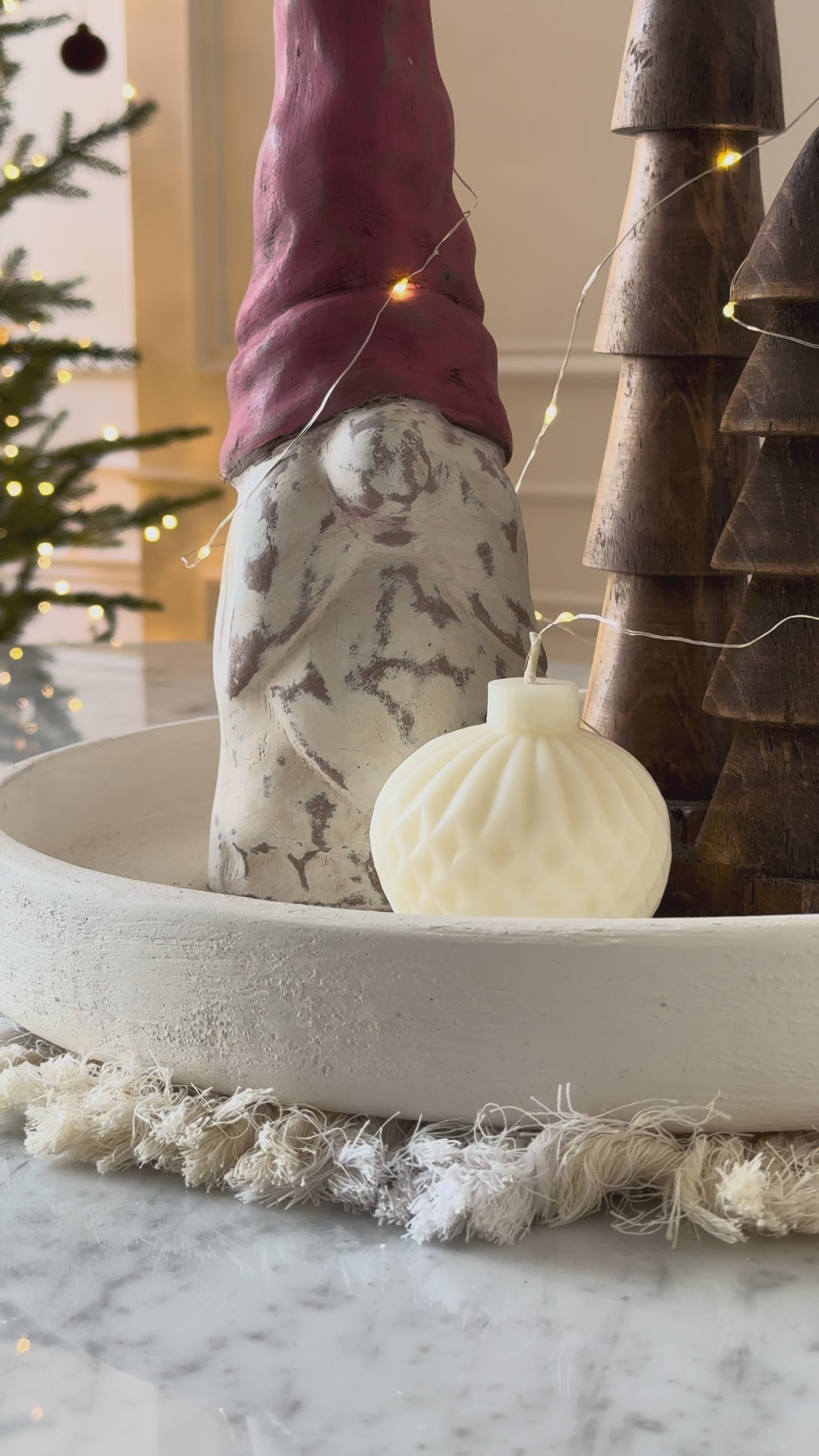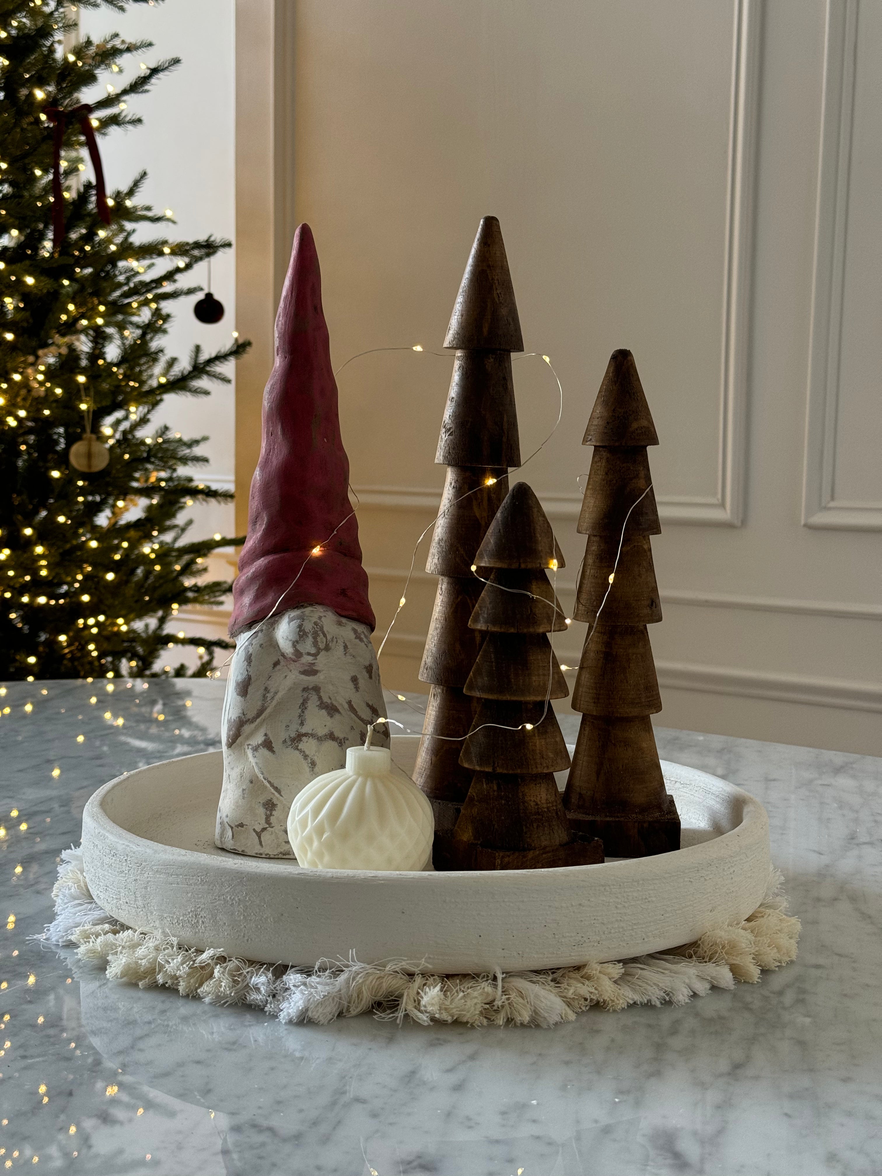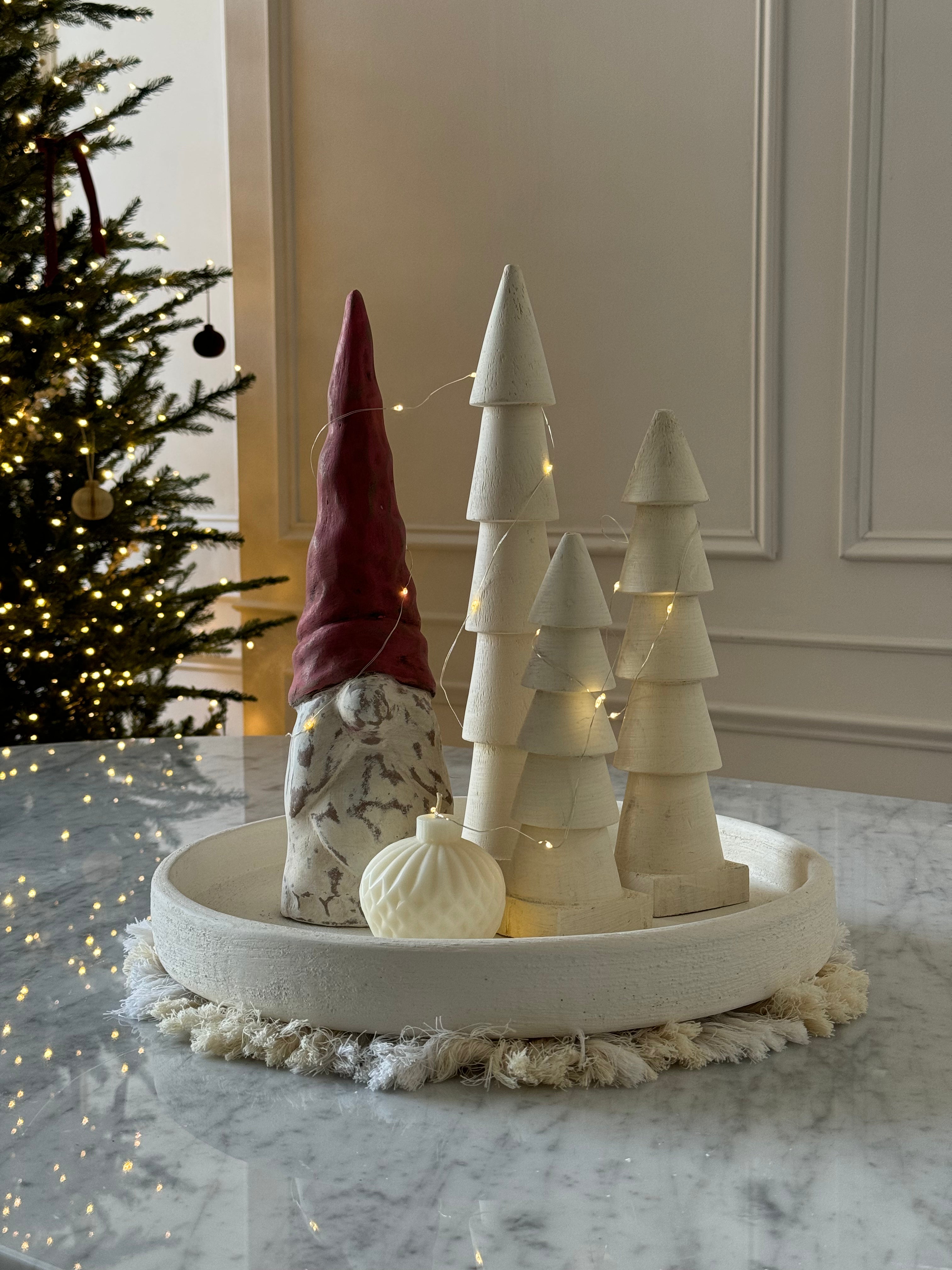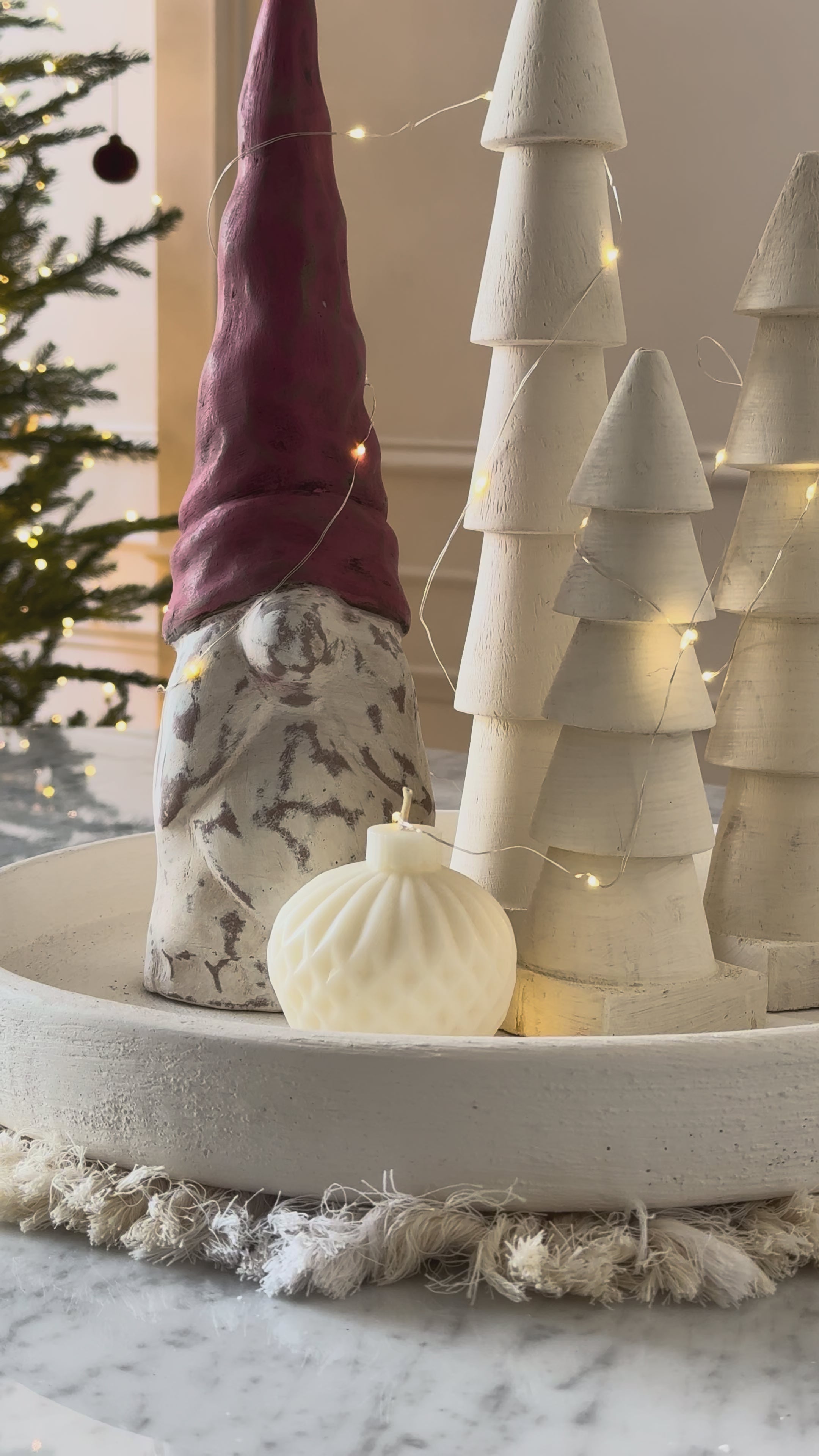 Un detalle lleno de encanto invernal: un gnomo con su vela de esfera y pinos decorativos creando una pequeña escena acogedora sobre una bandeja de 30 cm.