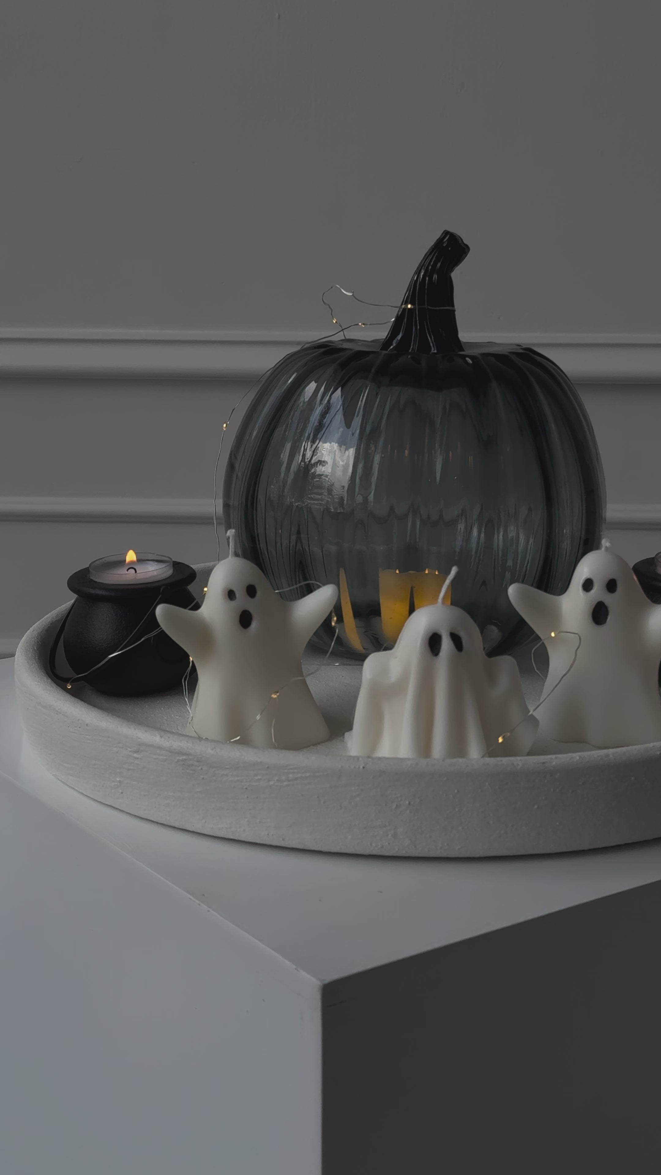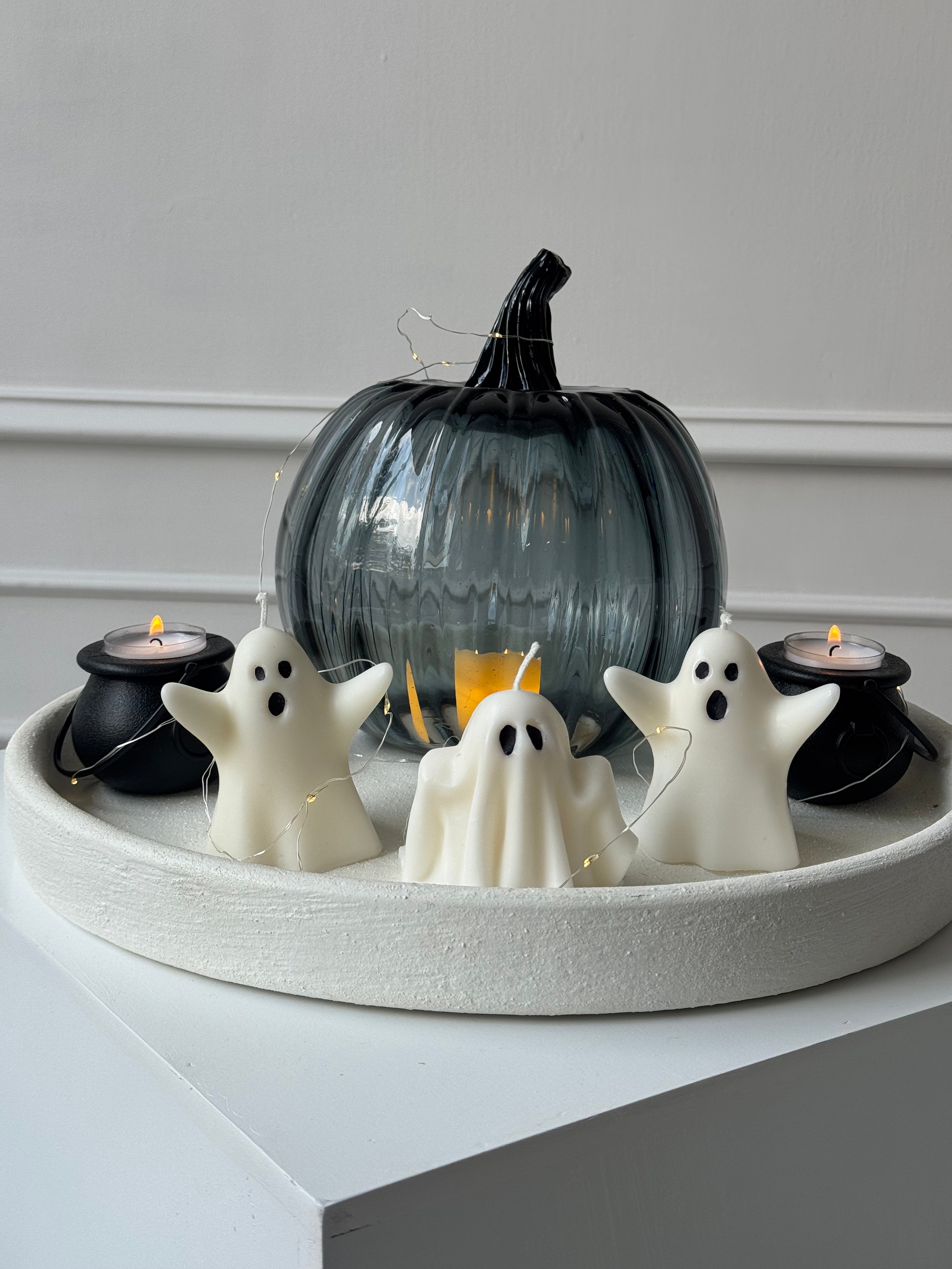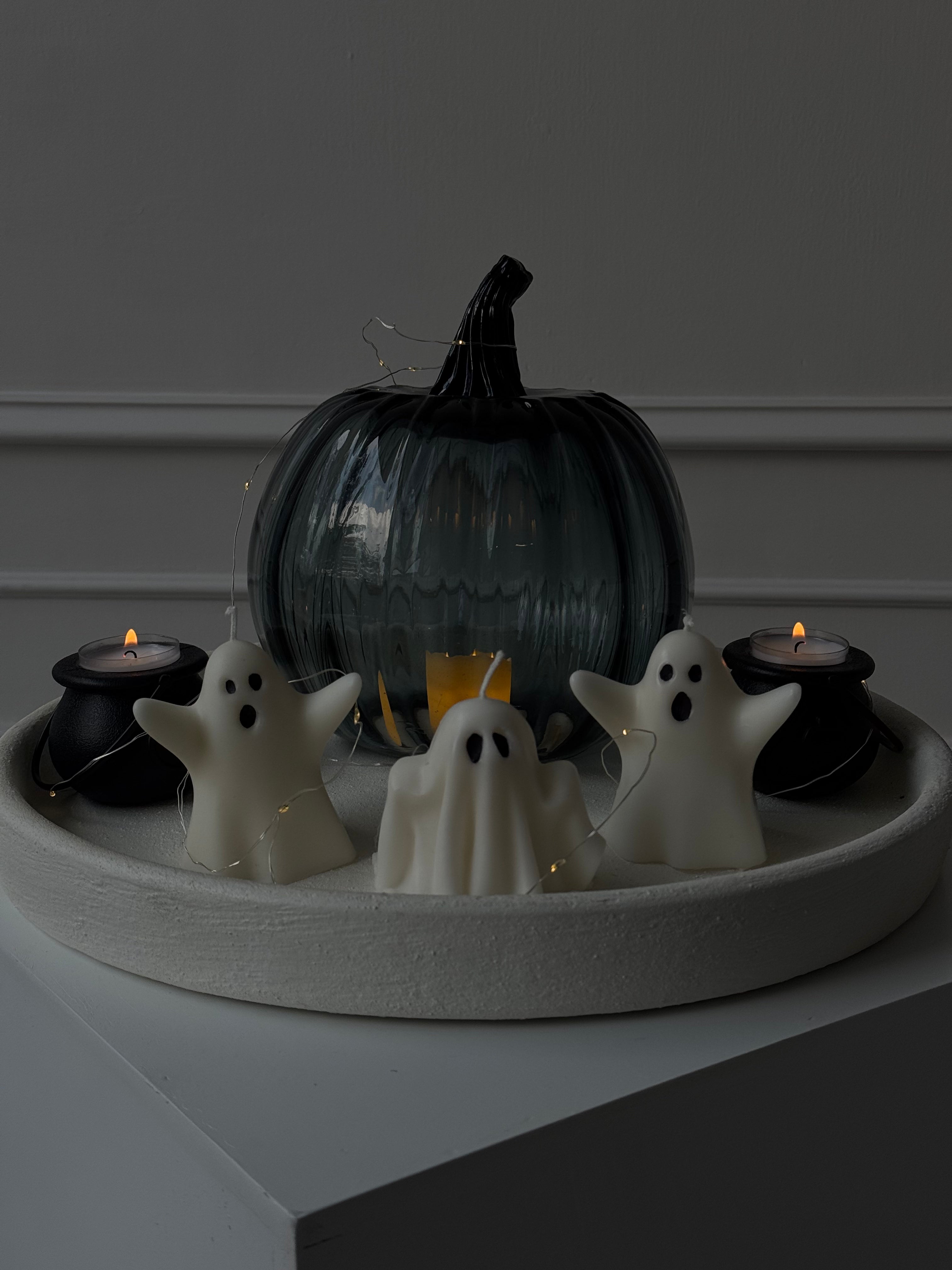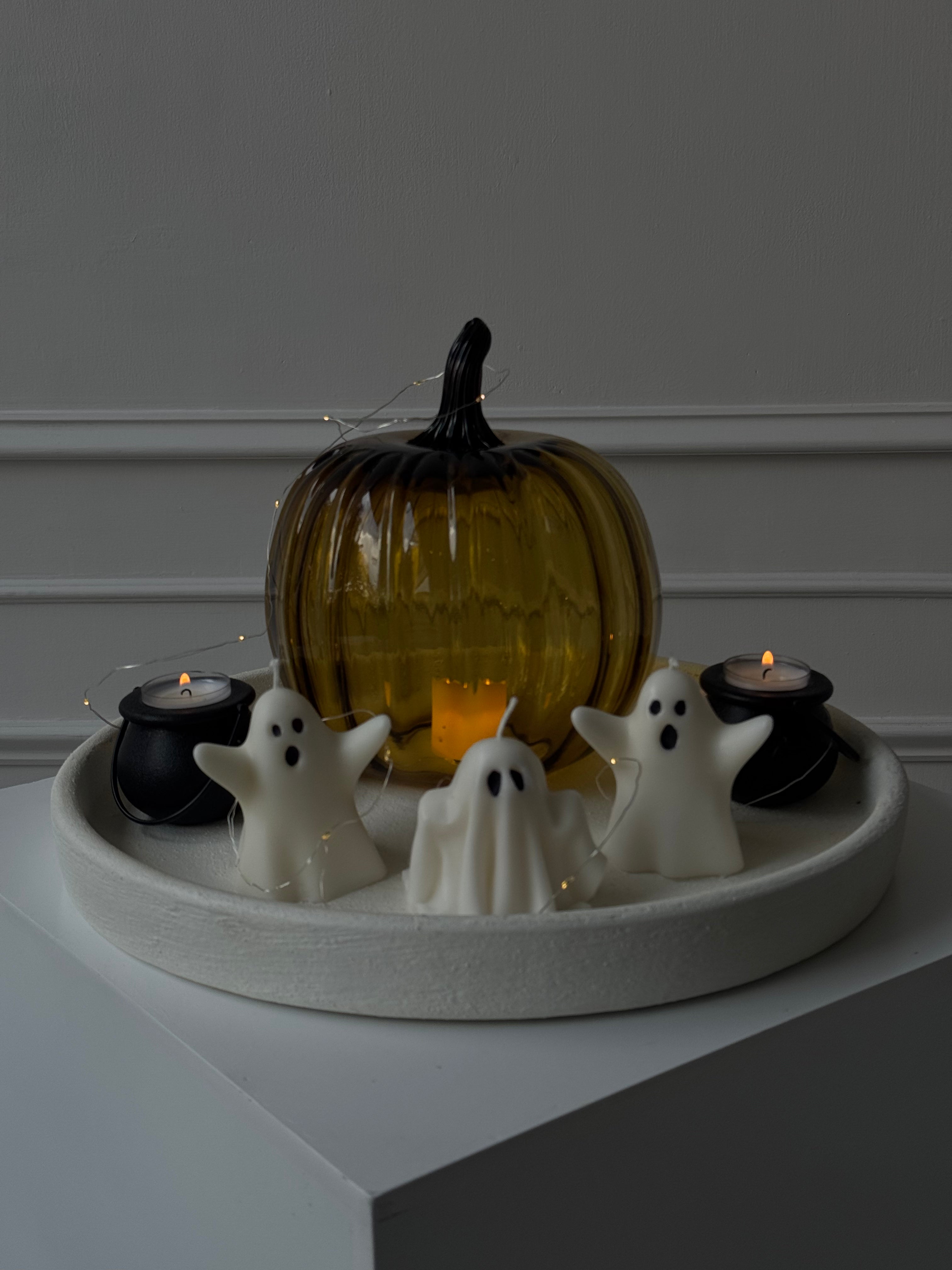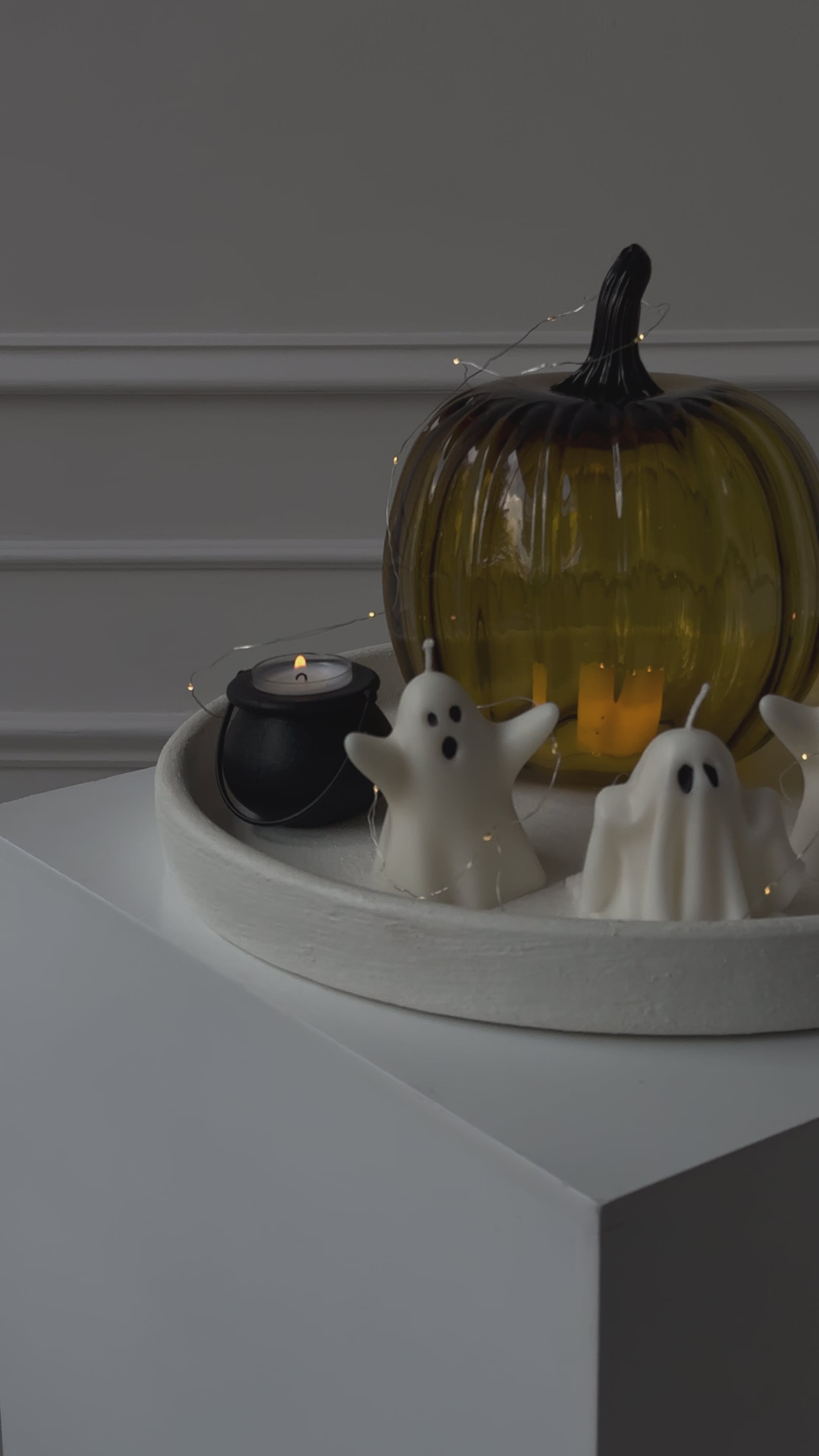 Este look incluye la base blanca de barro de 40cm de diametro, una calabaza de vidrio soplado en color a elegir (ámbar o humo) con su vela LED, dos calderos con vela natural y tres velas de fantasma.