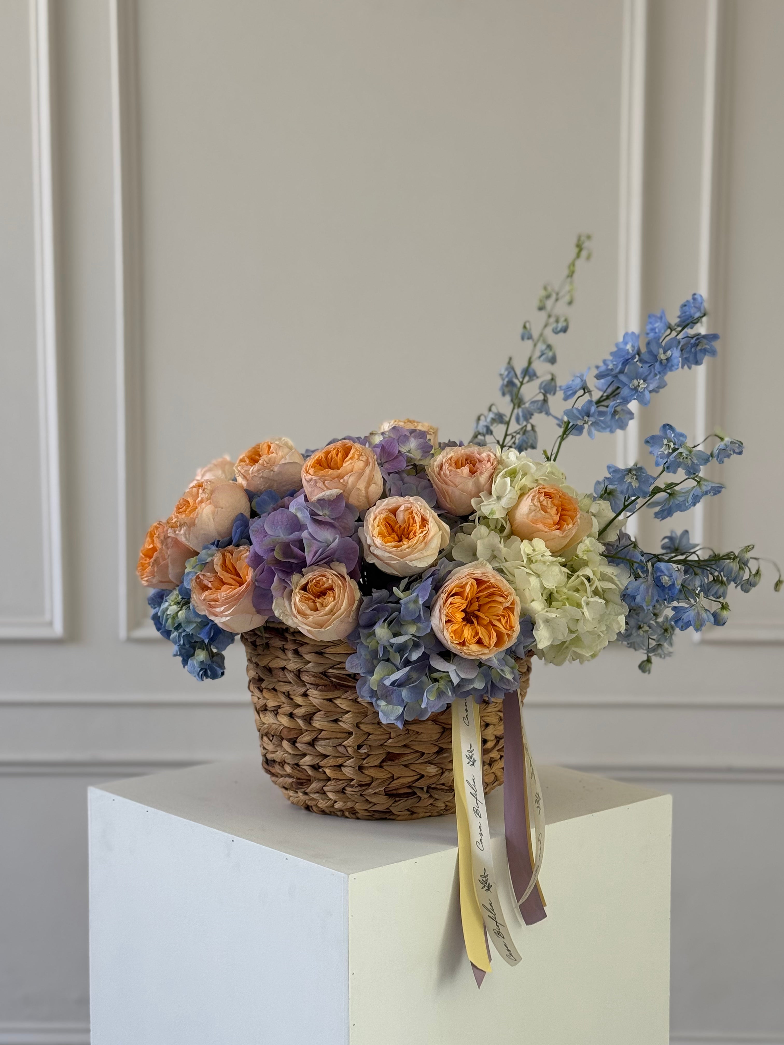Una canasta cubierta de hortensias que abraza suavemente un conjunto de rosas inglesas, realzada con toques de delphinium que aportan verticalidad y presencia. Un detalle impactante y lleno de elegancia, pensado para sorprender desde el primer vistazo.