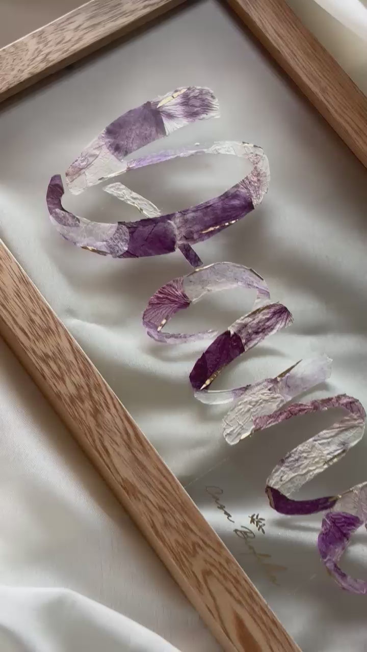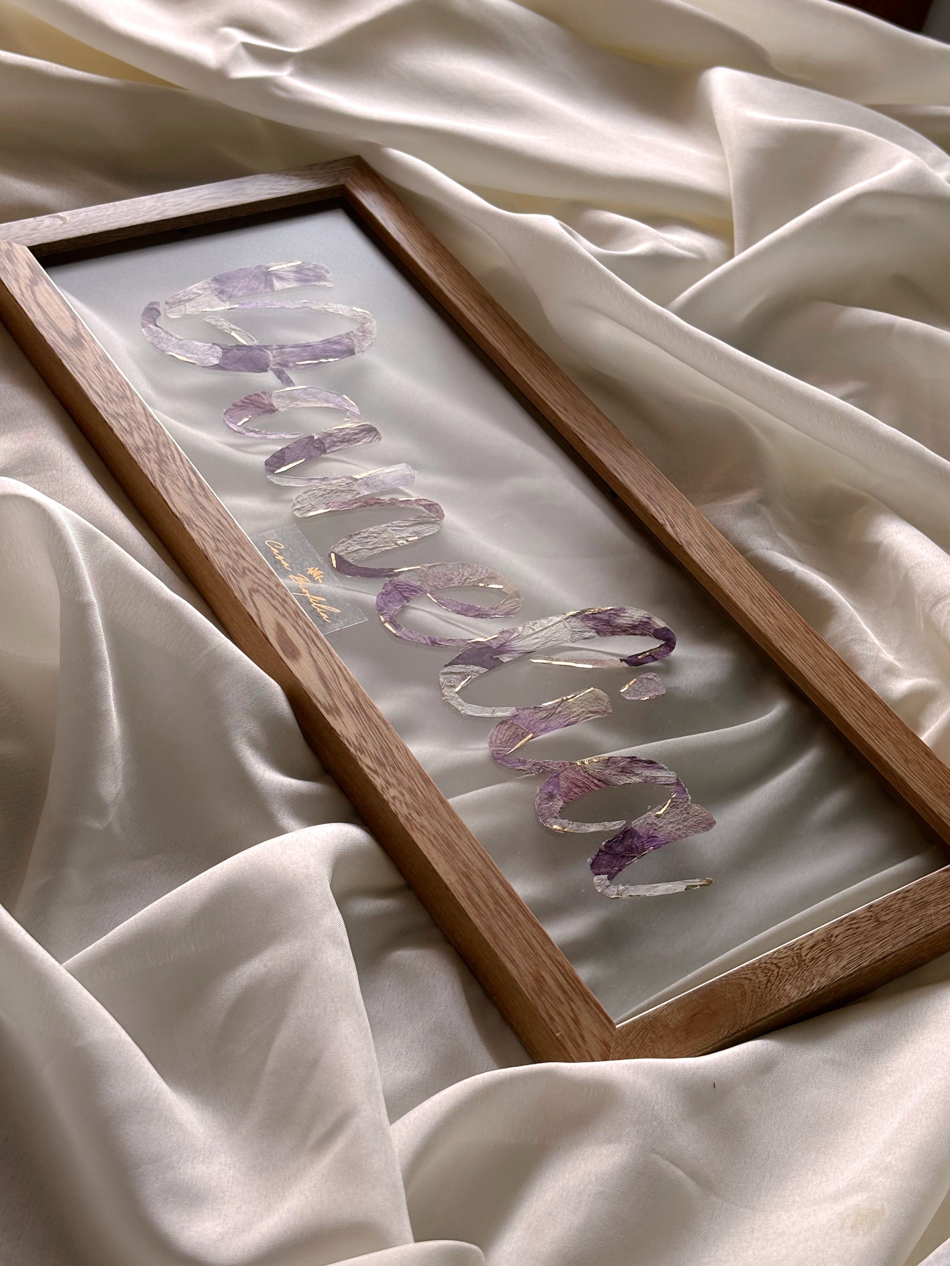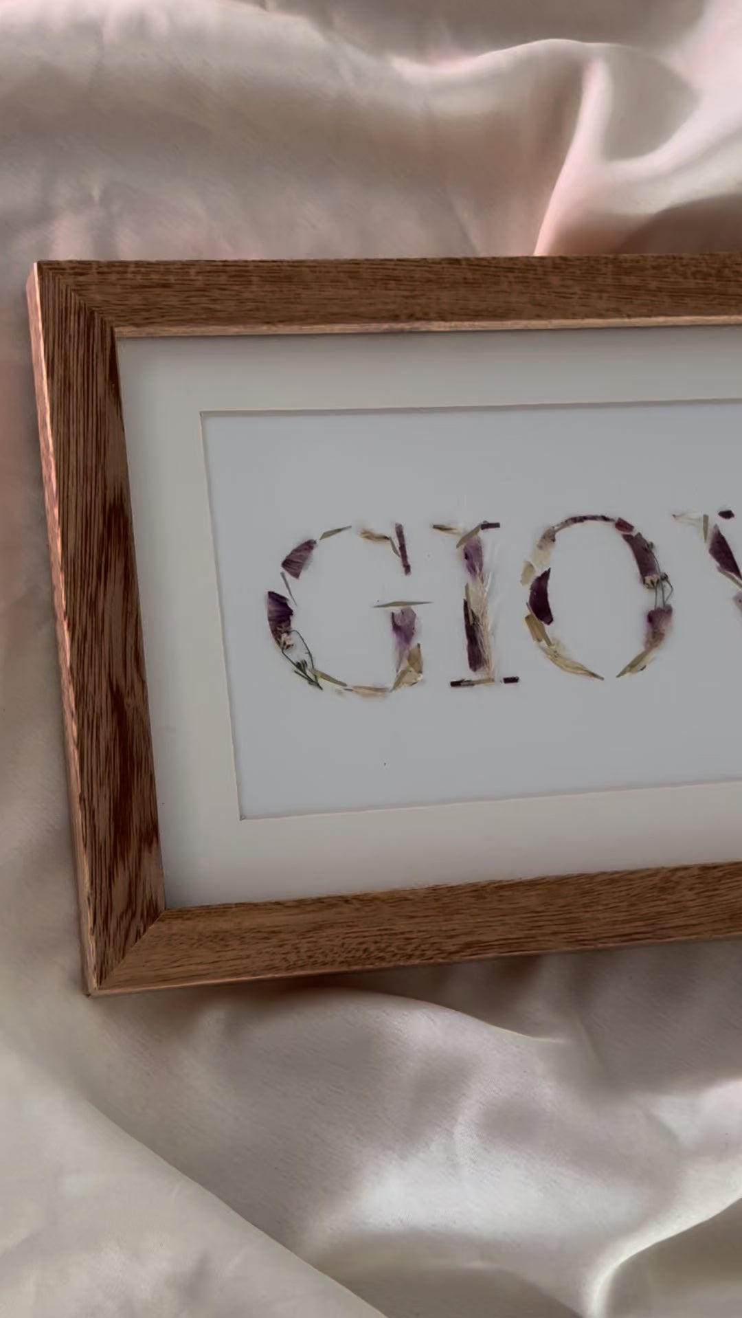 Diseñamos tu nombre o palabra favorita con flores naturales prensadas, cuidadosamente seleccionadas y dispuestas para reflejar armonía, color y elegancia.