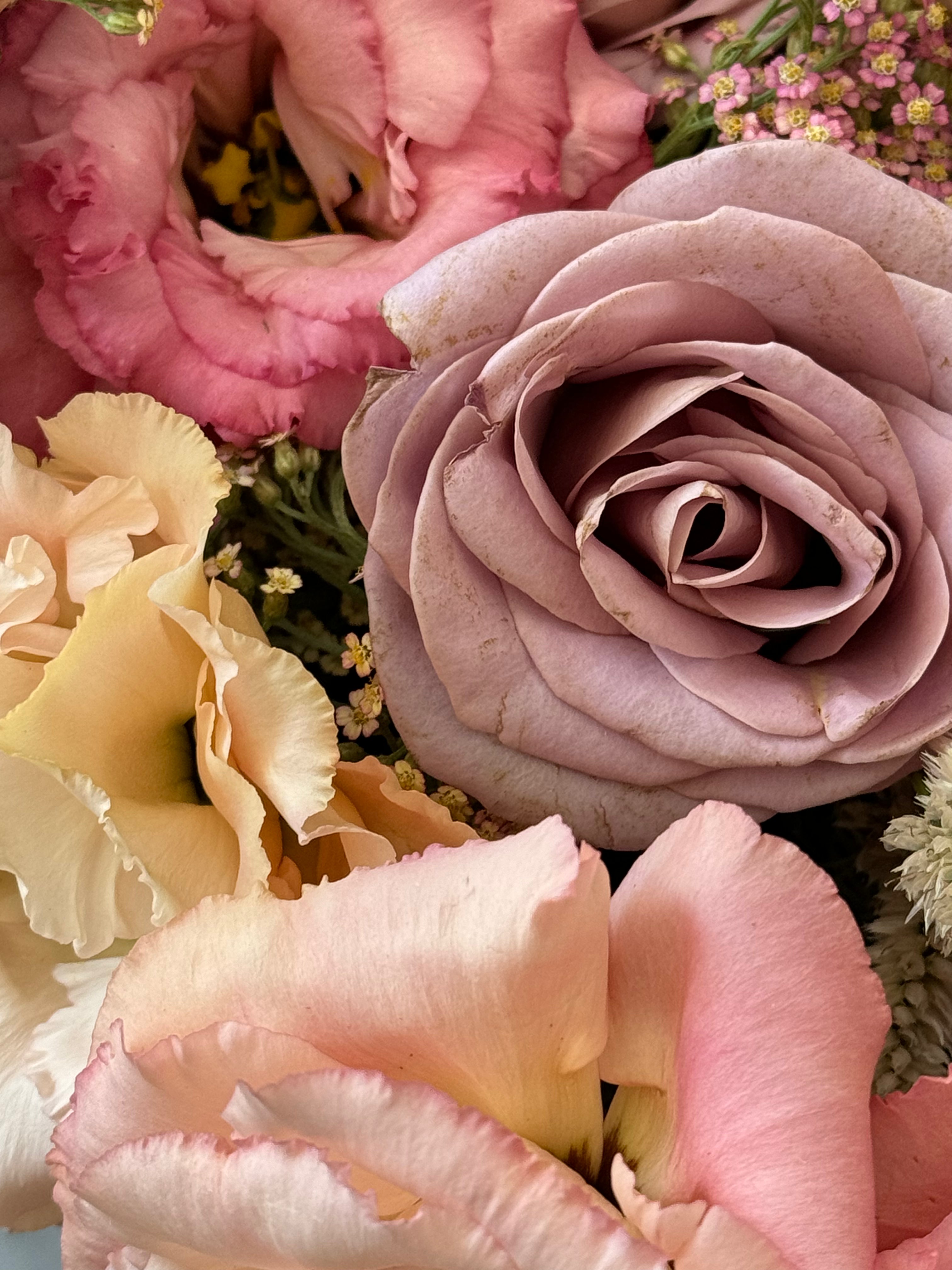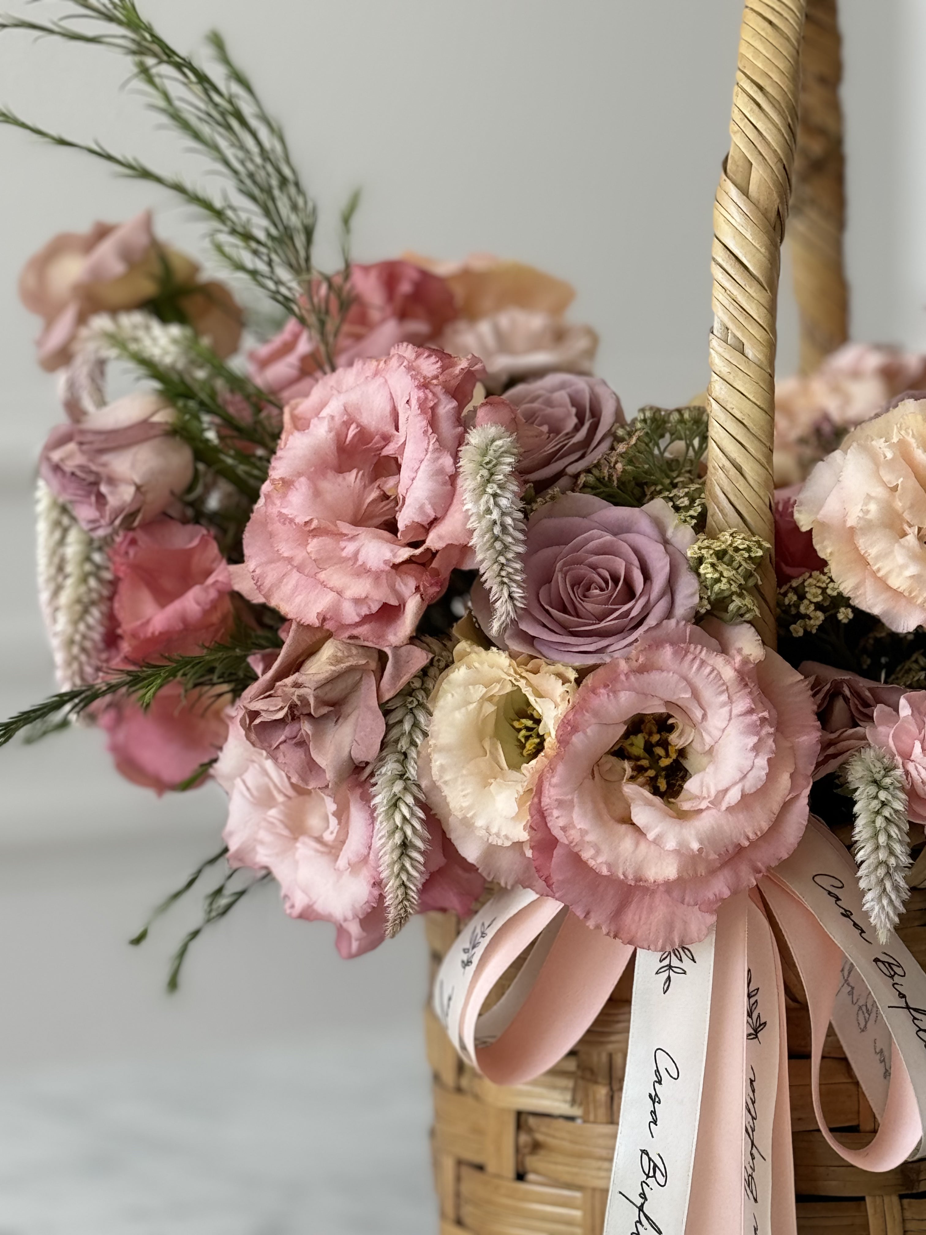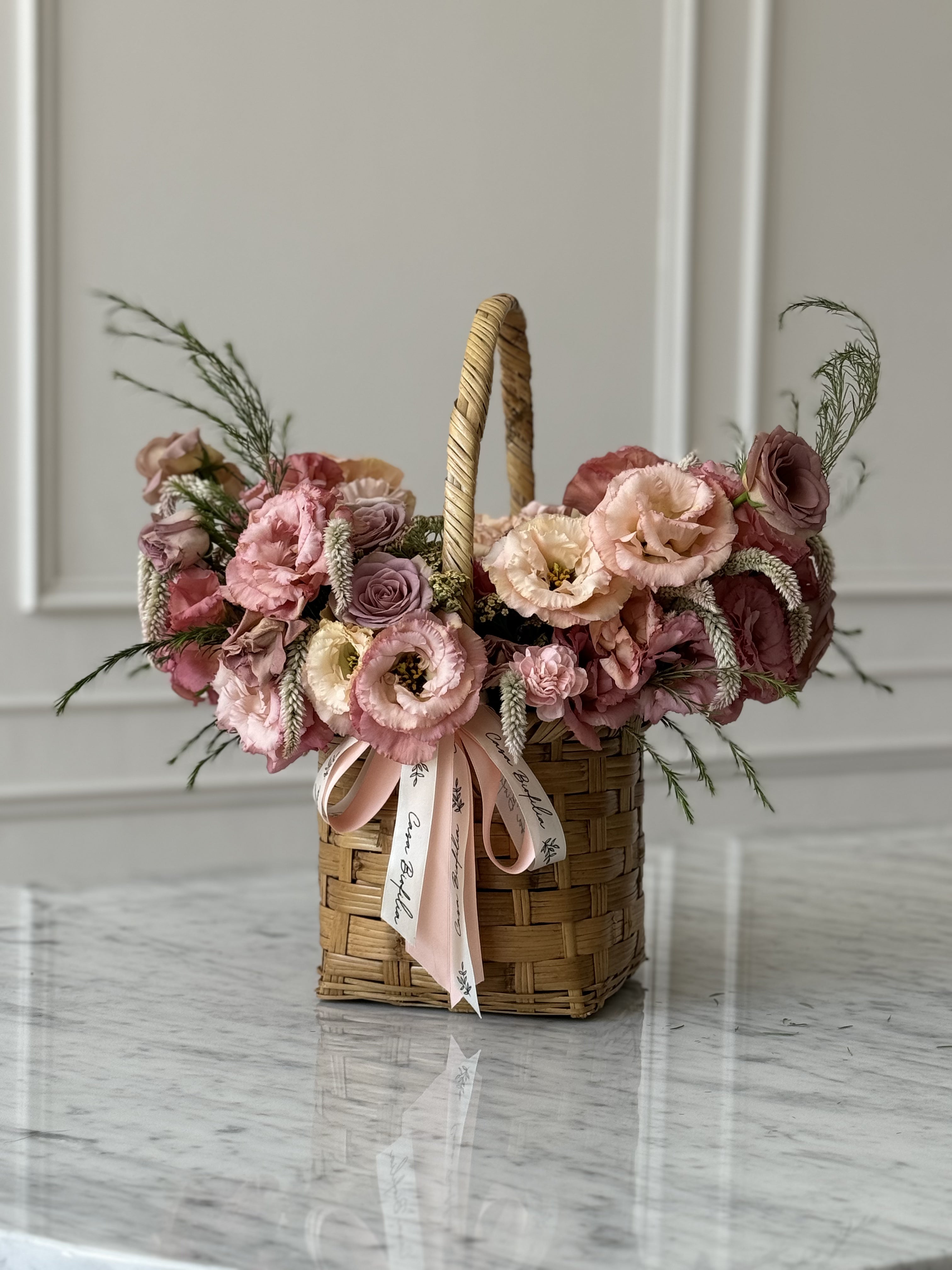 Esta canasta reúne lisianthus, rosas y clavelinas en una mezcla que destaca por su cálido matiz durazno, ese color que aporta luz suave y un encanto natural. Un arreglo con presencia y carácter, ideal para regalar un toque de belleza auténtica en cualquier momento.