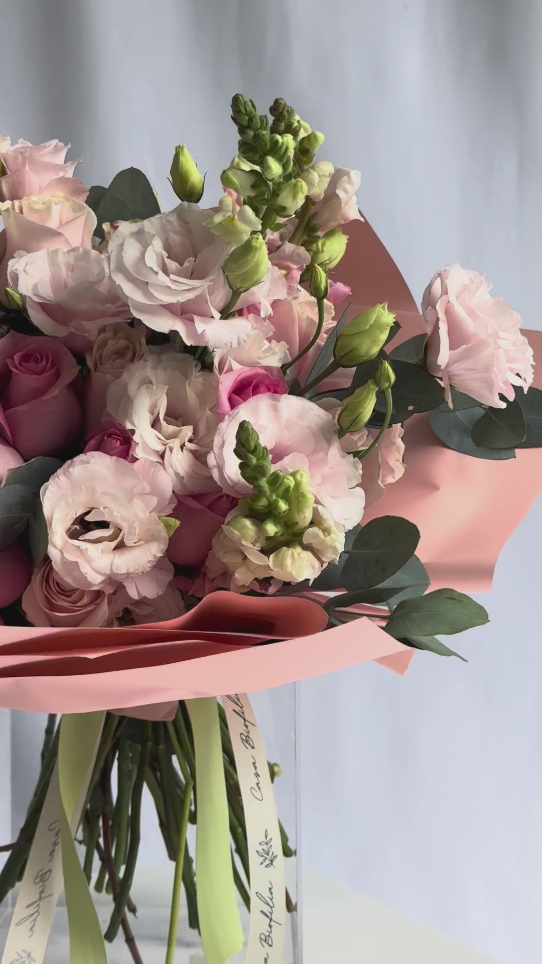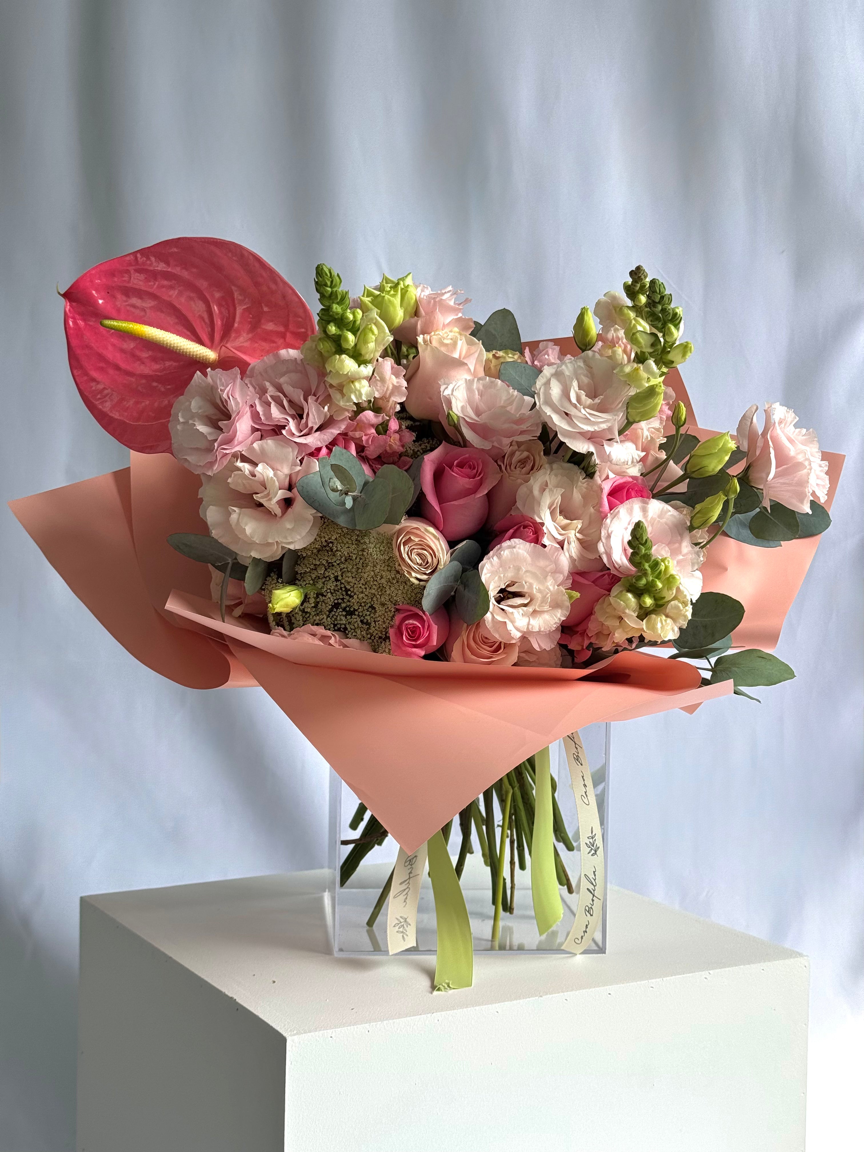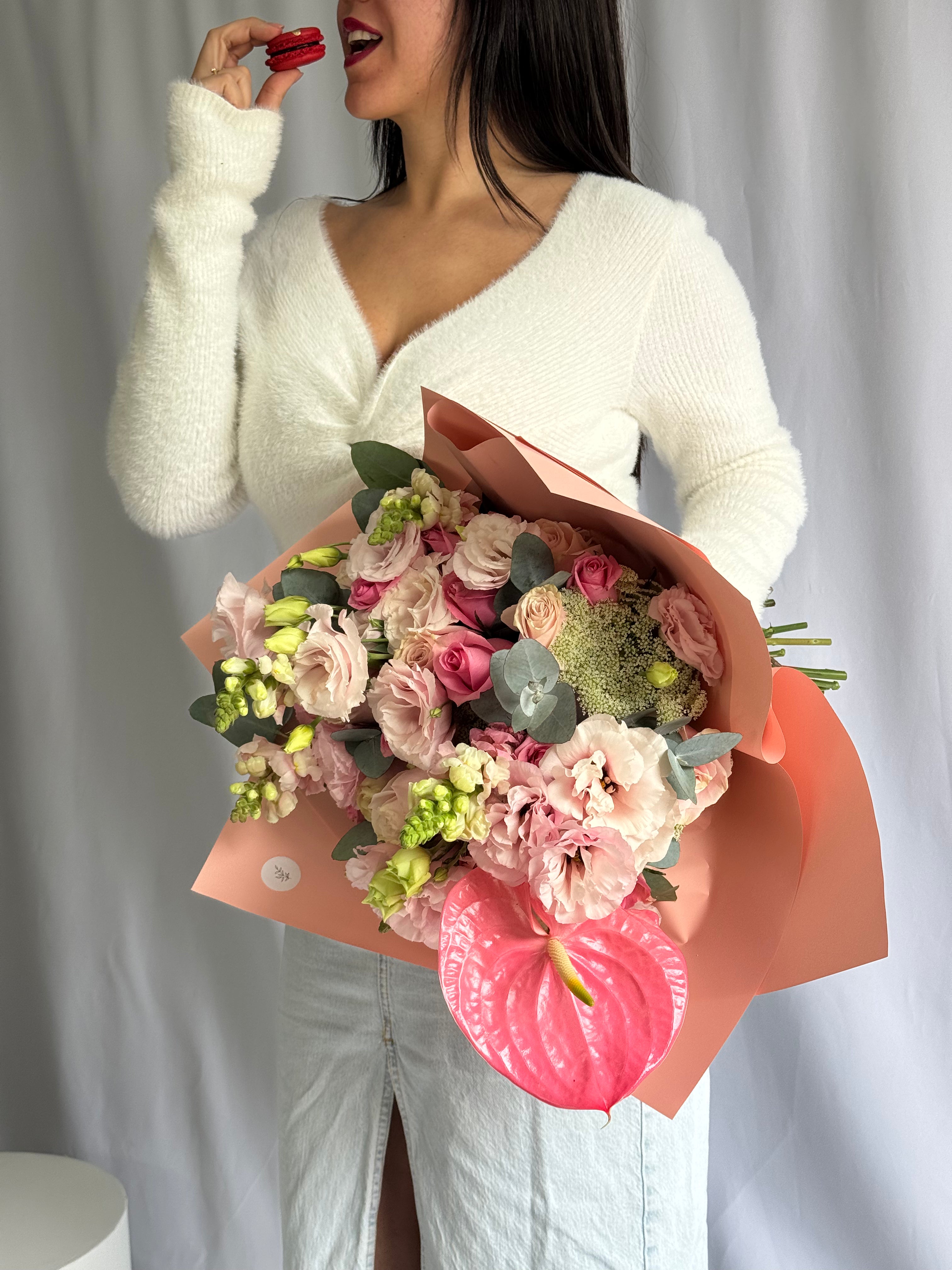 Atado de rosas, perrito, anturio y lisianthus, creado para demostrar que todos los días pueden sentirse como San Valentín.