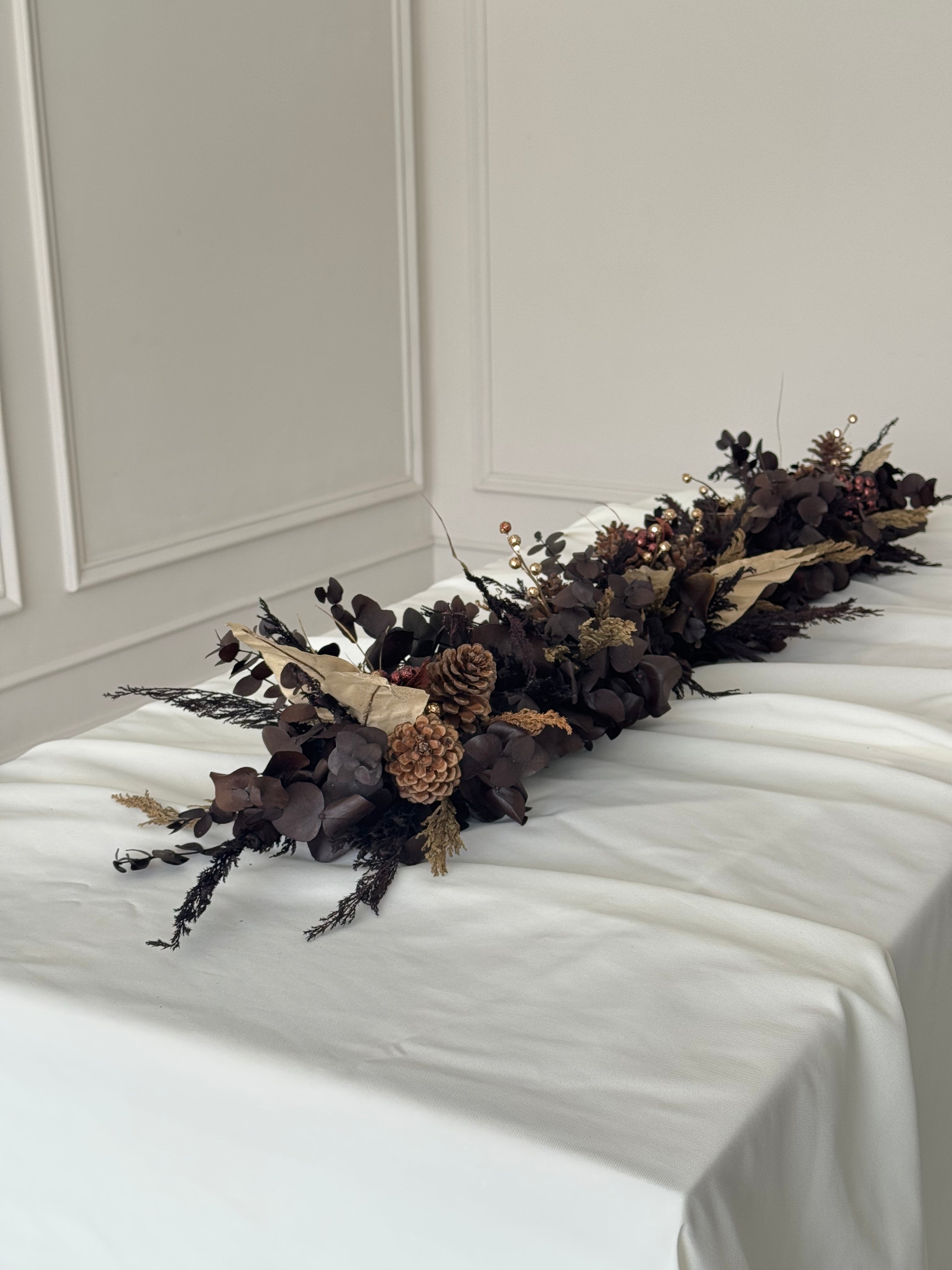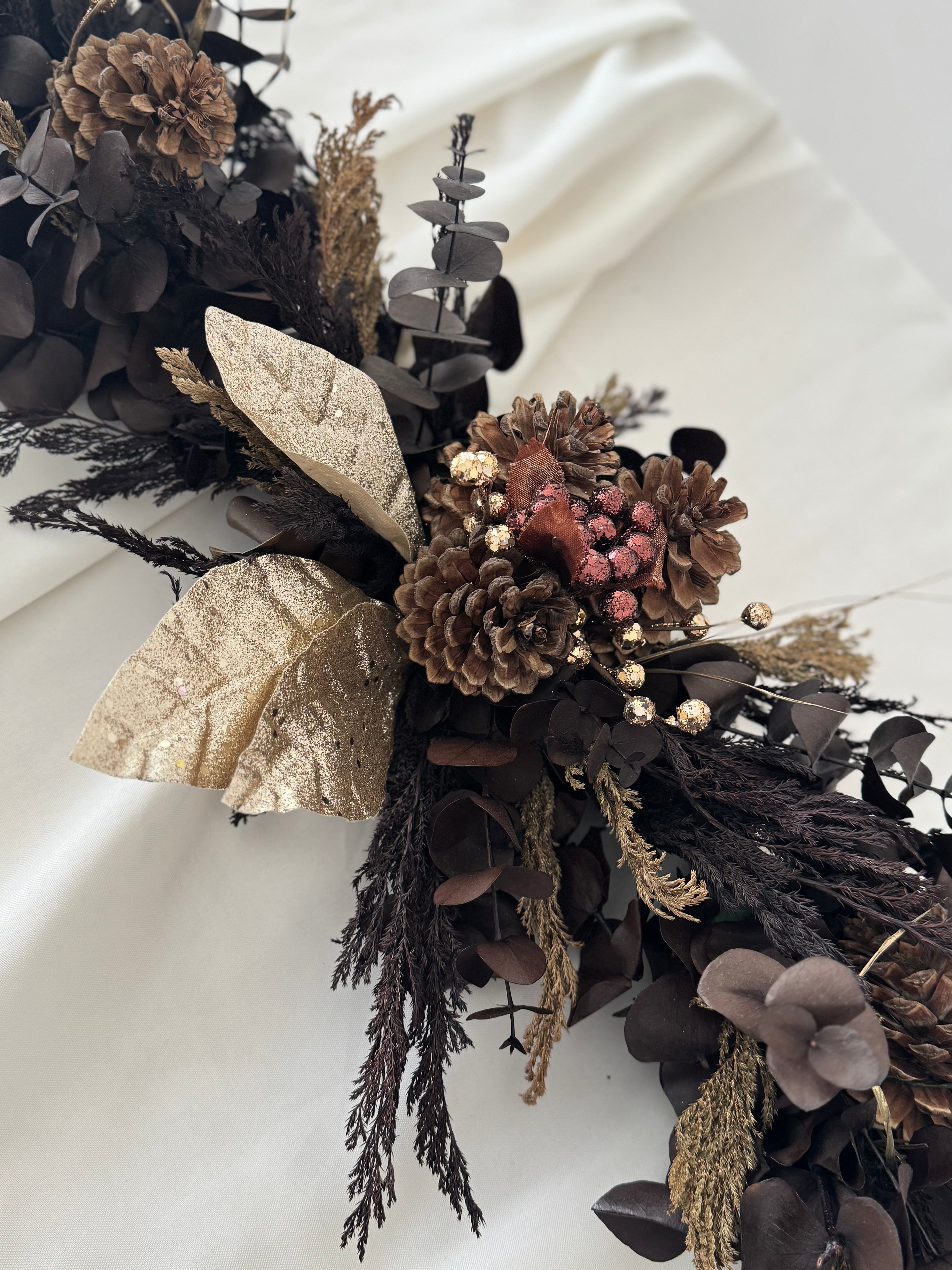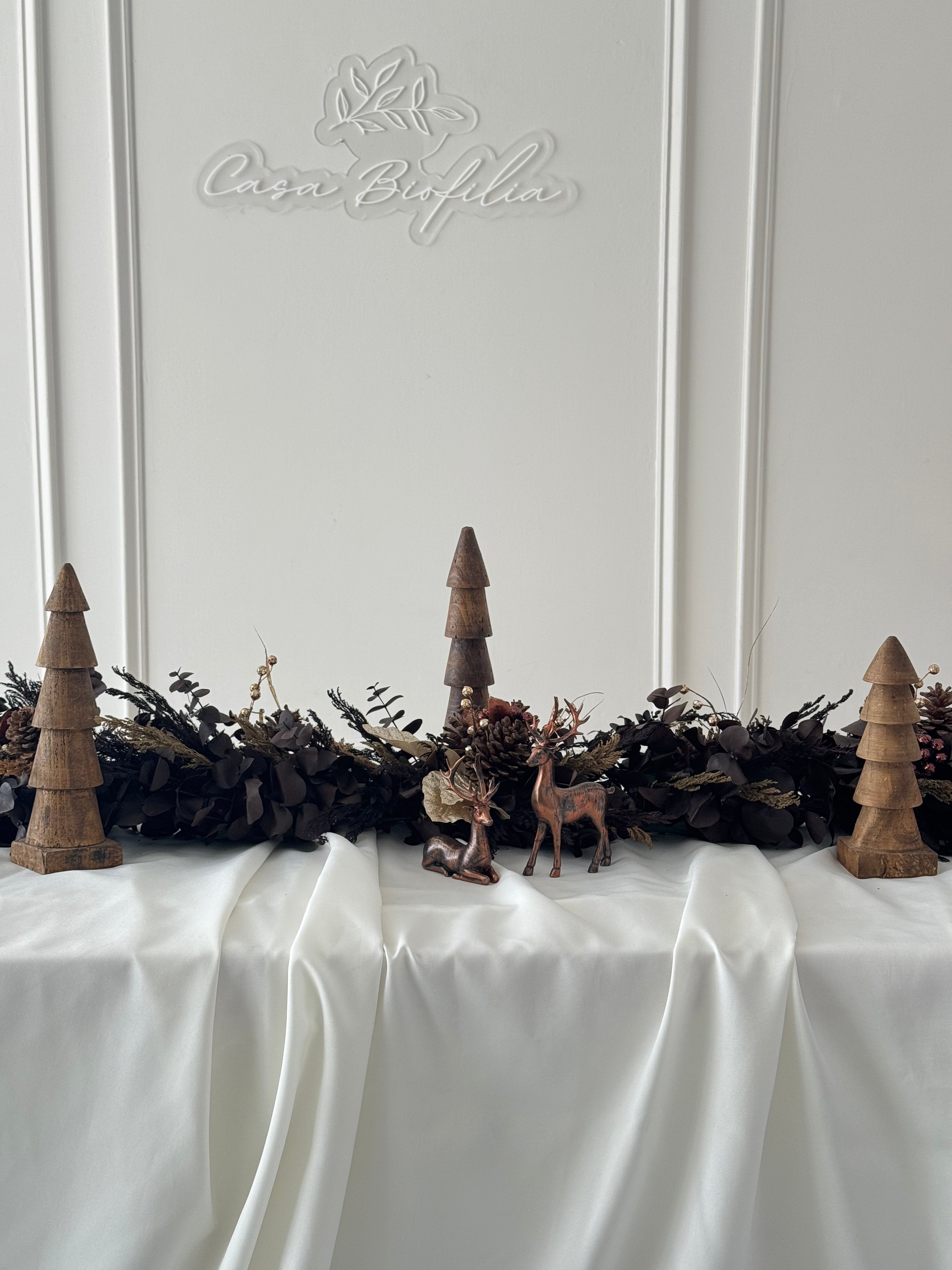 Aporta calidez y sofisticación a tu mesa con este camino de mesa flexible de 120 cm, elaborado con eucalipto preservado en tonos café y mocha, decorado con follajes, ornamentos dorados y piñas naturales.