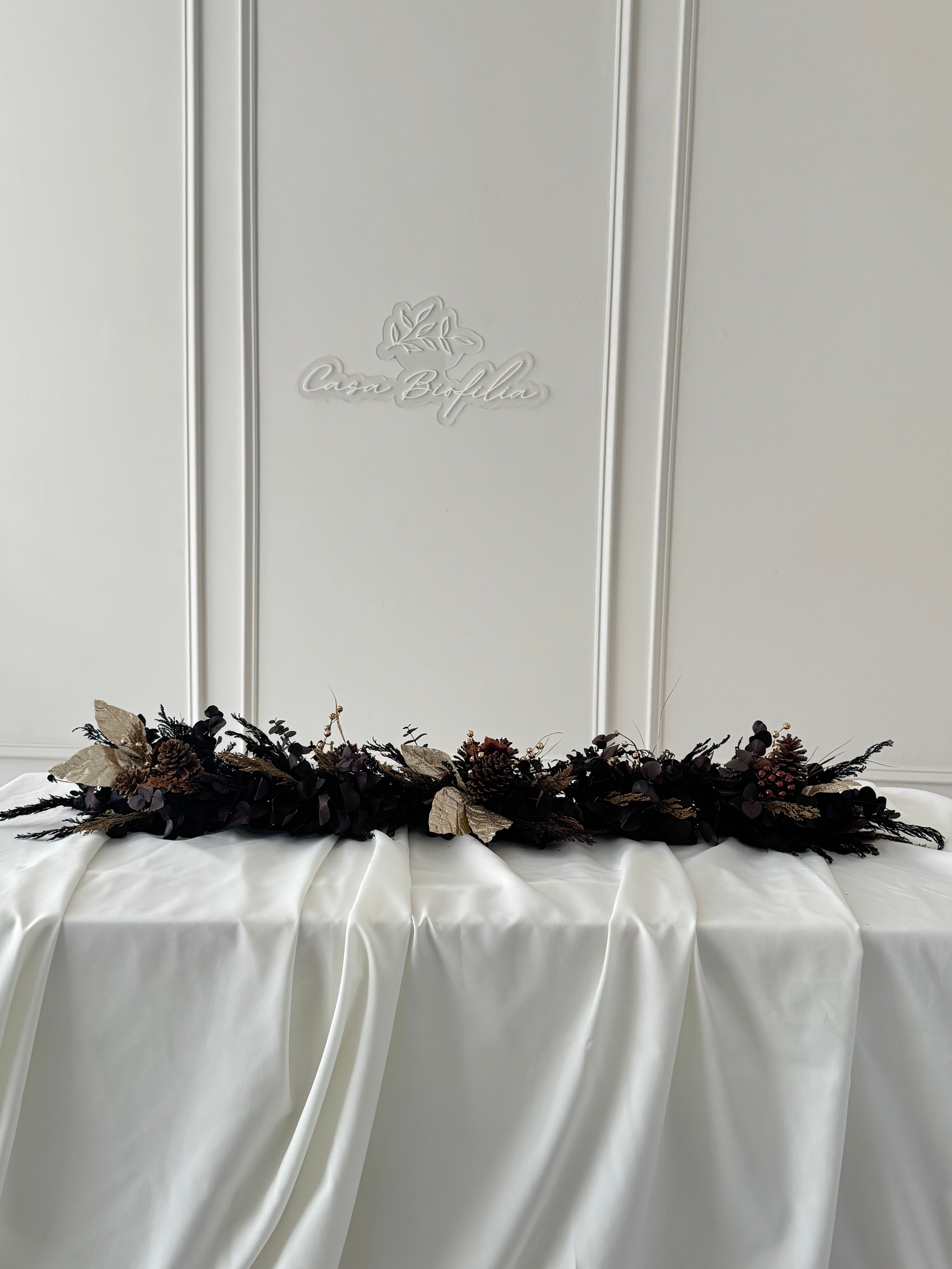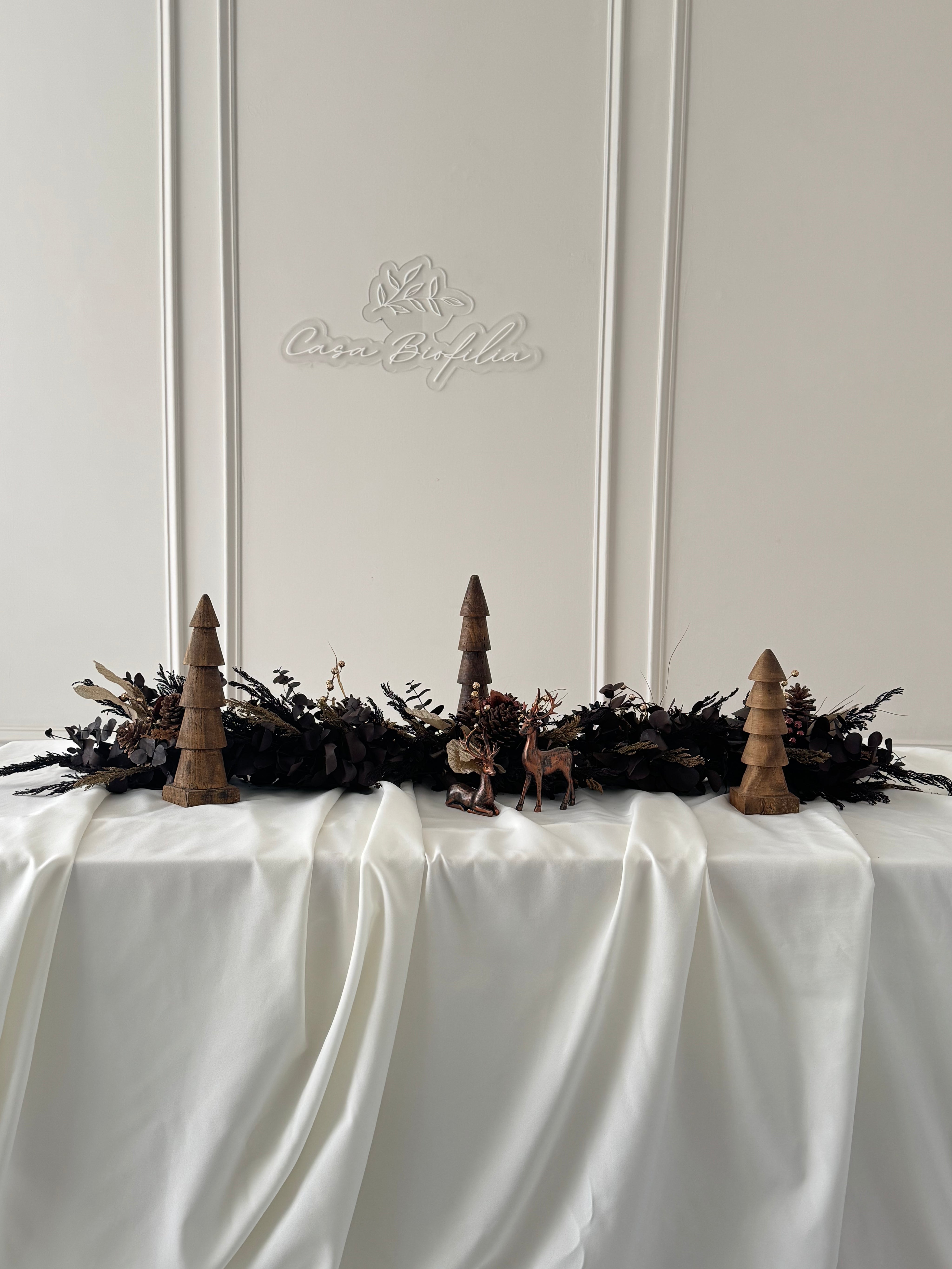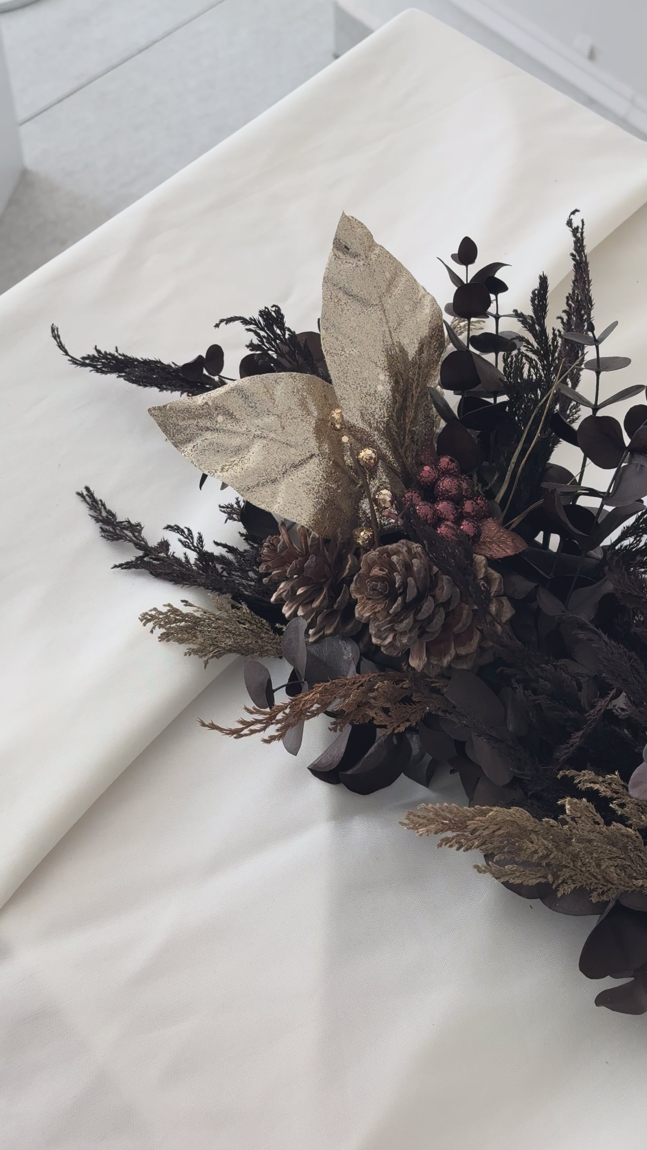 Aporta calidez y sofisticación a tu mesa con este camino de mesa flexible de 120 cm, elaborado con eucalipto preservado en tonos café y mocha, decorado con follajes, ornamentos dorados y piñas naturales.