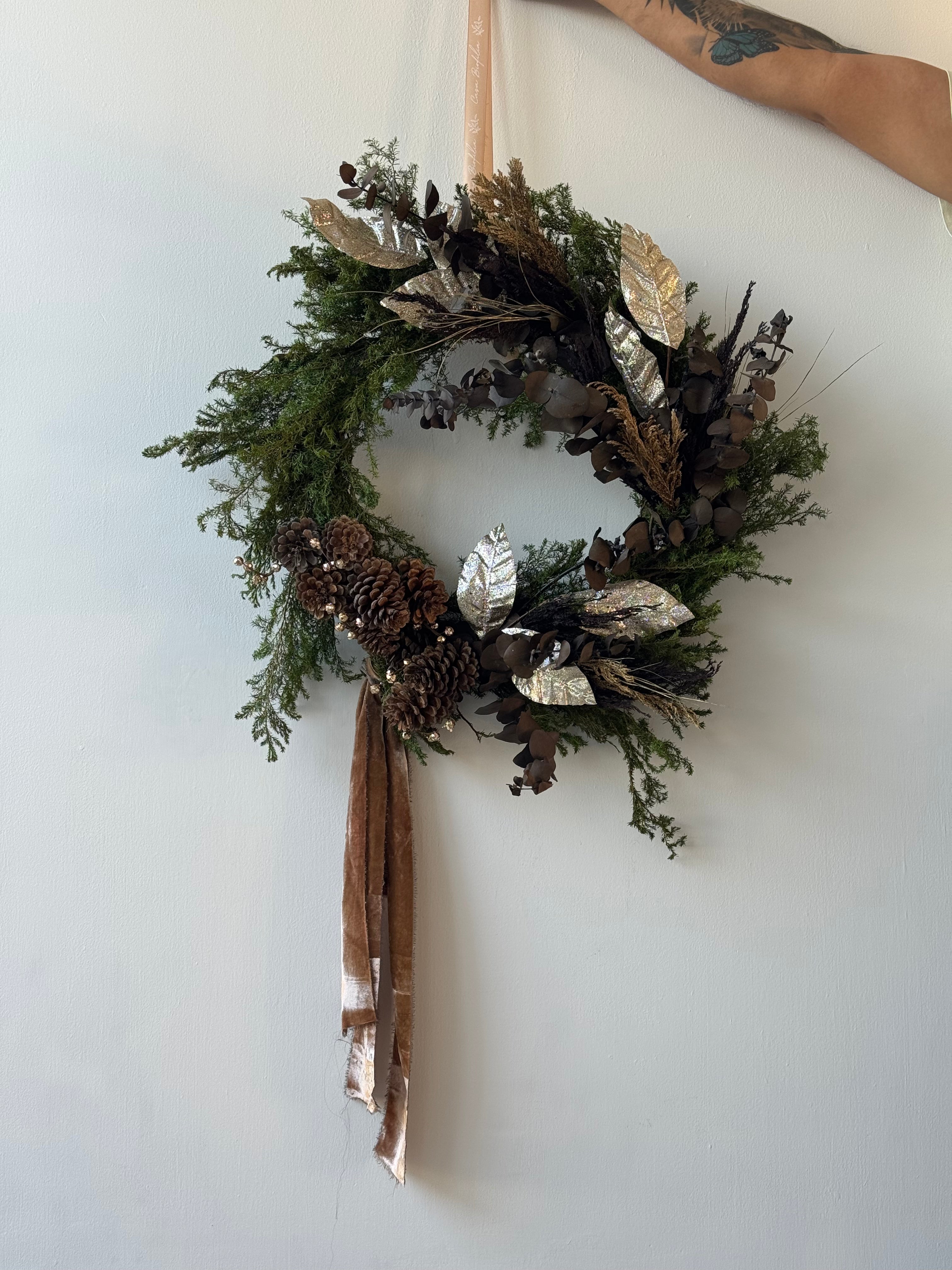 Lleva el espíritu navideño a tu hogar con nuestras coronas elaboradas en base de pino preservado, decoradas con delicados toques de eucalipto, follajes preservados y piñas, que aportan textura, frescura y esos aromas únicos de la Navidad. Cada pieza es cuidadosamente trabajada a mano, combinando materiales auténticos y duraderos que transmiten calidez y elegancia natural.