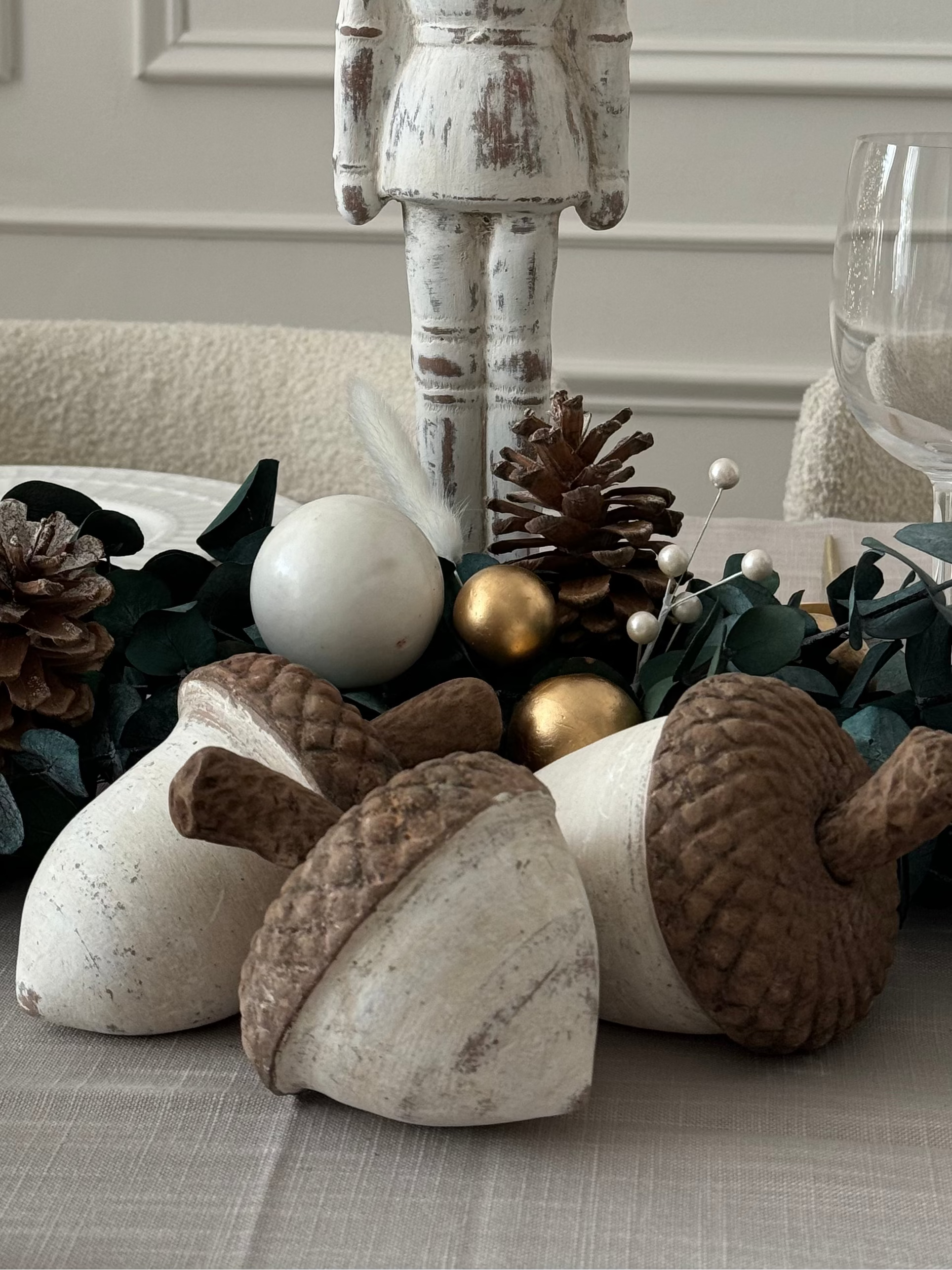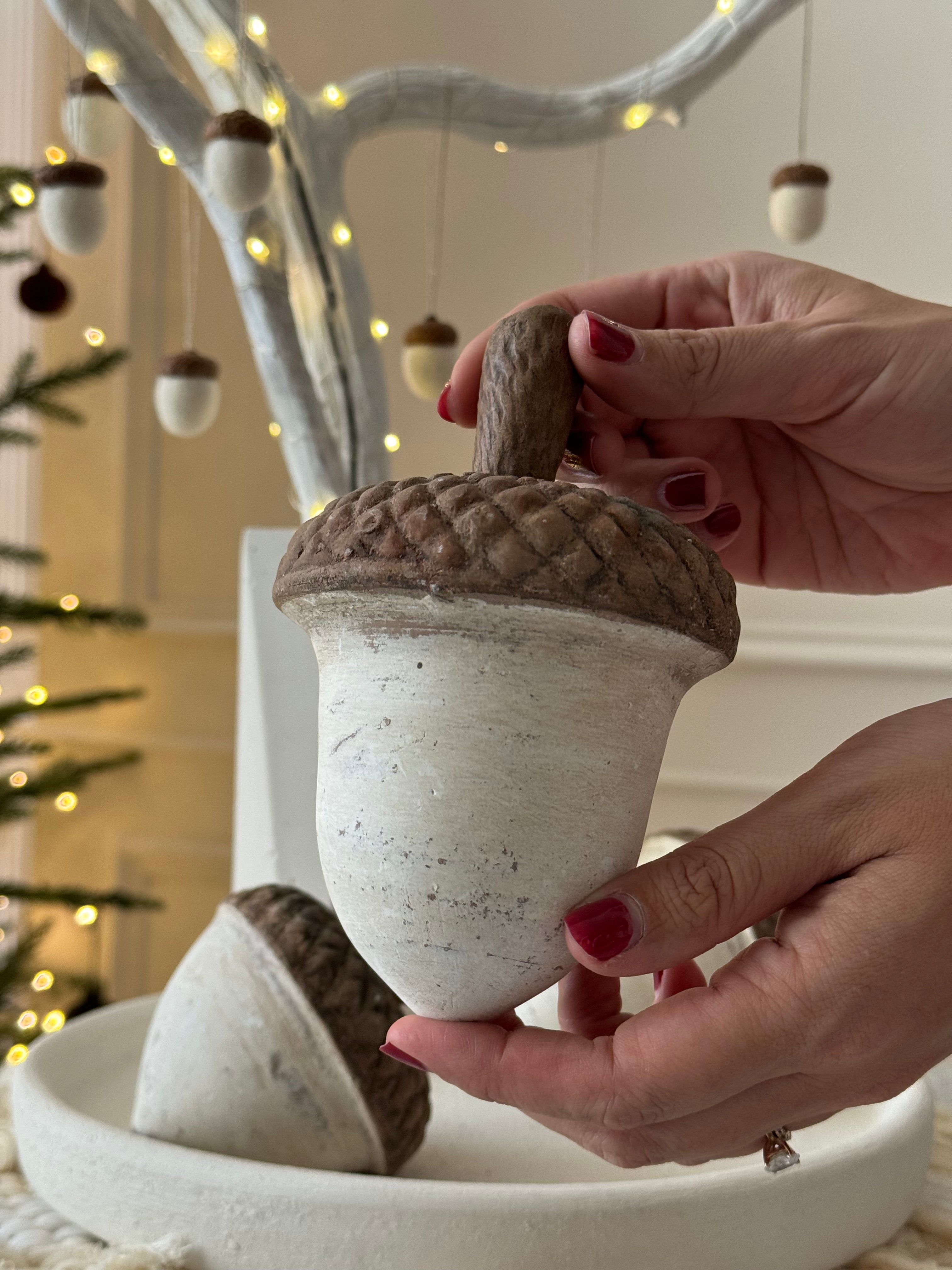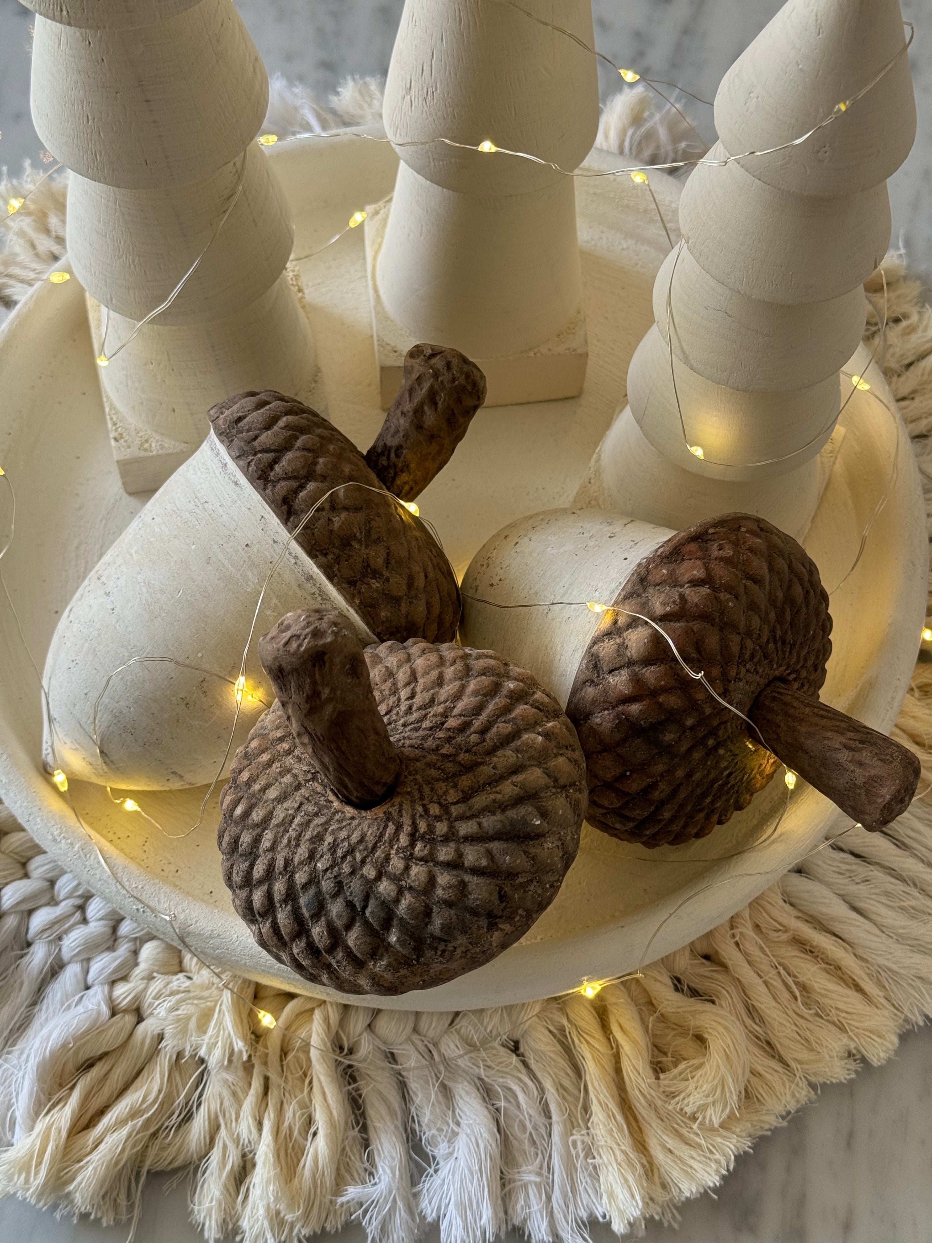 Este set de tres bellotas mini de barro artesanal, de 16×10 cm, 14×10 cm y 12×10 cm, está elaborado a mano, mostrando la textura natural del barro y los detalles únicos de cada pieza.