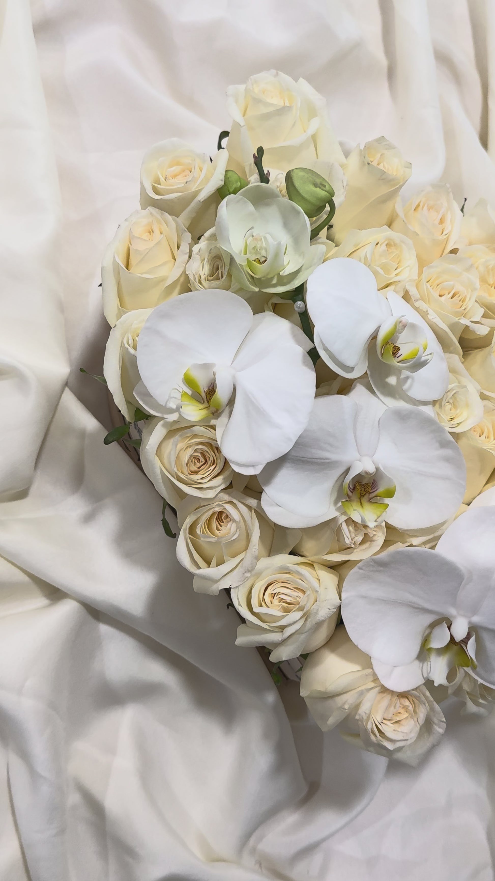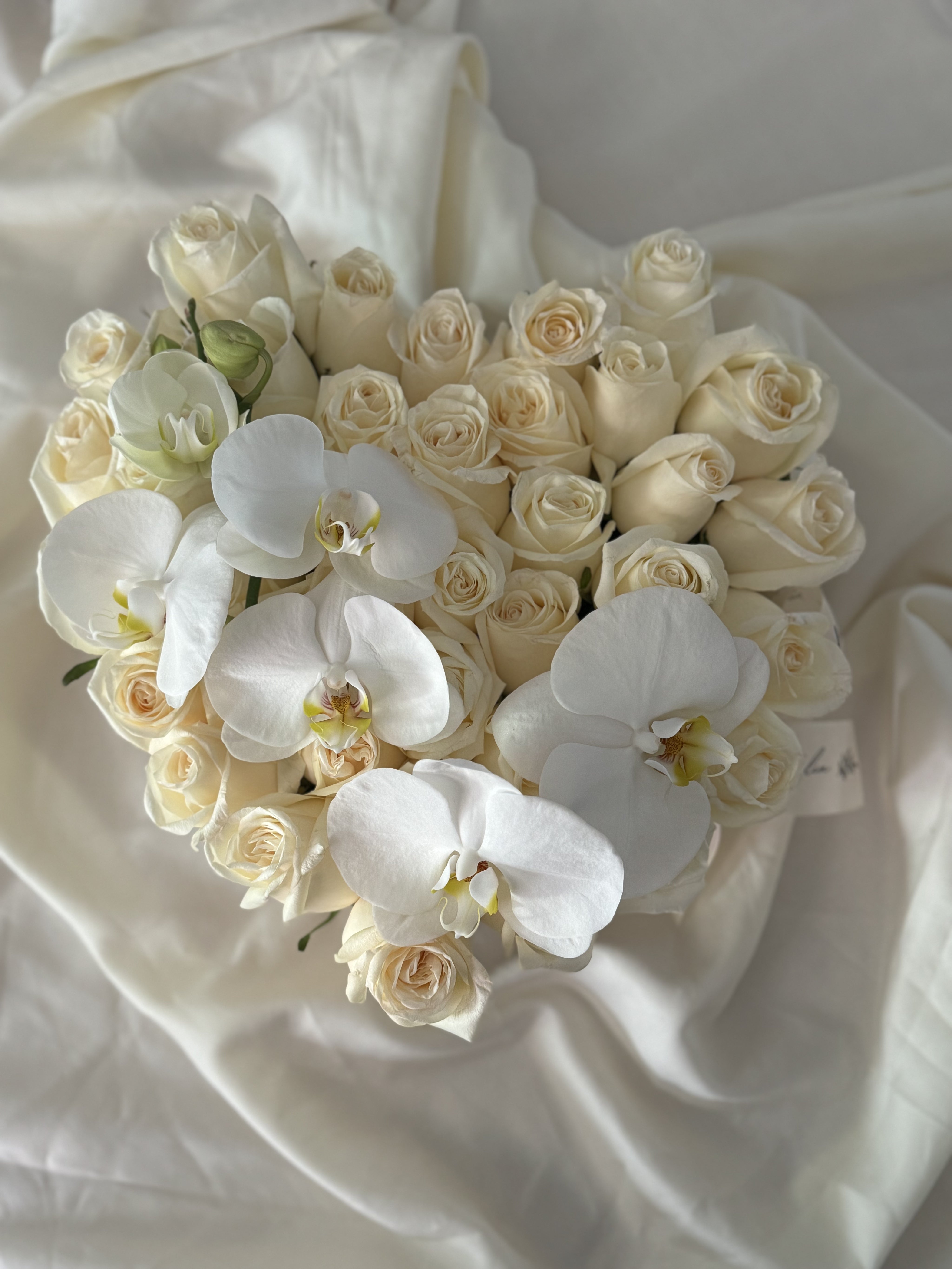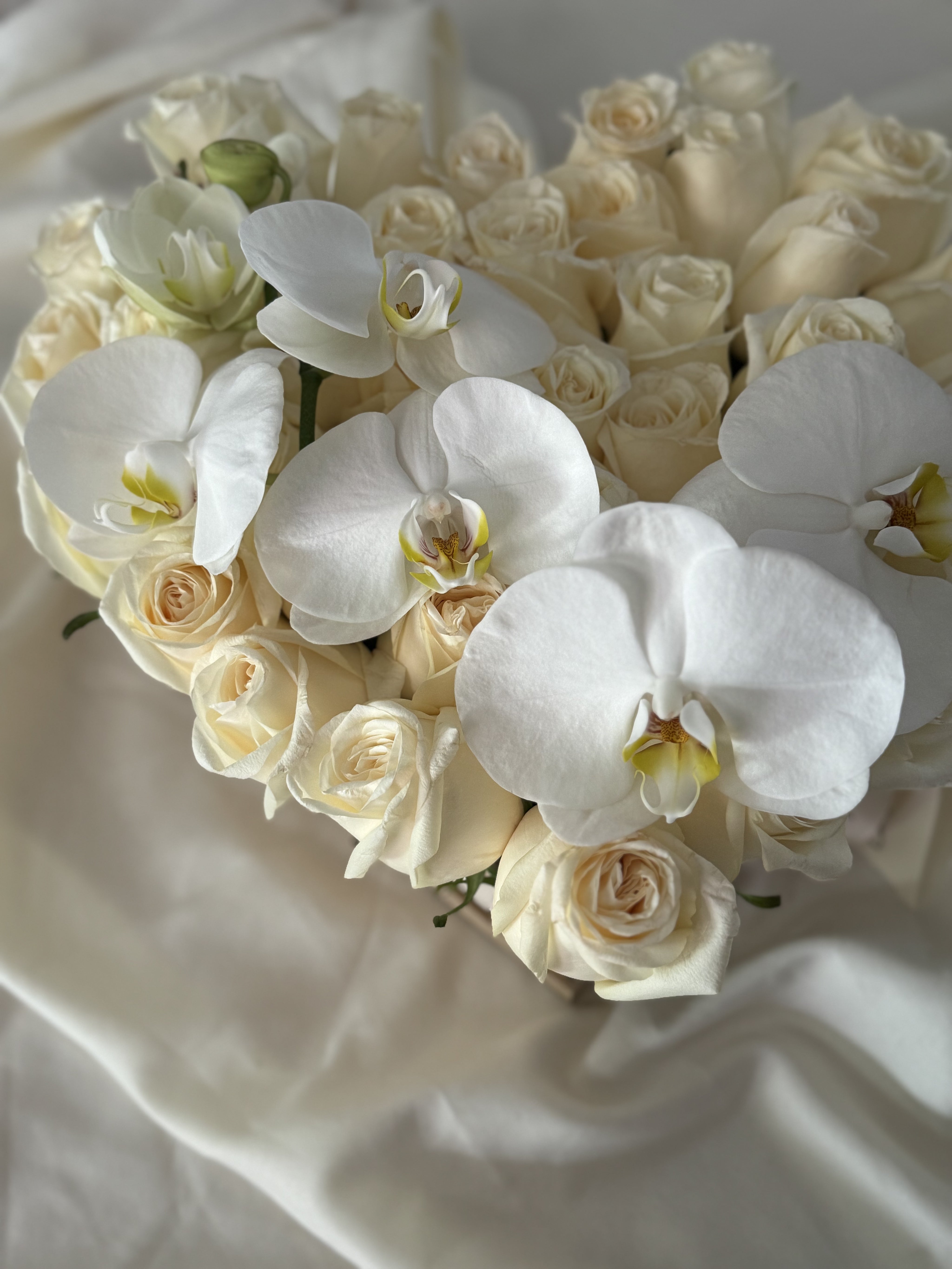 Caja en forma de corazón con rosas y orquídeas blancas, un detalle puro y delicado, creado para provocar un suspiro y dar un apapacho al corazón.
