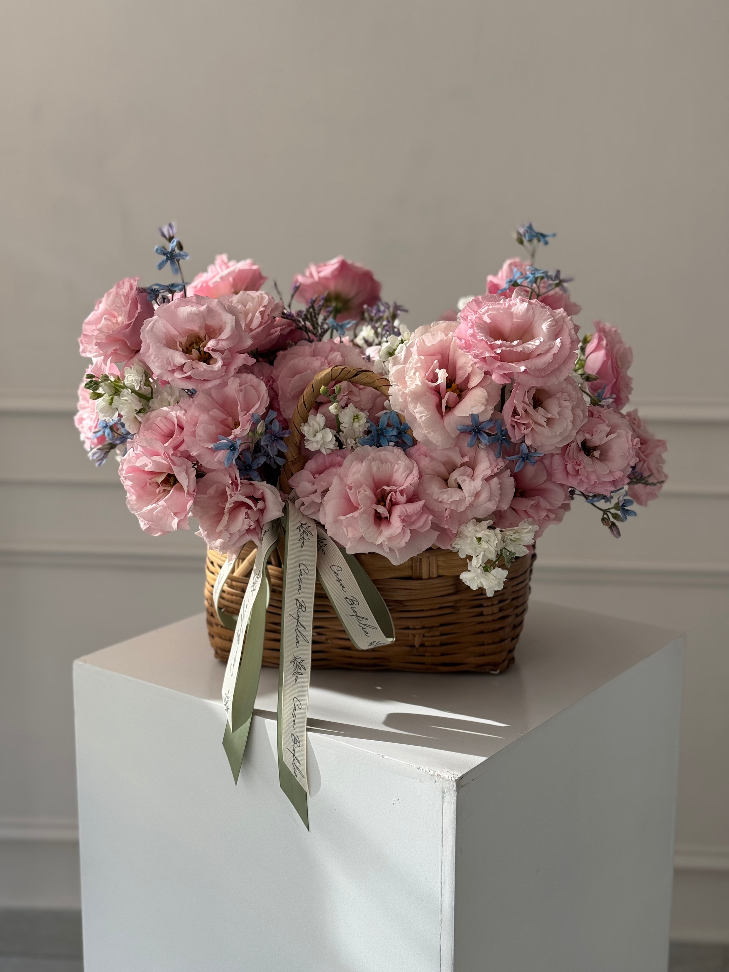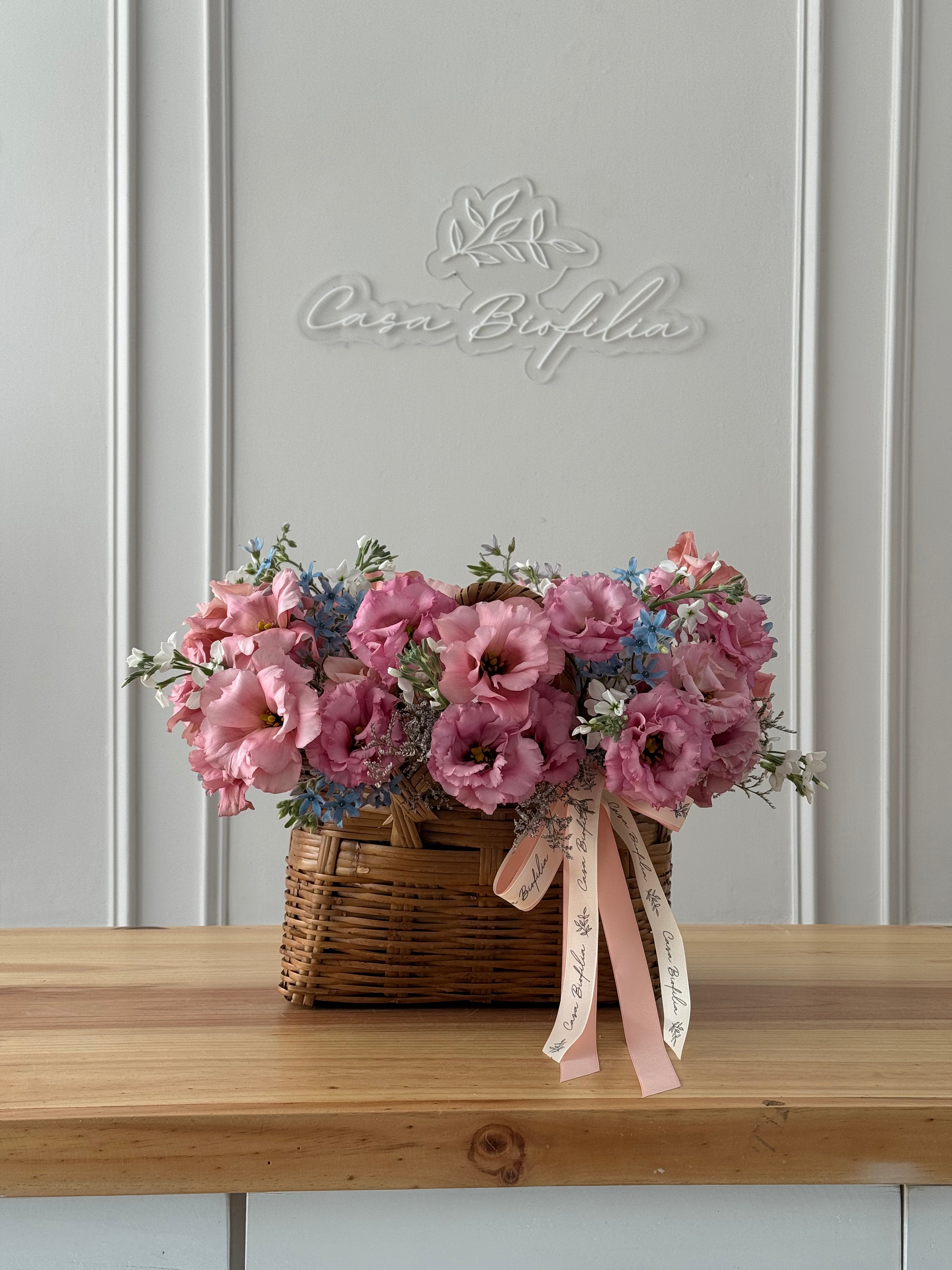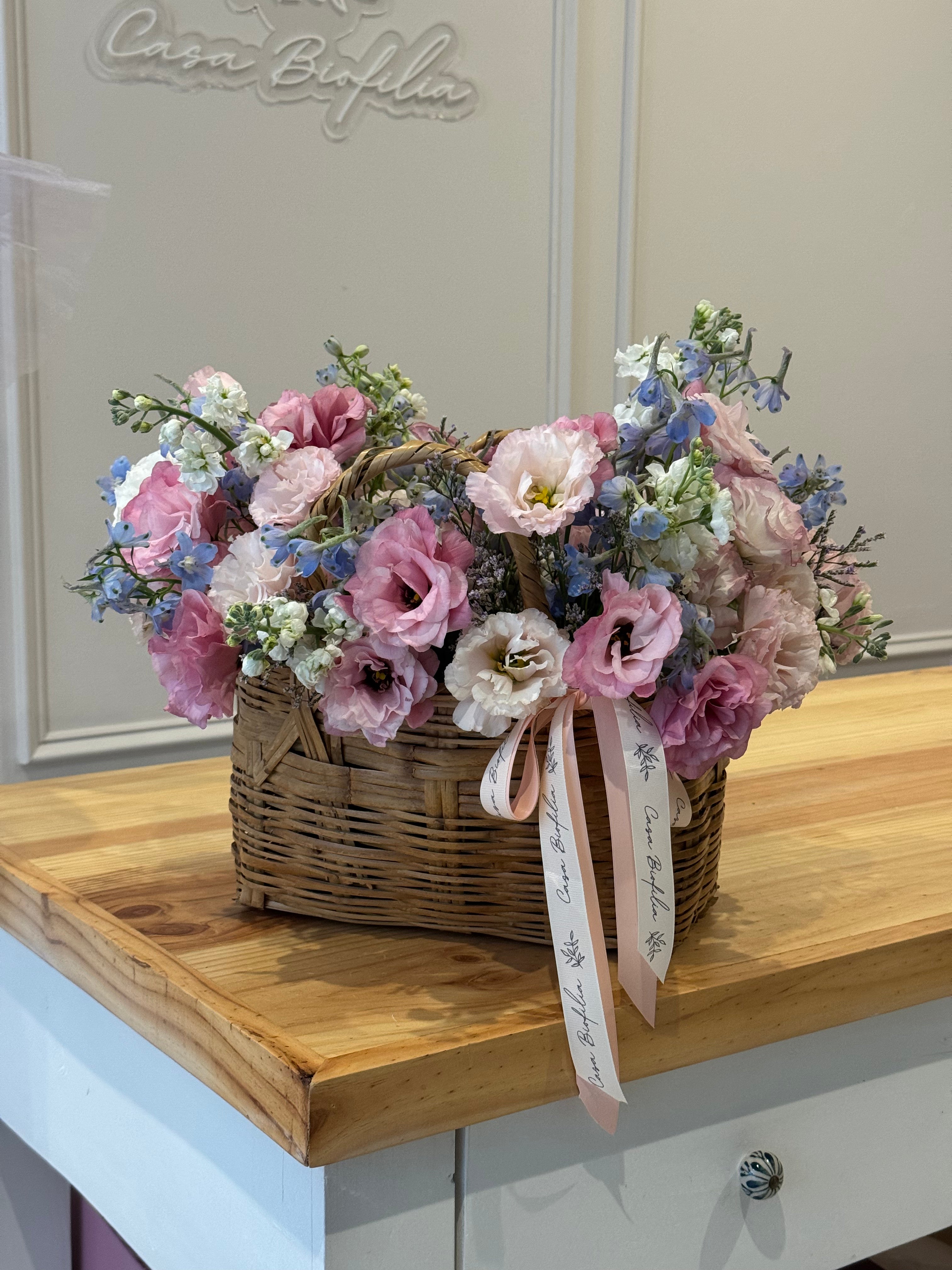 Este arreglo de canasta con lisianthus, matiola, limonium y delicada tweedia, es ideal para enamorar con un detalle suave y lleno de belleza.