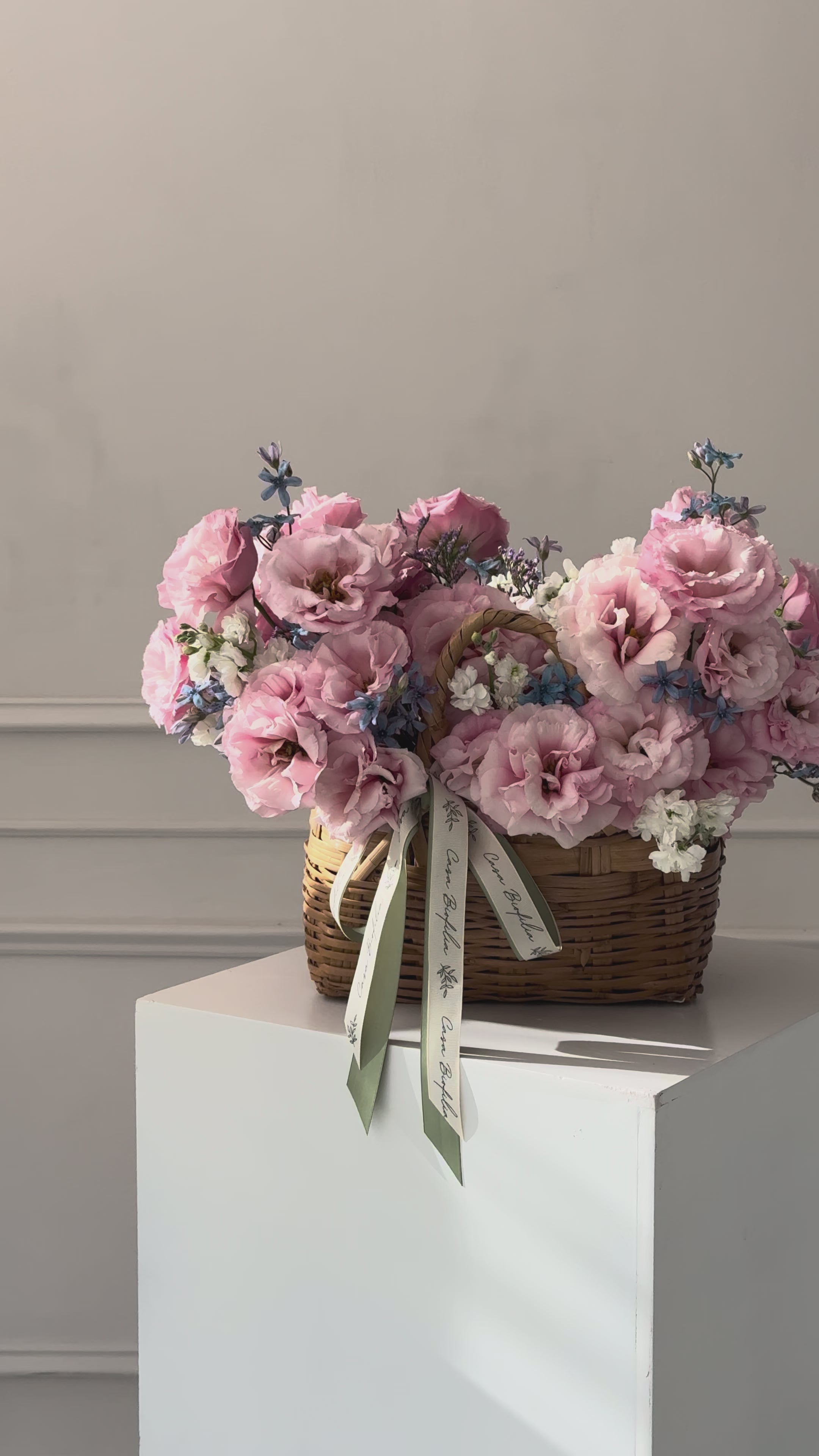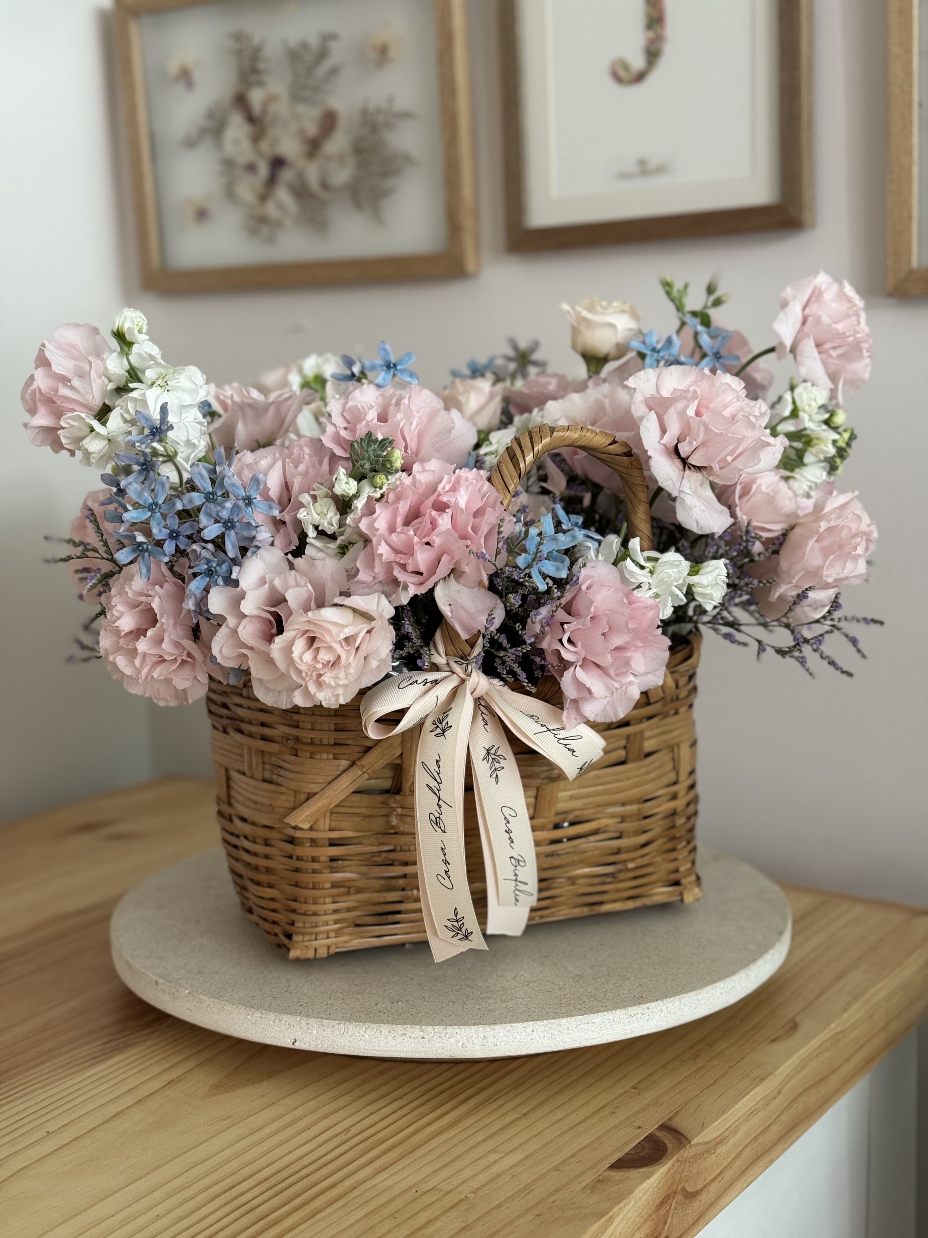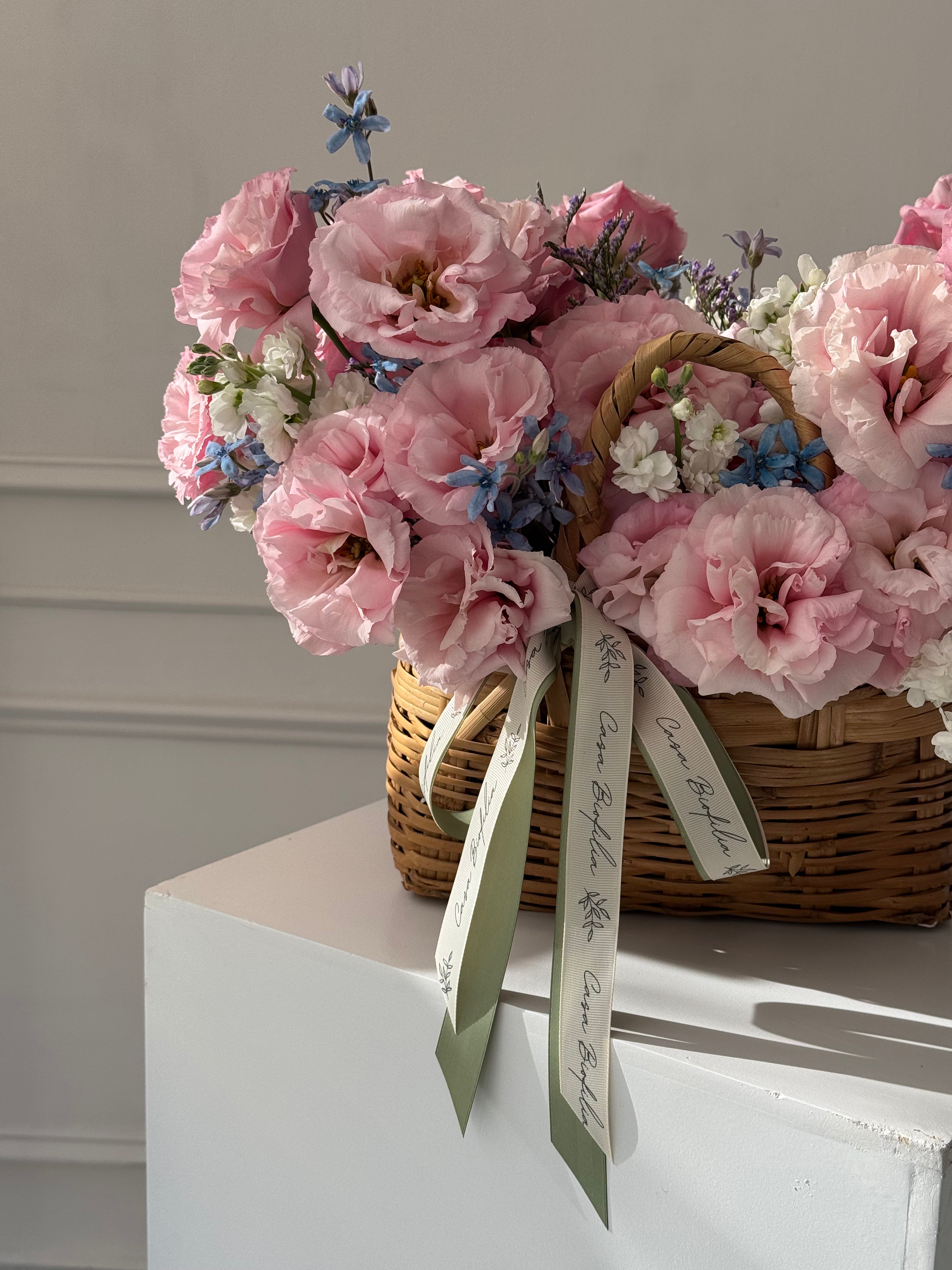 Este arreglo de canasta con lisianthus, matiola, limonium y delicada tweedia, es ideal para enamorar con un detalle suave y lleno de belleza.