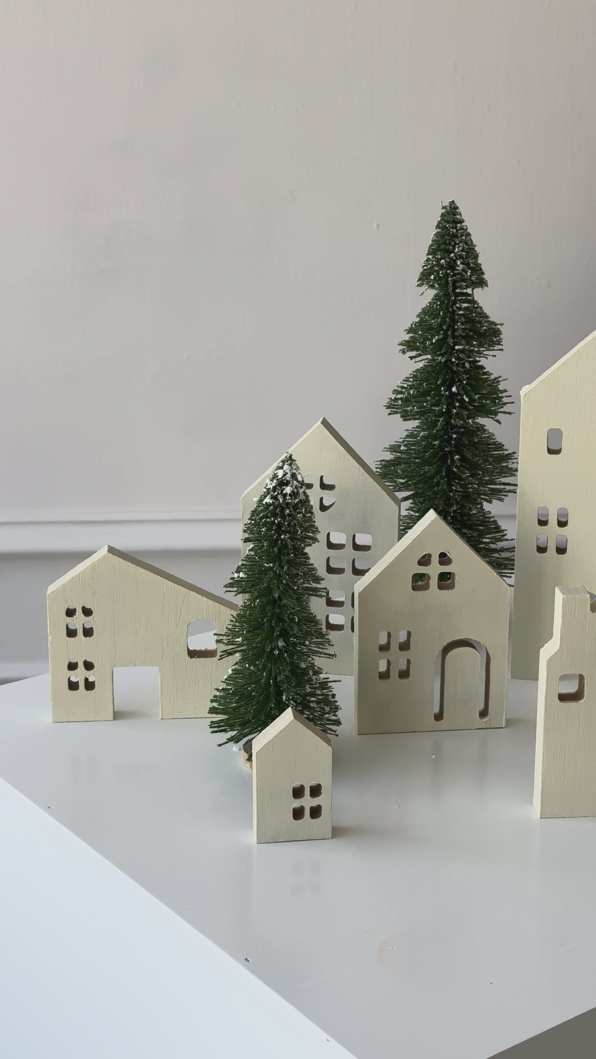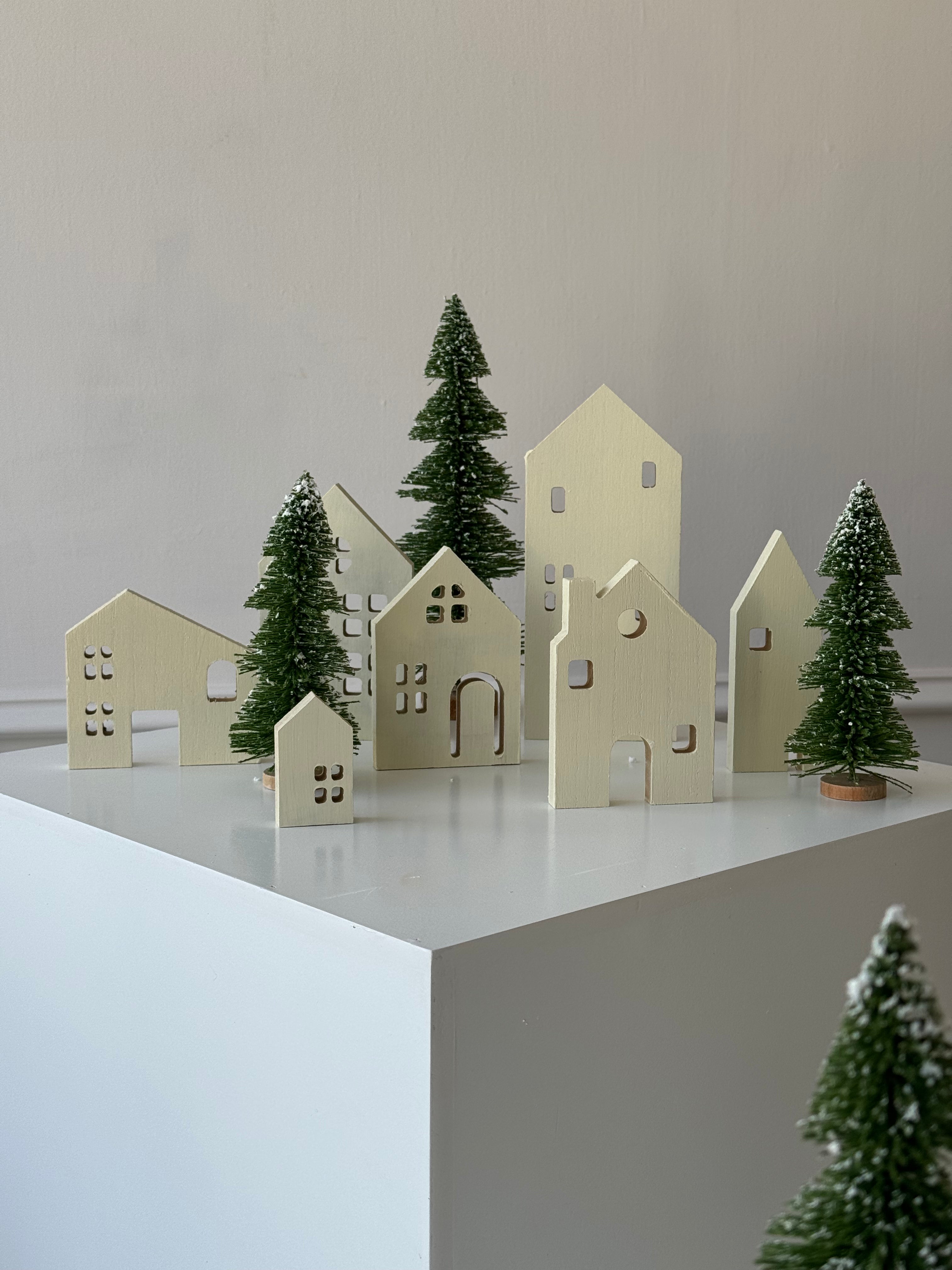 Dale un toque cálido y moderno a tu decoración navideña con esta villa minimalista de 7 casitas en madera.